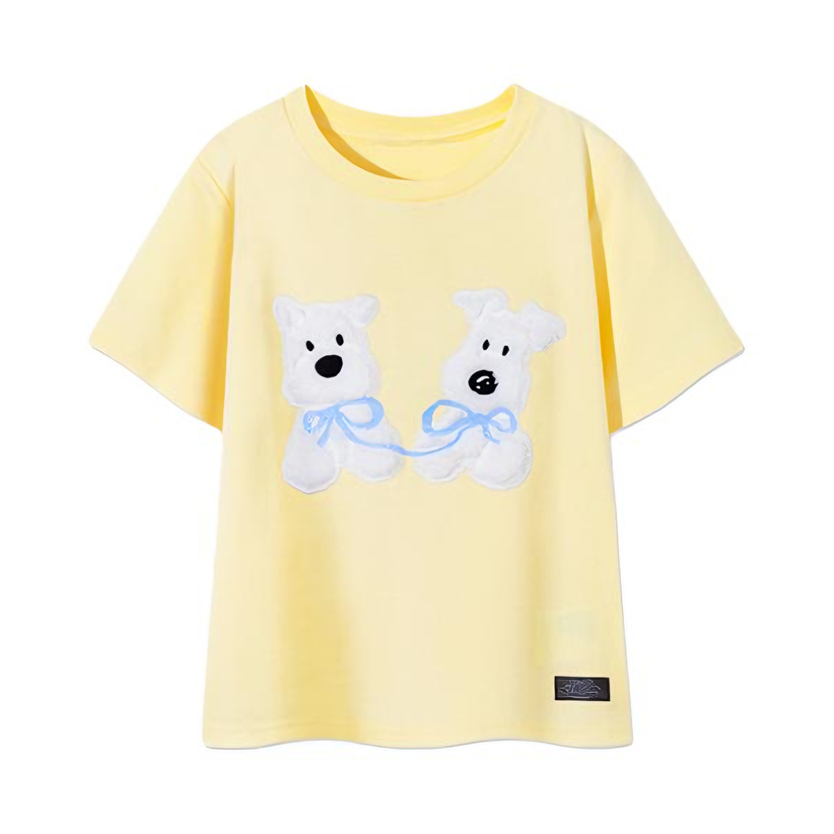 本篇笔记关联了【穆祉丞同款】PSO Brand 假两件修身圆领正肩贴布绣图案针织蝴蝶结小狗短袖T恤 TKA126 奶油黄等商品,为用户提供真实的使用体验和购买参考。