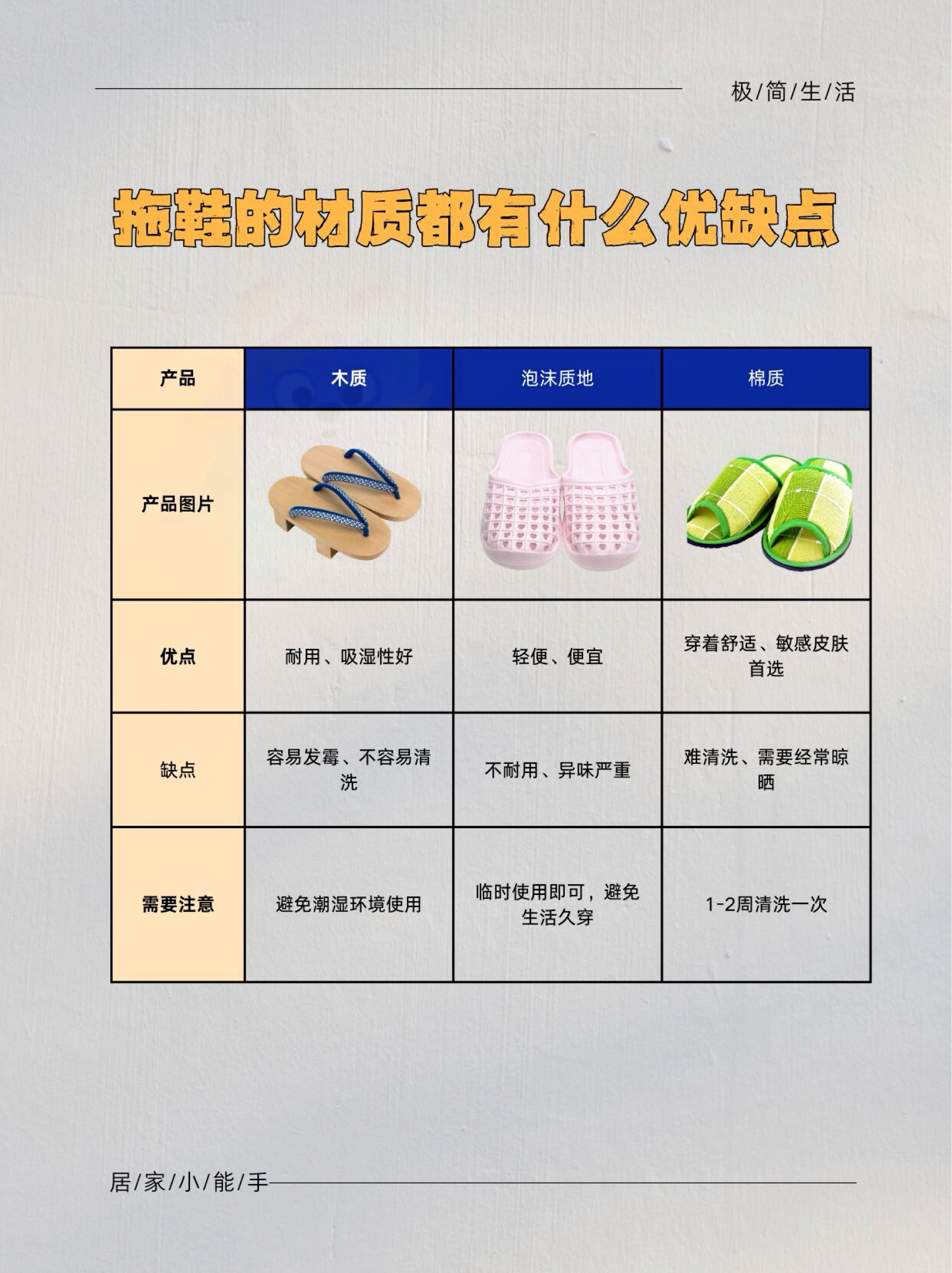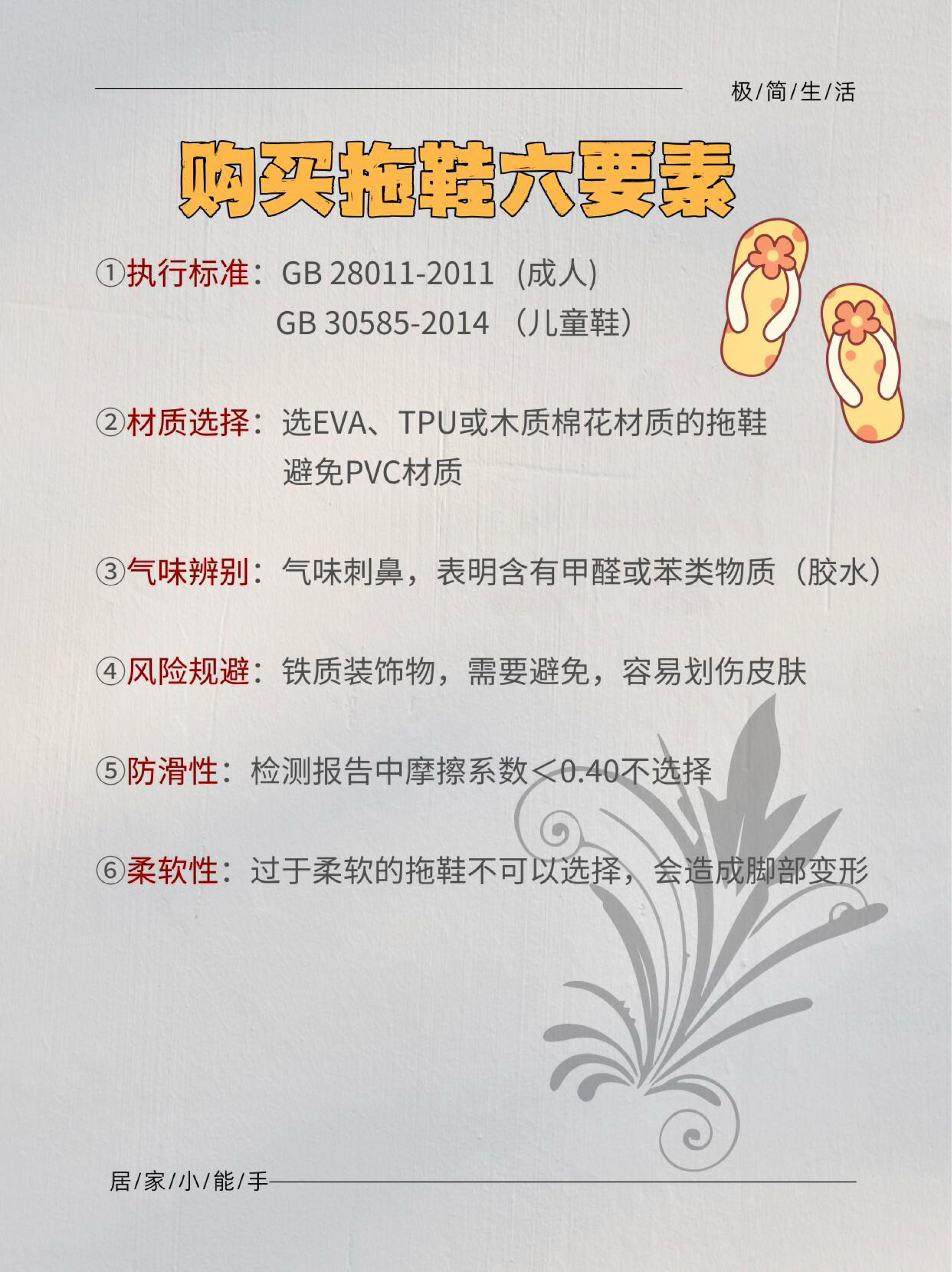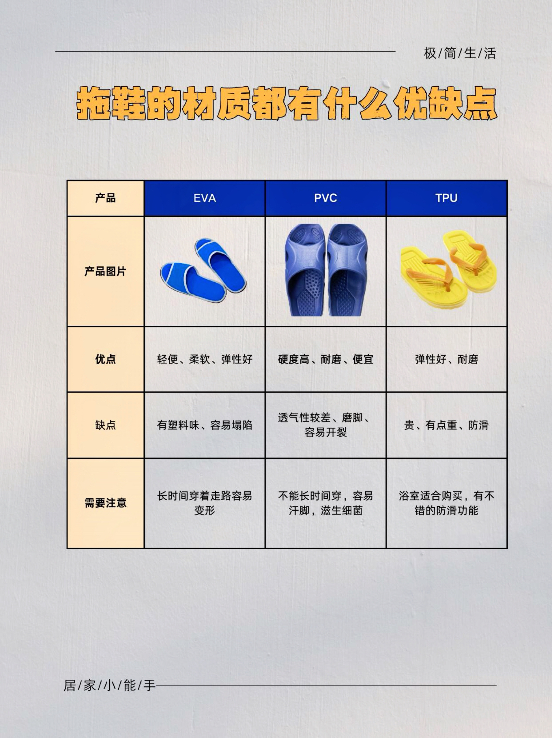 拖鞋挑选指南来啦! 以市面上的主流材质拖鞋为例: EVA材质拖鞋 PVC材质拖鞋 TPR材质拖鞋 橡胶材质拖鞋 布料材质拖鞋 防滑拖鞋: PVC>橡胶>亚麻>天然皮革> TPR > EVA 防臭拖鞋: 布料>EVA>橡胶>PVC>TPR>天然皮革 定期更换 建议6个月左右更换一次凉拖鞋。 具体时间可以根据个人的使用频率和鞋子的磨损情况来定。