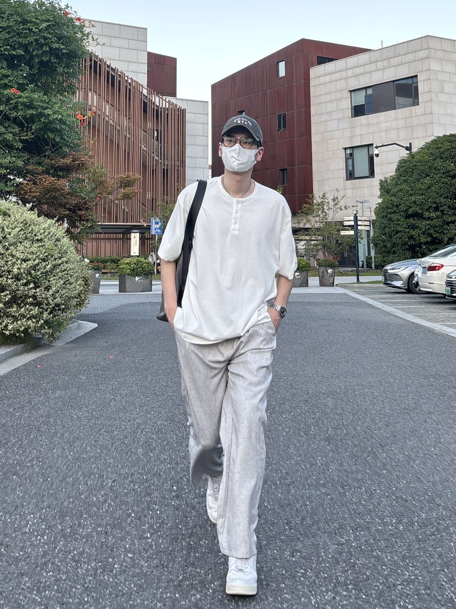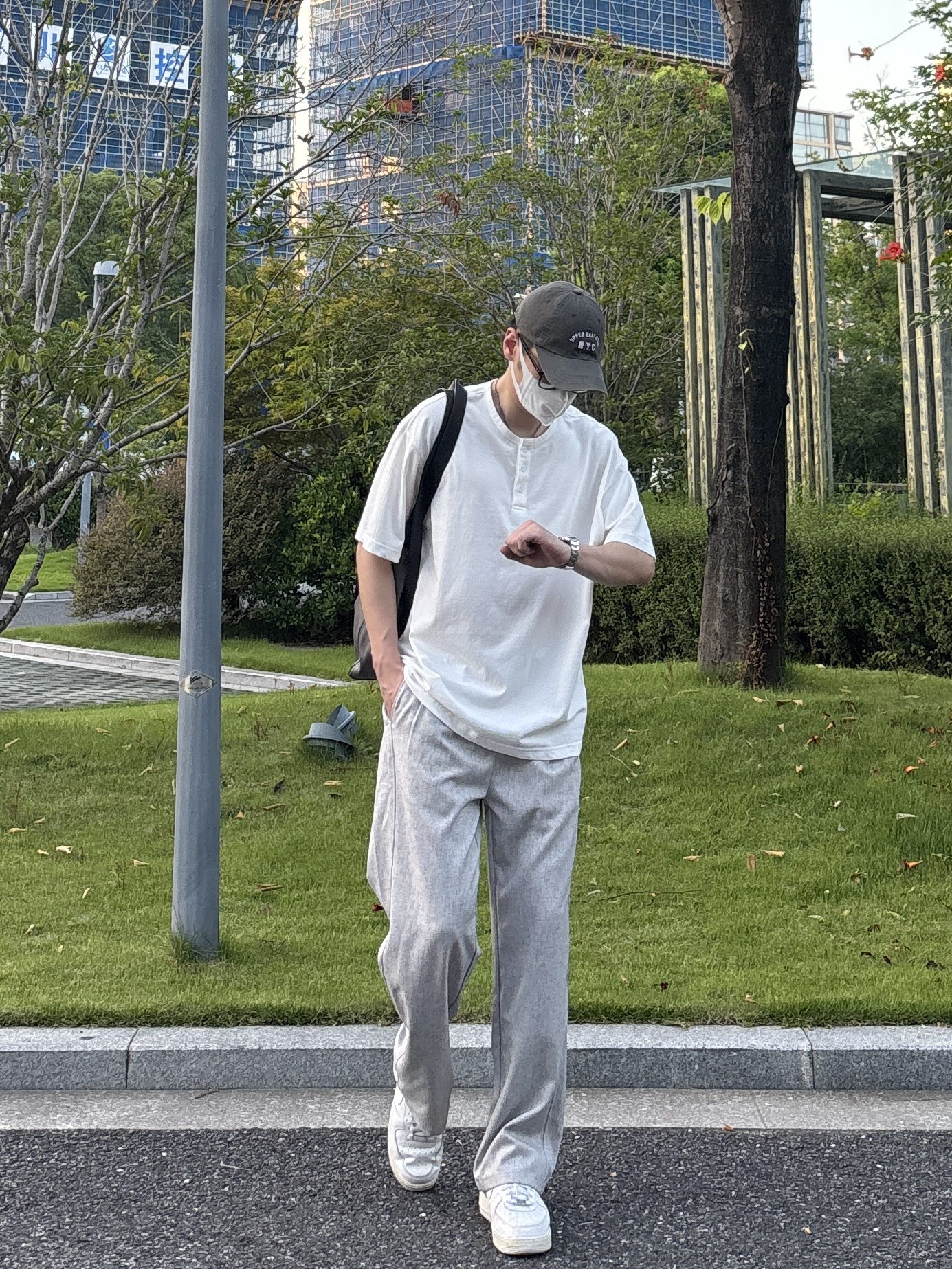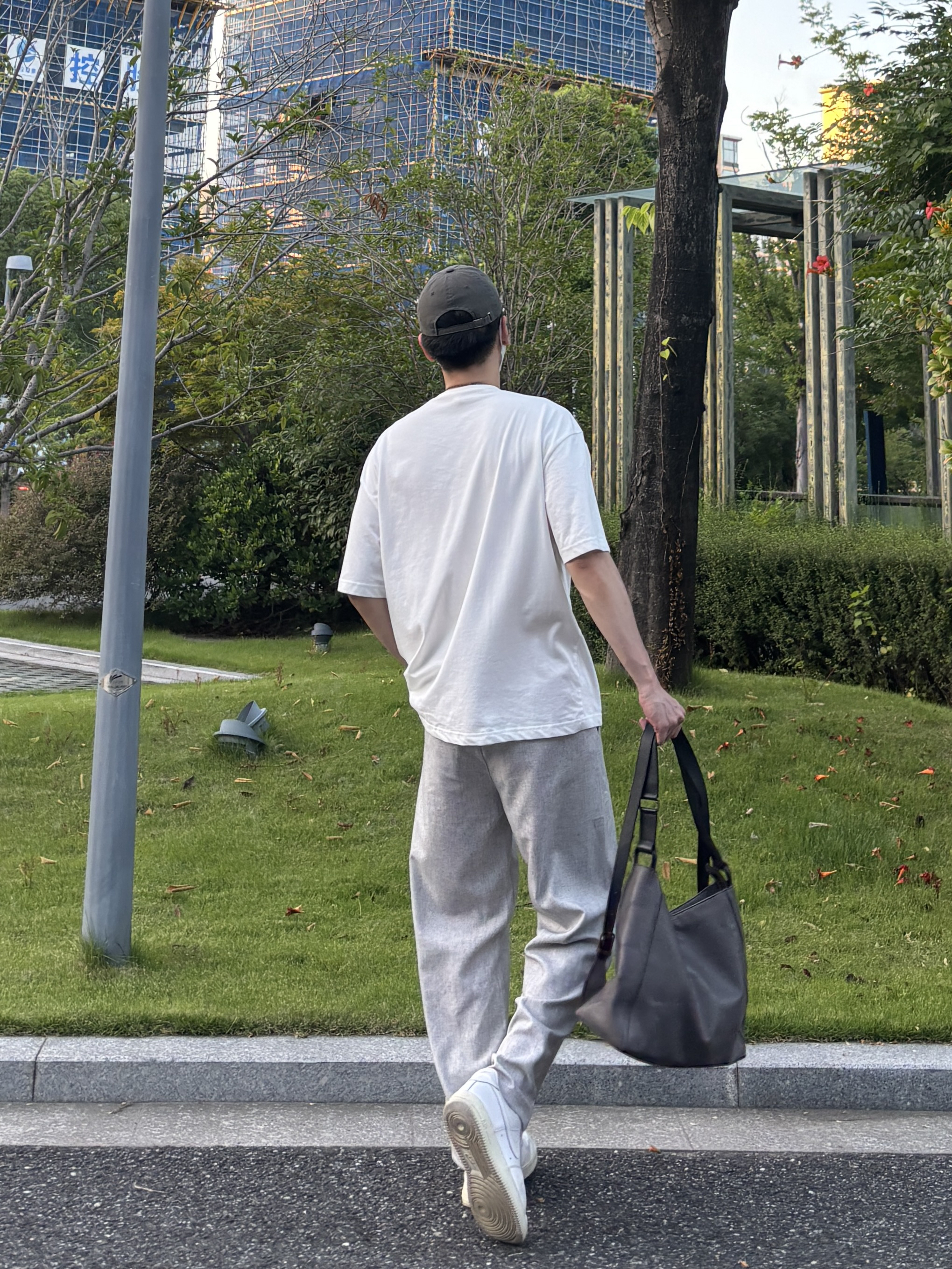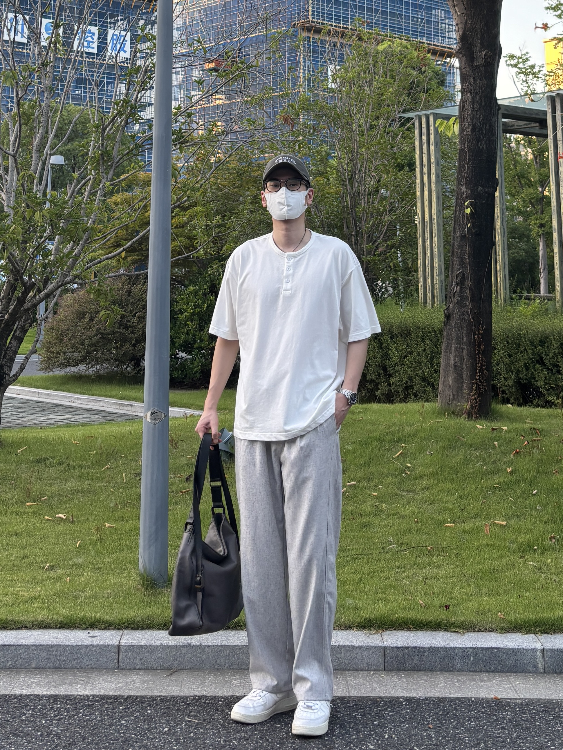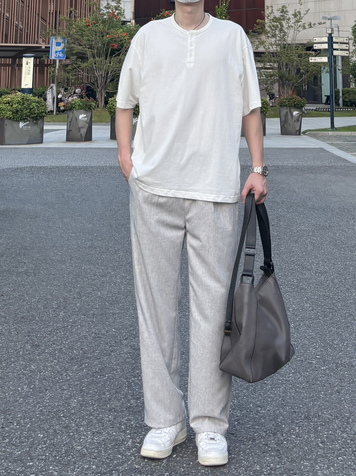 今天这套上衣穿了一件清爽干净的白色宽松阔版亨利领纽扣短袖 ⬇️ 裤子选择轻薄透气的灰色直筒垂感亚麻休闲裤 ⬇️ 鞋子上脚经典百搭的纯白色af1 ⬇️ 最后拿一个大容量深灰色皮质托特包点缀下整体穿搭 - 今日搭配 衣服裤子:NICE LILI 鞋子:AF1纯白