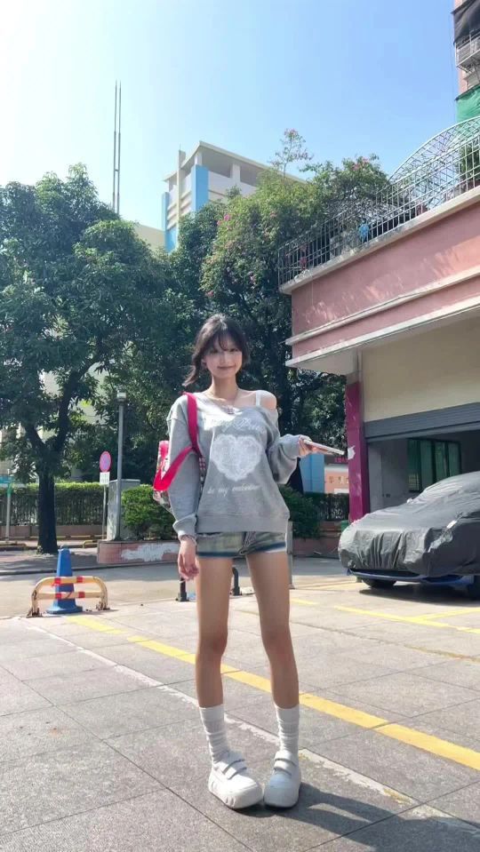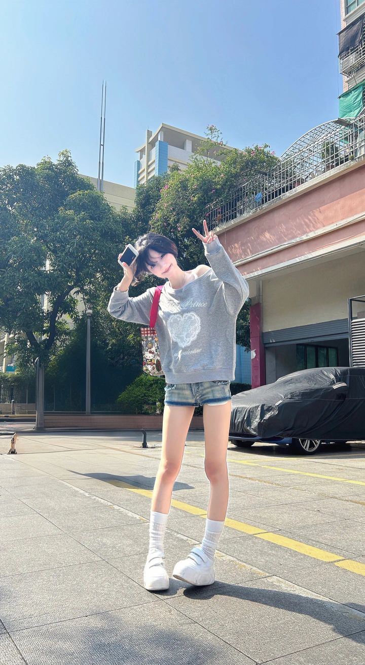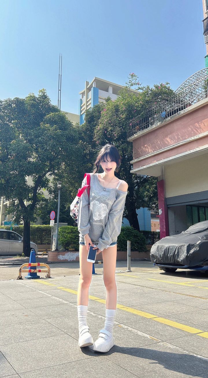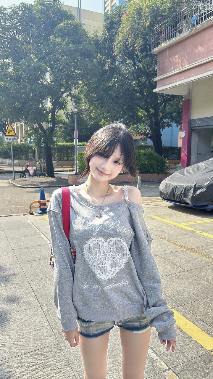 先看看上装,一件灰色的露肩卫衣绝对是这套穿搭的亮点之一。灰色本身就自带高级感,低调又不失质感。而露肩的设计更是巧妙,打破了常规卫衣的单调,不经意间露出精致的锁骨,为整体造型增添了几分小性感。胸前的心形图案,像是藏在心底的浪漫小心思,瞬间让卫衣有了甜美的灵魂。这样的卫衣,无论是单穿还是搭配小吊带,都能展现出独特的个性。