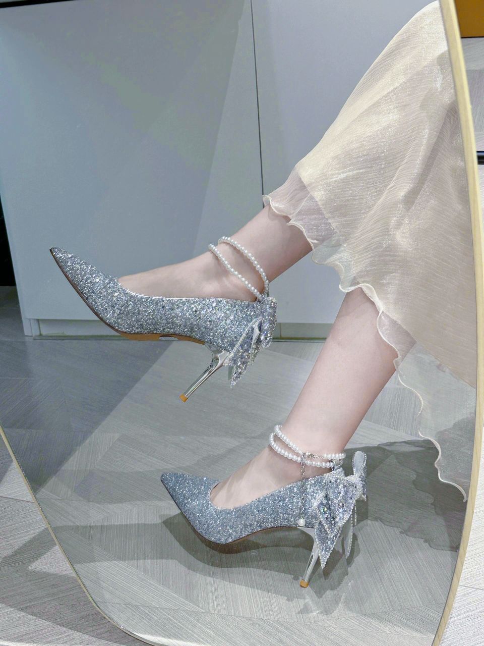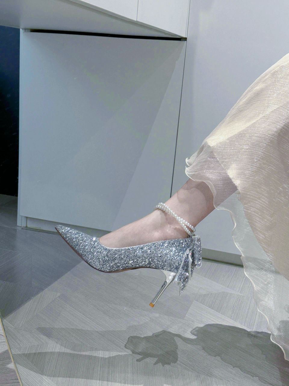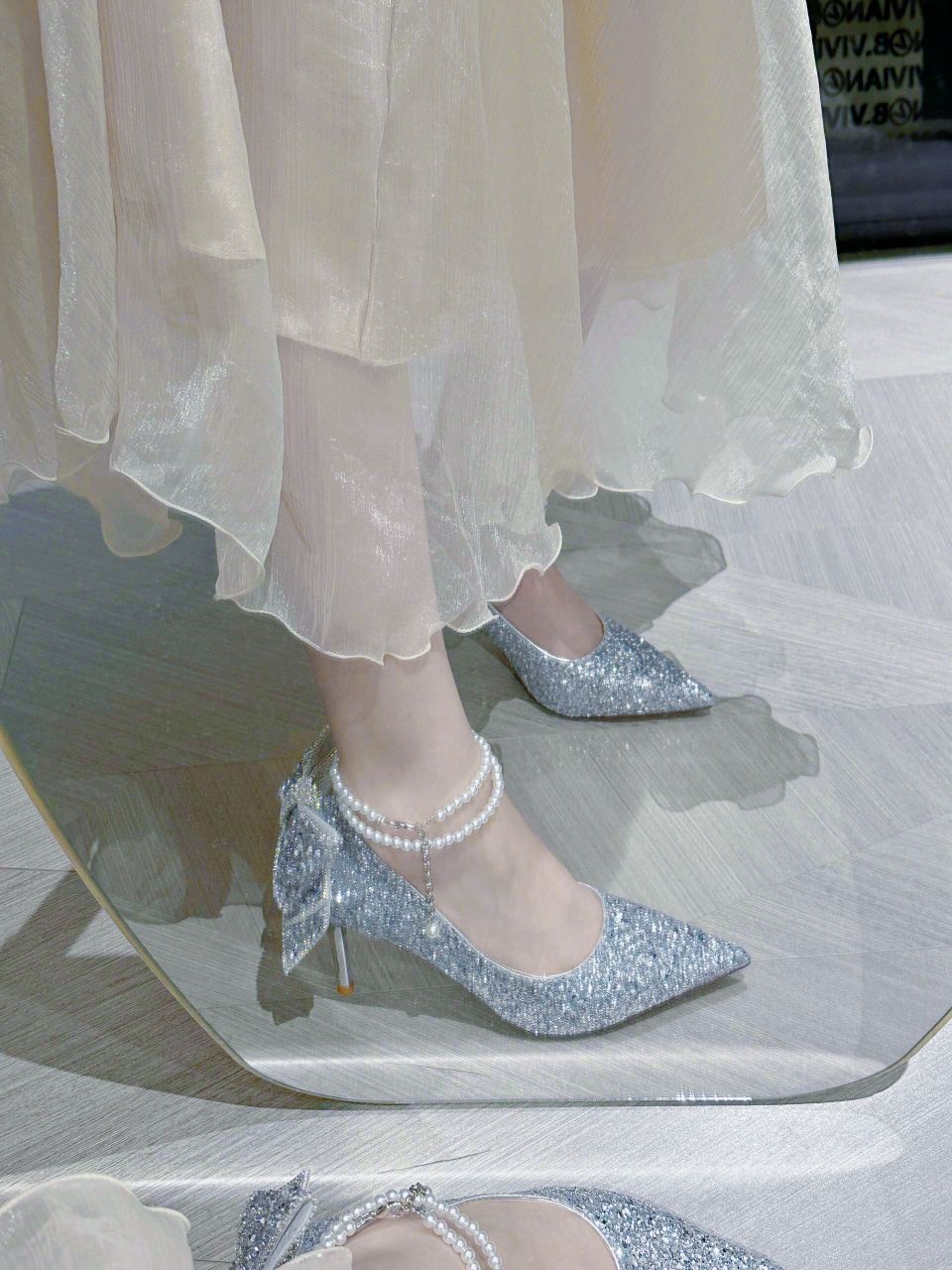 水晶蝴蝶结珍珠鞋|闪得刚好的温柔款 这双高跟鞋细节做得挺用心,蝴蝶结后跟立体有型,不是软塌塌的样子,珍珠串得规整,摸起来滑溜细腻。 鞋身的亮片像撒了层细钻,光线下折射的光泽顺着鞋型淌动,走路时带点细碎的闪,不晃眼却很吸睛。 鞋跟高度适中,日常穿去约会或小聚,搭小裙子不违和。珍珠沿边缀着,添了点柔劲儿,不会太张扬。 优点是设计精致,闪得刚好不浮夸,适合想带点小心机的场合。小不足是亮片...