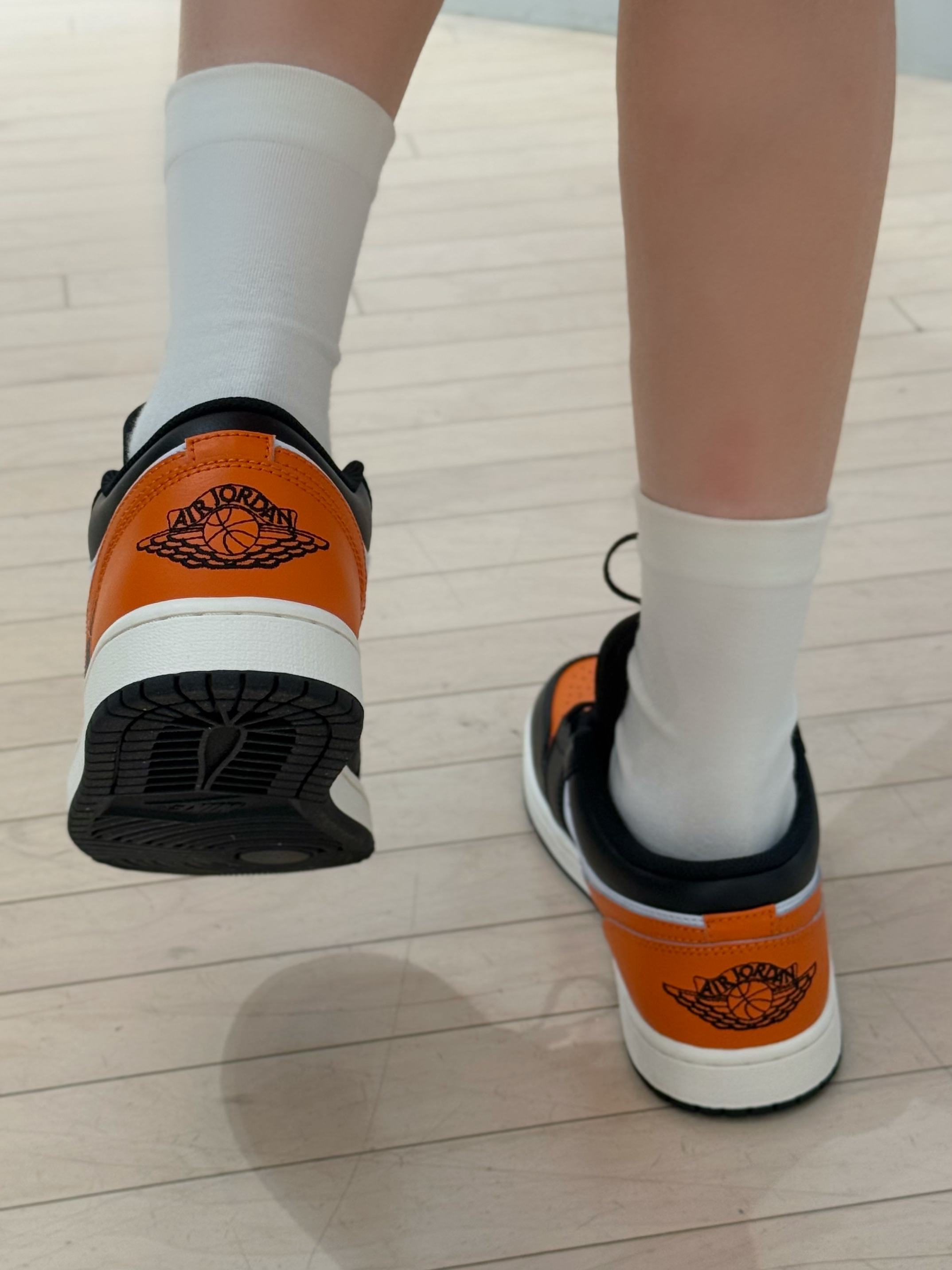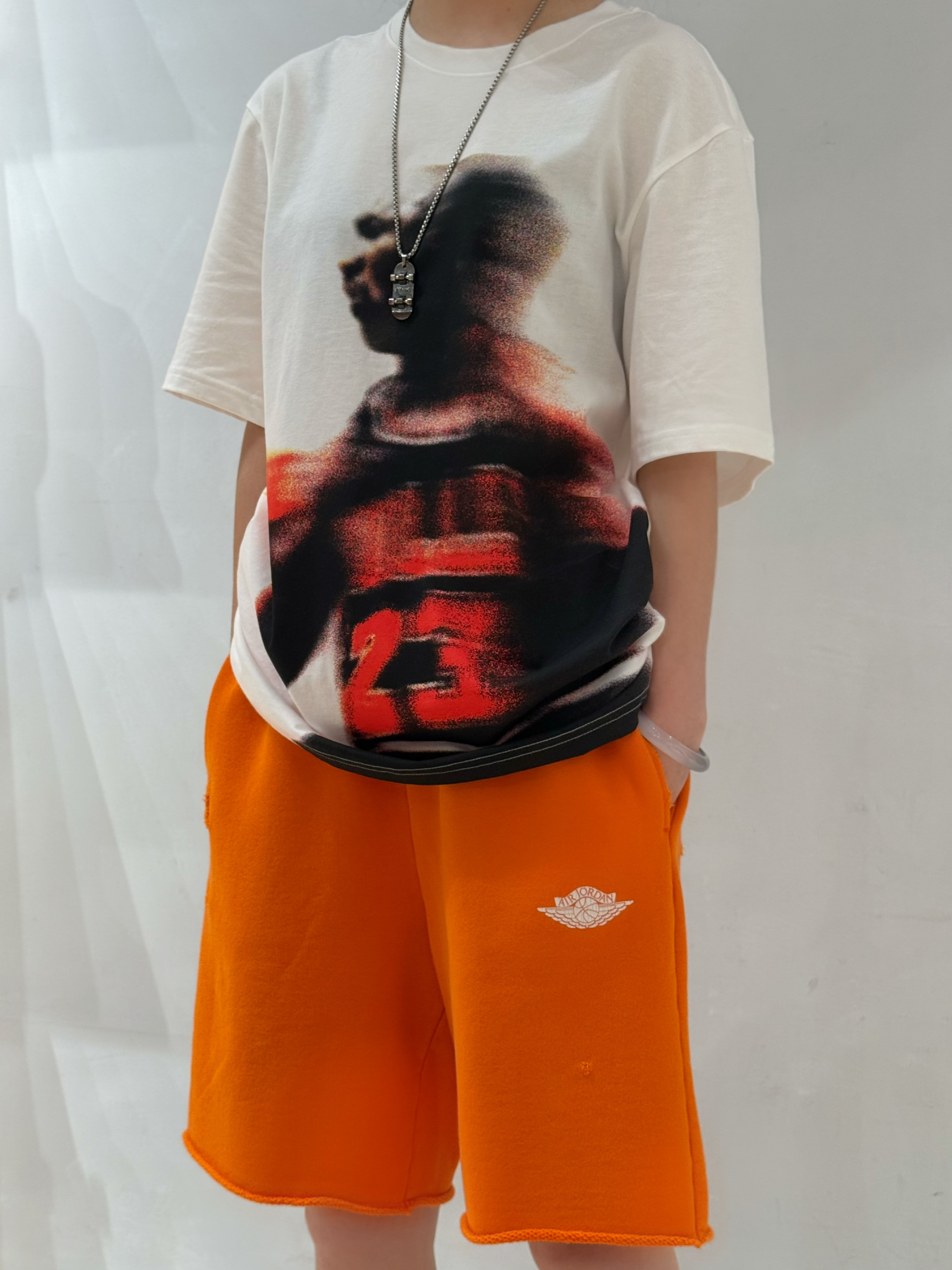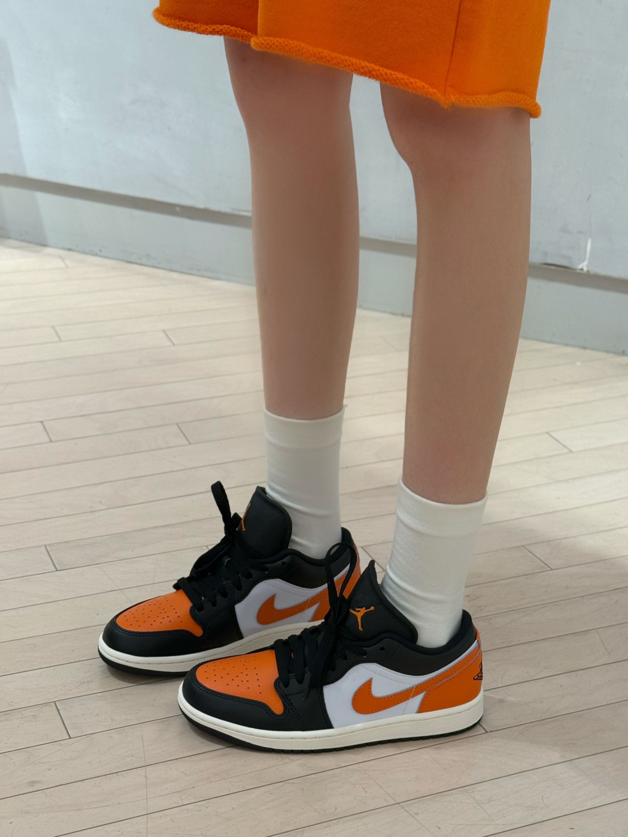 今日穿搭白T➕橙色五分裤 这套也太显白了吧~ 整套都是纯材质质感摸起来很舒适 👫男女都可以穿 不管是日常出街还是去喝下午茶都很不错 鞋子是黑橙AJ1低帮上脚超好搭配呢 日常牛仔裤也OK