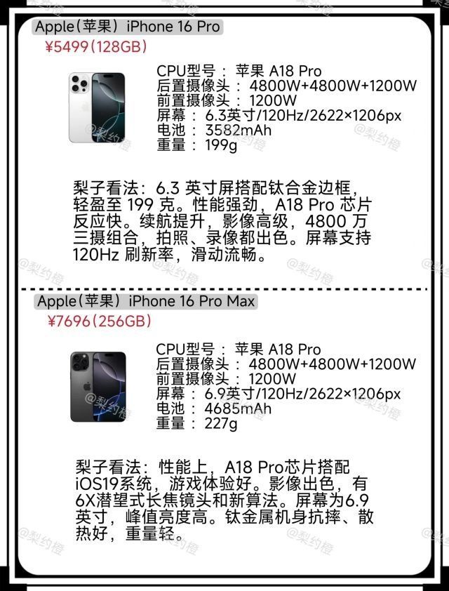 苹果手机一直是品质与科技的象征,下面这8款苹果手机,绝对是7月购机的不二之选。 _ 高端旗舰组 _ iPhone 16 Pro _ 售价较高,但性能顶尖。A18芯片搭配ProMotion高刷屏,操作顺滑。全新升级的摄像头系统,无论是风景、人像还是夜景,都能拍出专业级大片,适合对摄影有高要求的专业人士。 _ iPhone 16 Pro Max _ 预算充足就选它。大屏幕、大电池,续航无忧。它是苹果的...