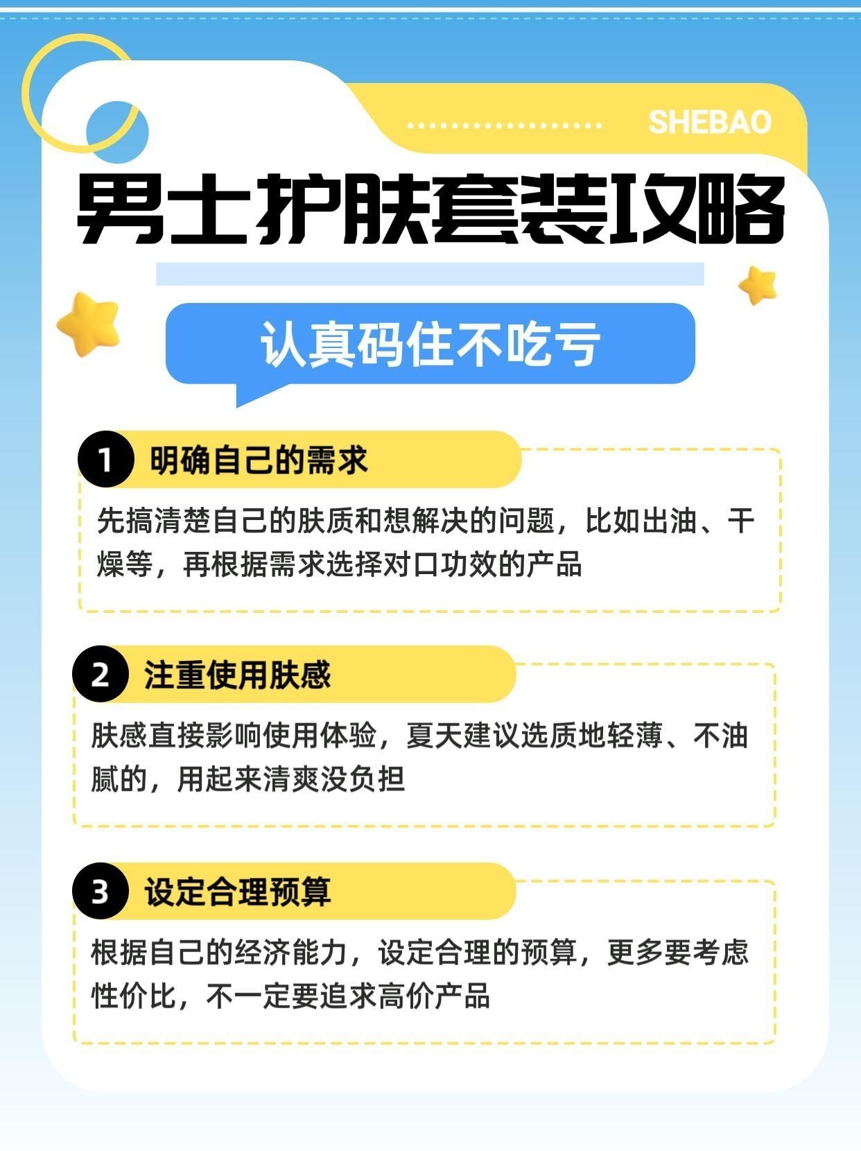 现在市面上的护肤品牌一大堆!盲目入手很容易就踩坑了🙅♂️ 所以兄弟们在入手之前一定要做好功课!!避免花冤枉钱 今天认真总结了一份男士护肤套装选购攻略📝,直接告诉大家应该怎么选 … 接下来几个选购关键点👇: 1️⃣ 明确自己的需求 先搞清楚自己的肤质和想解决的问题,比如出油、干燥等,再根据需求选择对口功效的产品 2️⃣注重使用肤感 肤感直接影响使用体验,夏天建议选质地轻薄、不油腻的,用起来清爽没负...
