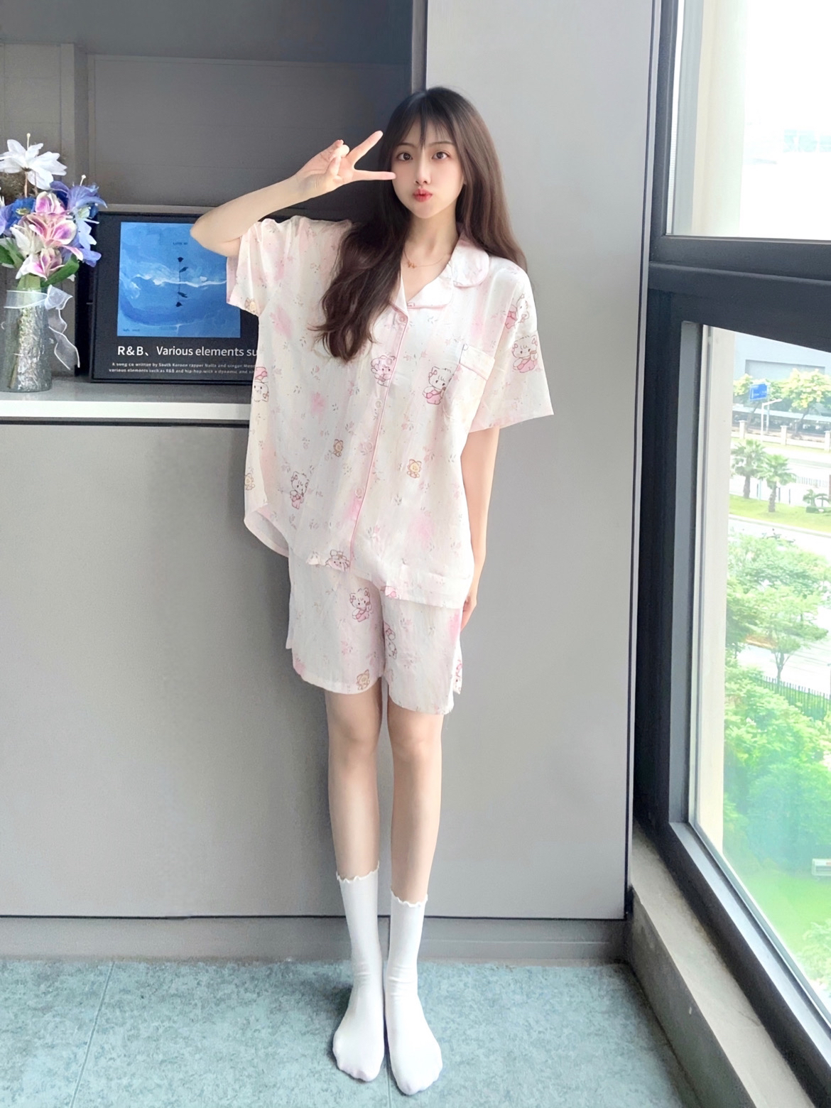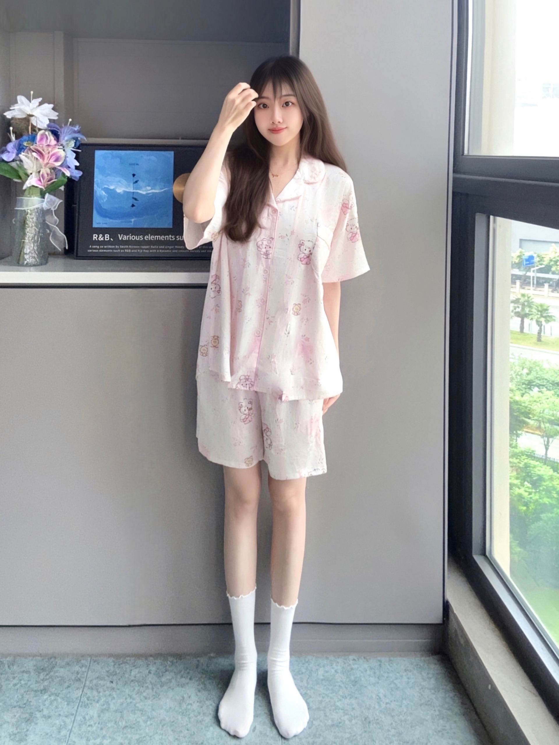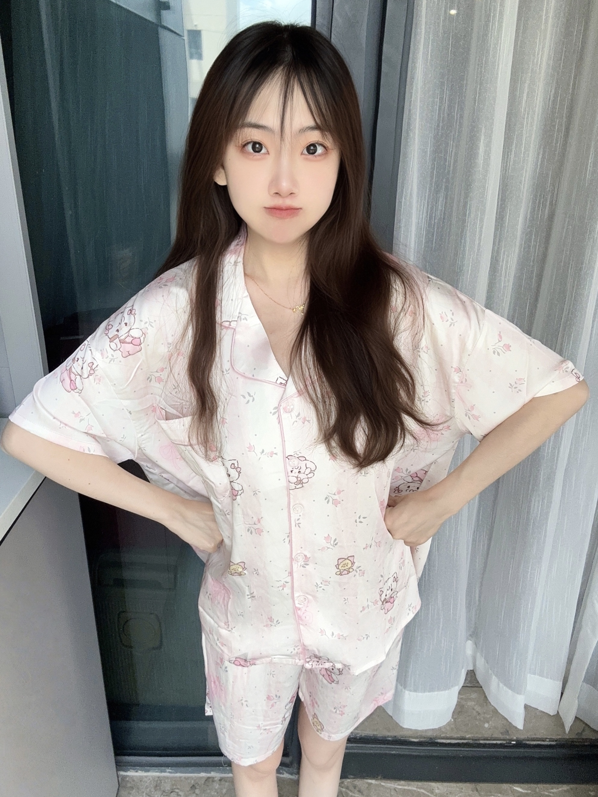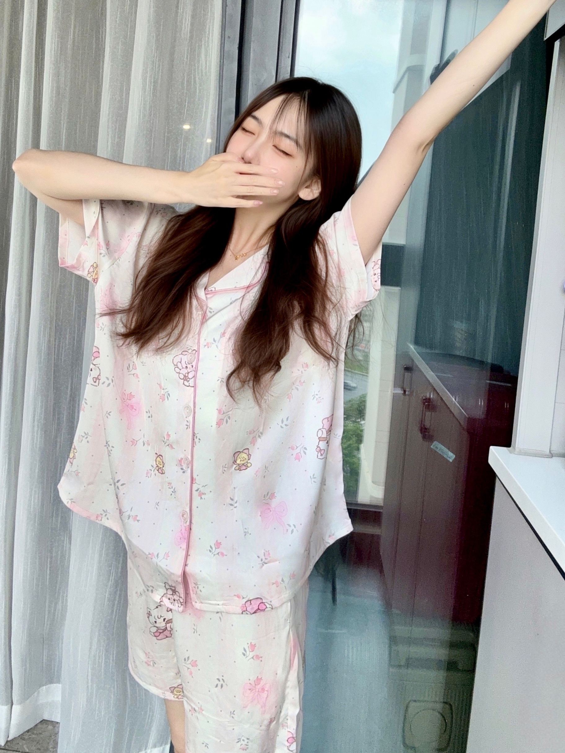天气炎热,很喜欢开着空调窝家里 穿上mikko联名睡衣好可爱呀 一套里面有短睡裤和长睡裤 上身面料软软的很透气,不会闷热
