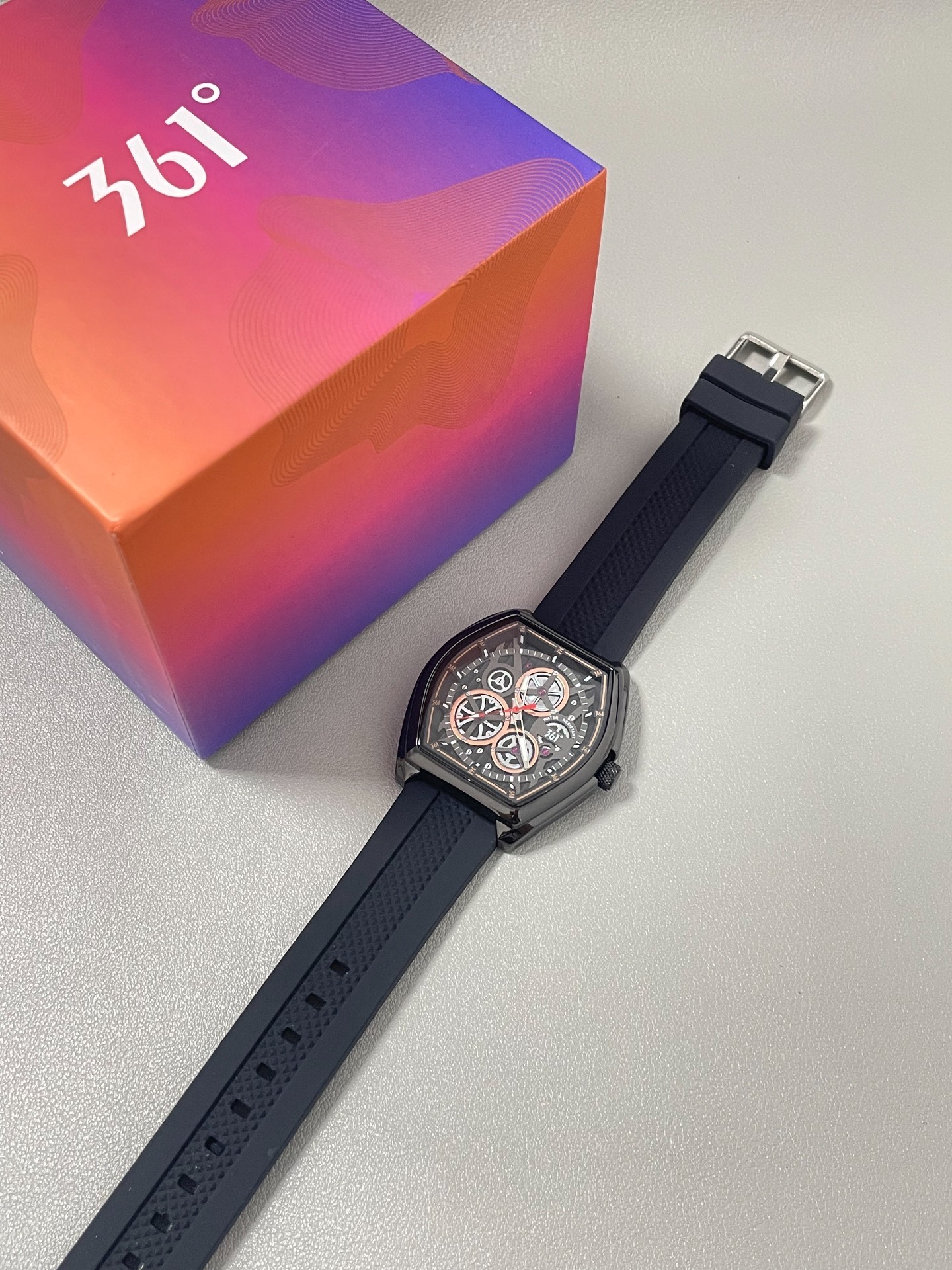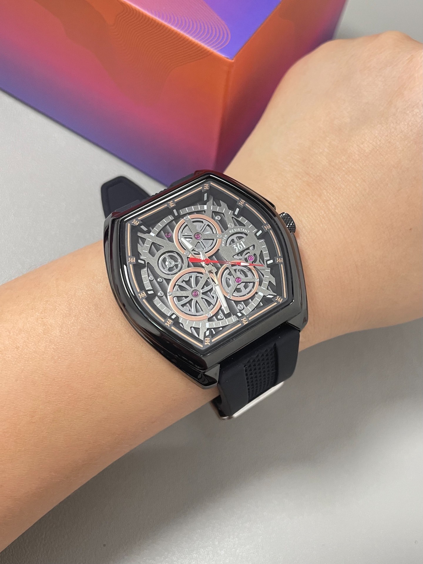 我宣布🎉,我的男友是有点选表天分在身上的!开箱那仪式感直接拉满,礼盒贼酷炫~黑色酒桶形表盘真的超有创意,戴上感觉人都变得时尚起来了。而且硅胶表带,夏天戴透气得很,完全没有那种闷汗的难受感。夜光设计也不错,晚上看时间超方便。不过呢,矿物强化玻璃镜面虽然还算耐造,但有时候一不注意还是会留下点小划痕,这点算是个小瑕疵吧。总体来说,百元价位能有这质感这颜值,真的很值啦,我现在出门都爱戴着它~