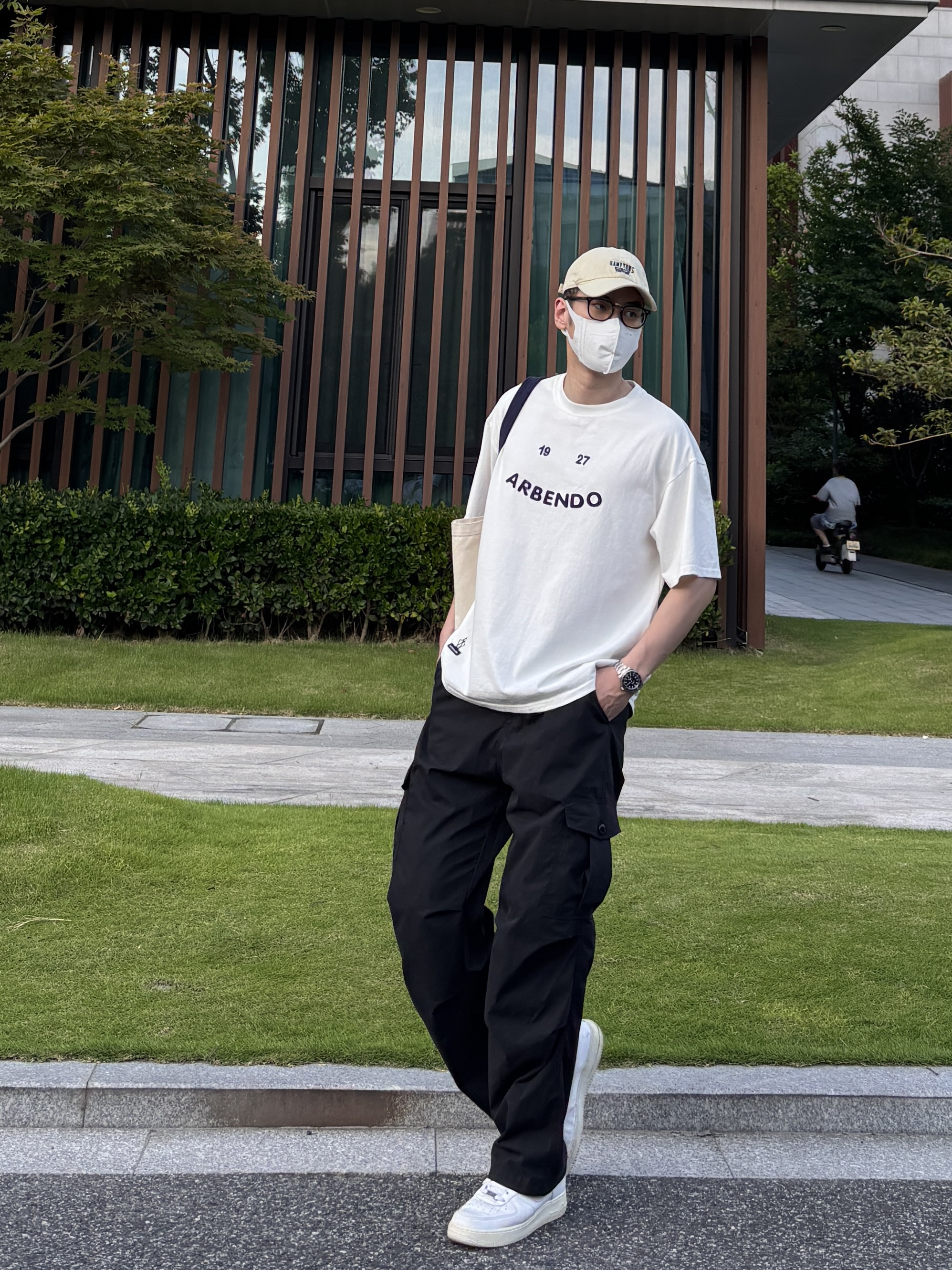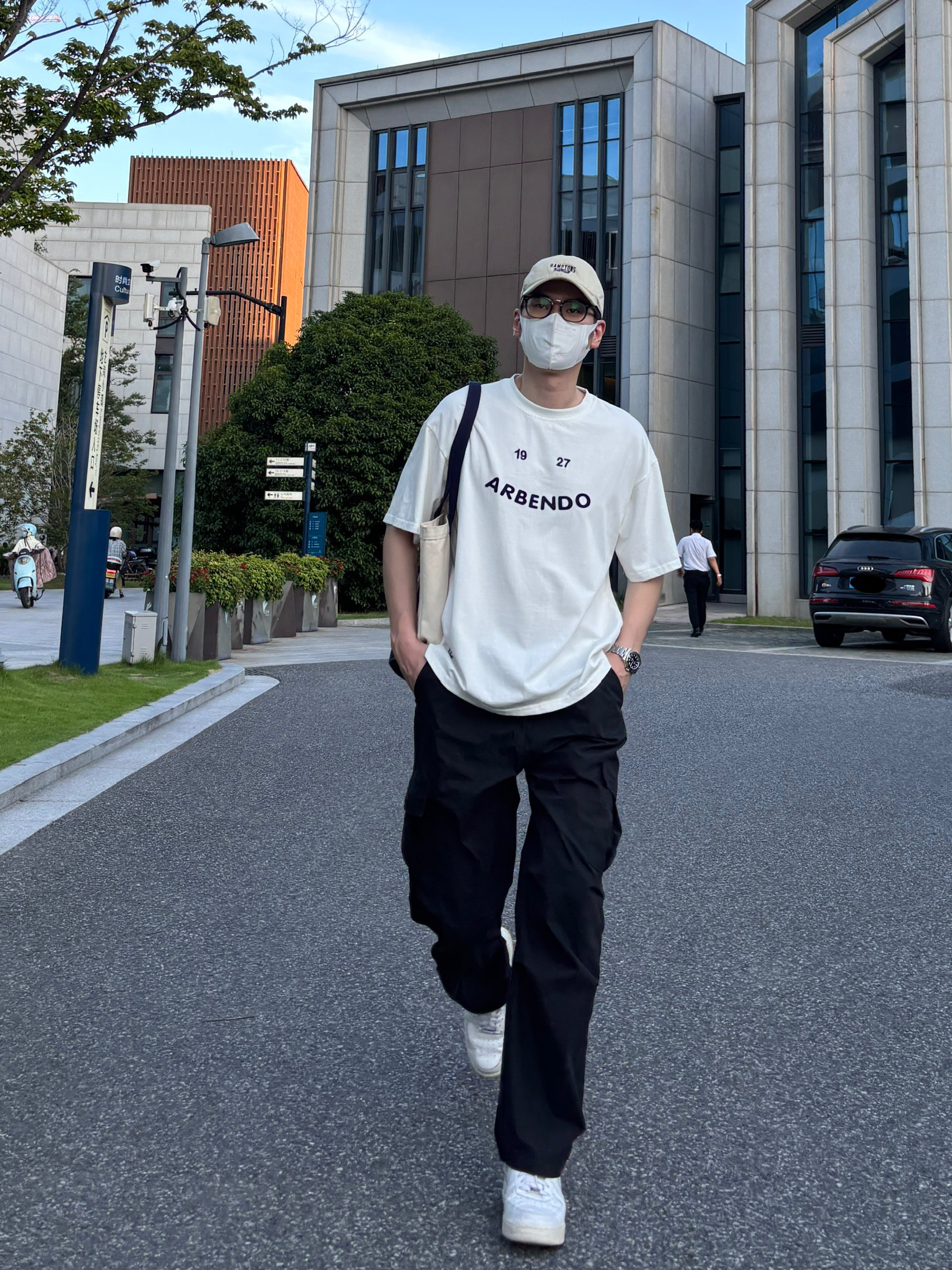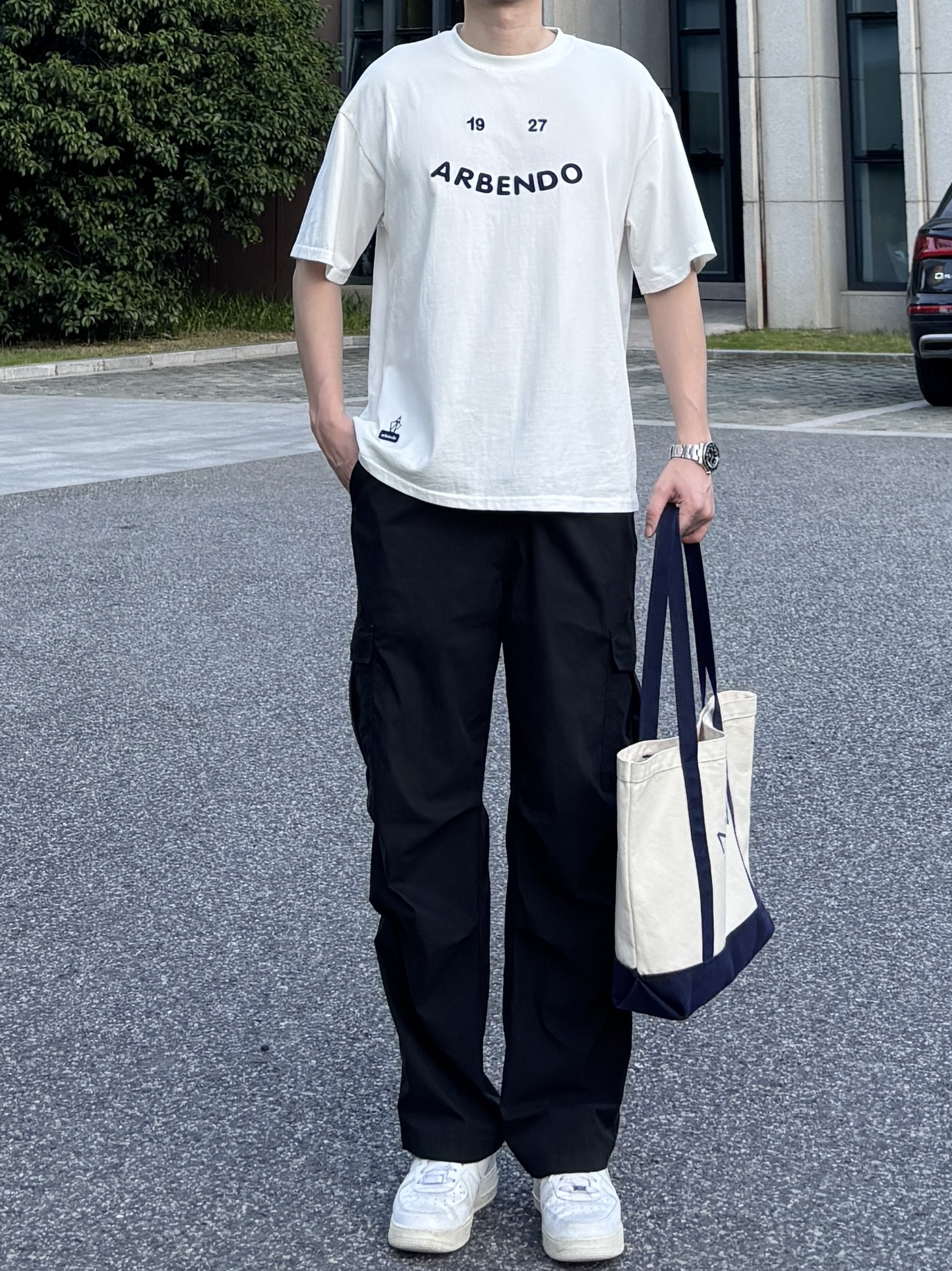 今天这套上衣穿了一件清爽干净的白蓝字母宽松阔版圆领短袖 ⬇️ 裤子选择简约大方的黑色直筒冰丝速干多口袋伞兵裤 ⬇️ 鞋子上脚经典百搭的纯白色af1 ⬇️ 最后背一个轻便的帆布托特包呼应下衣服的颜色 - 今日搭配 衣服裤子:NICE LILI 鞋子:AF1纯白
