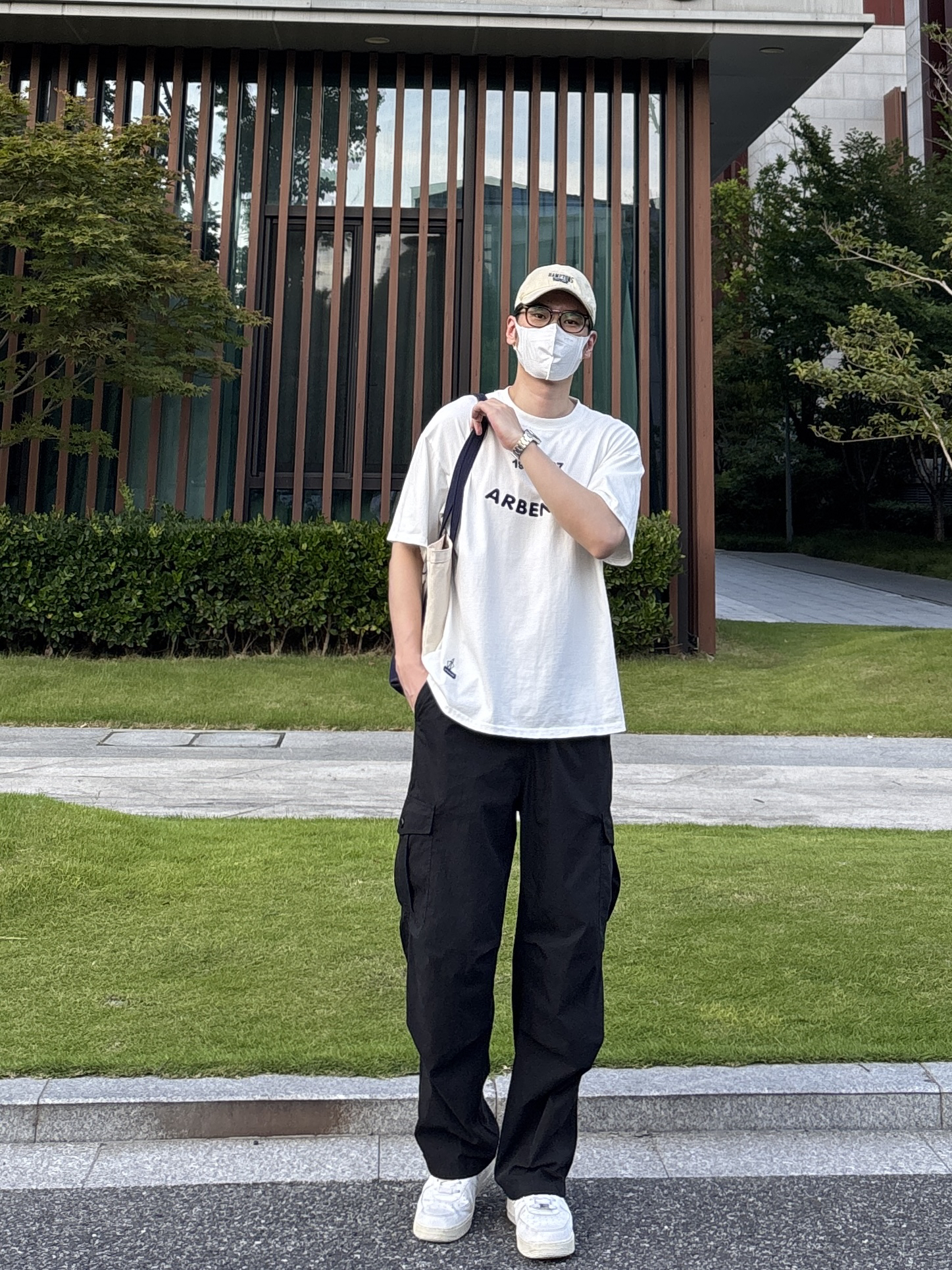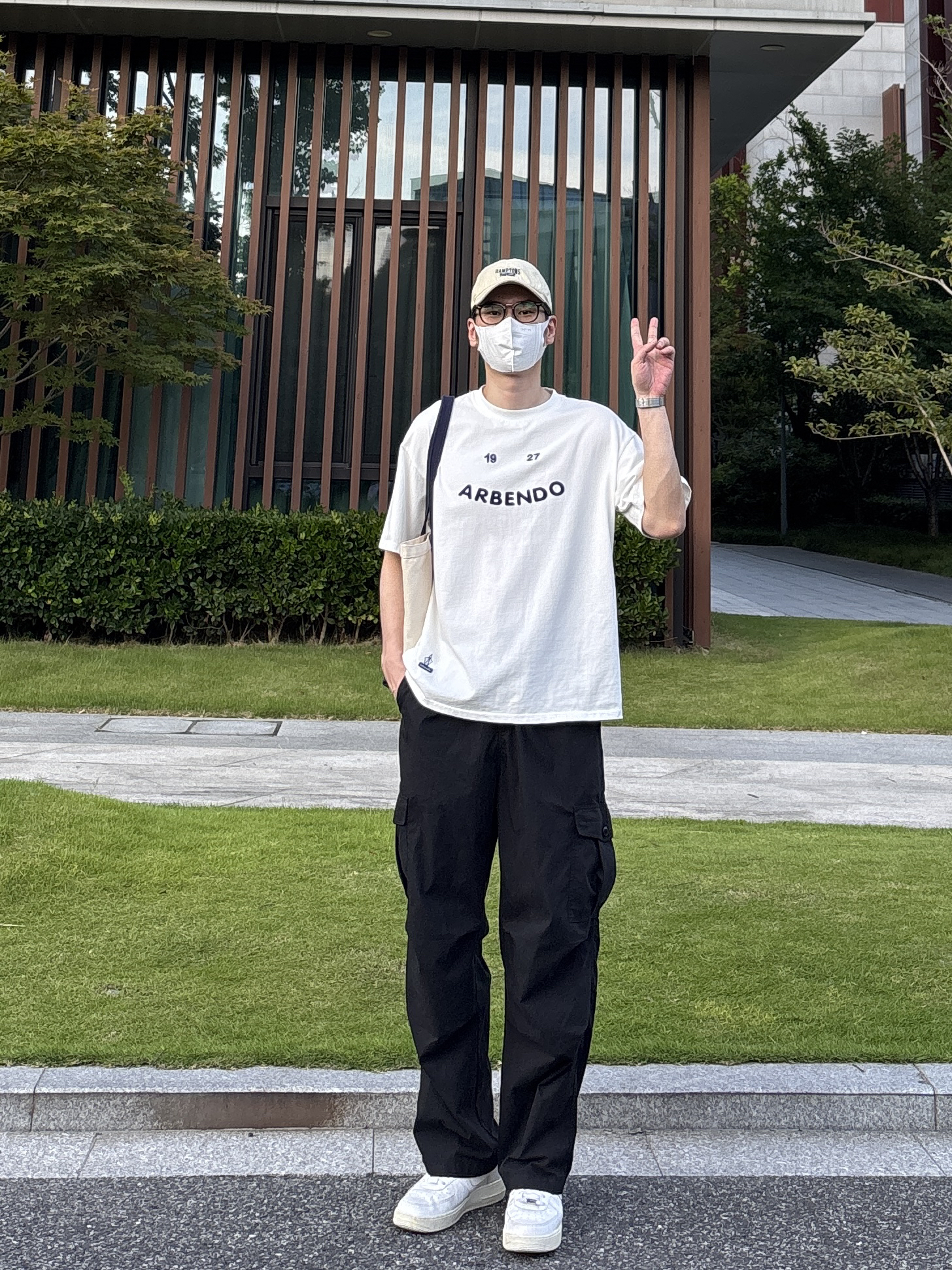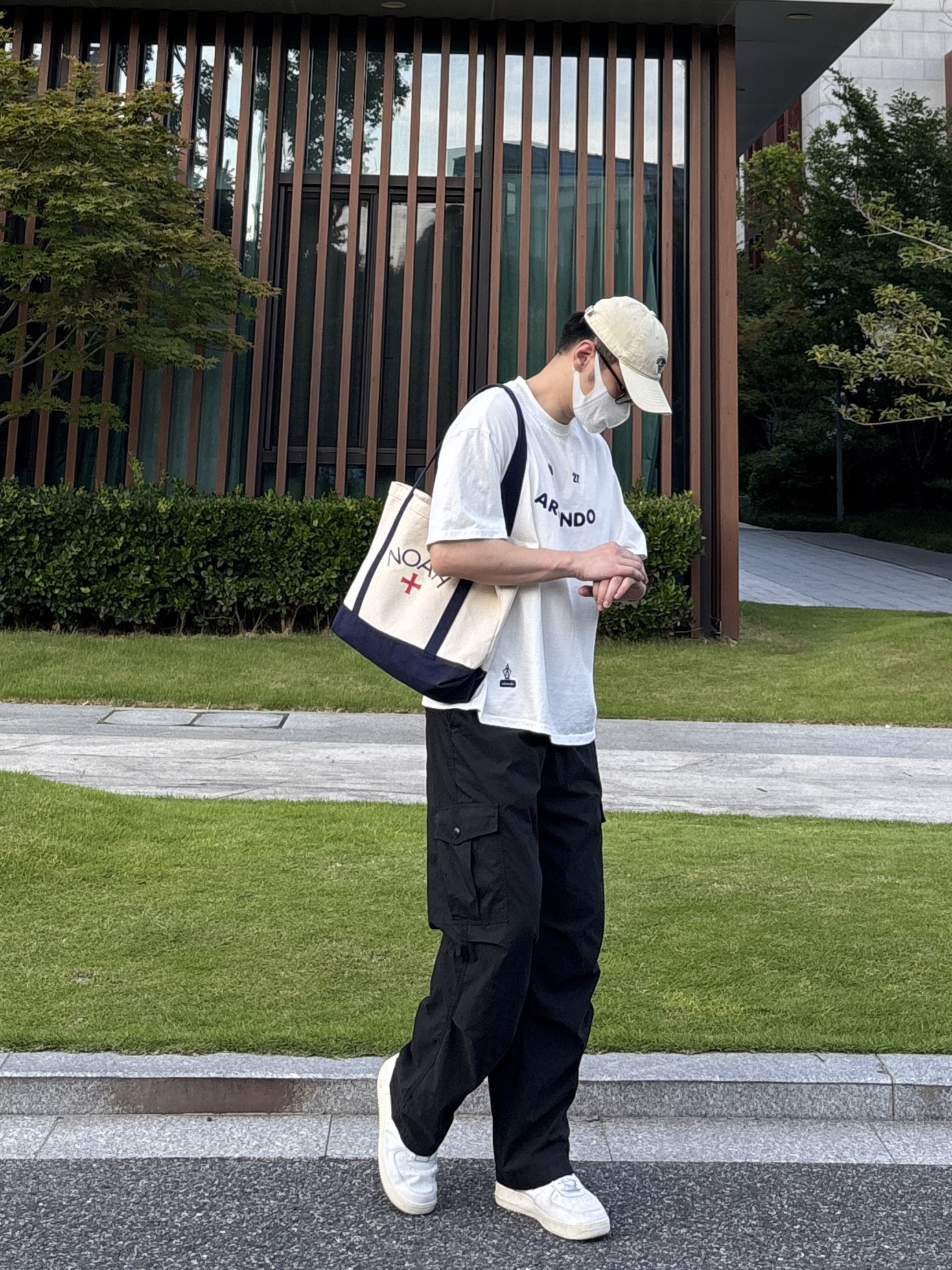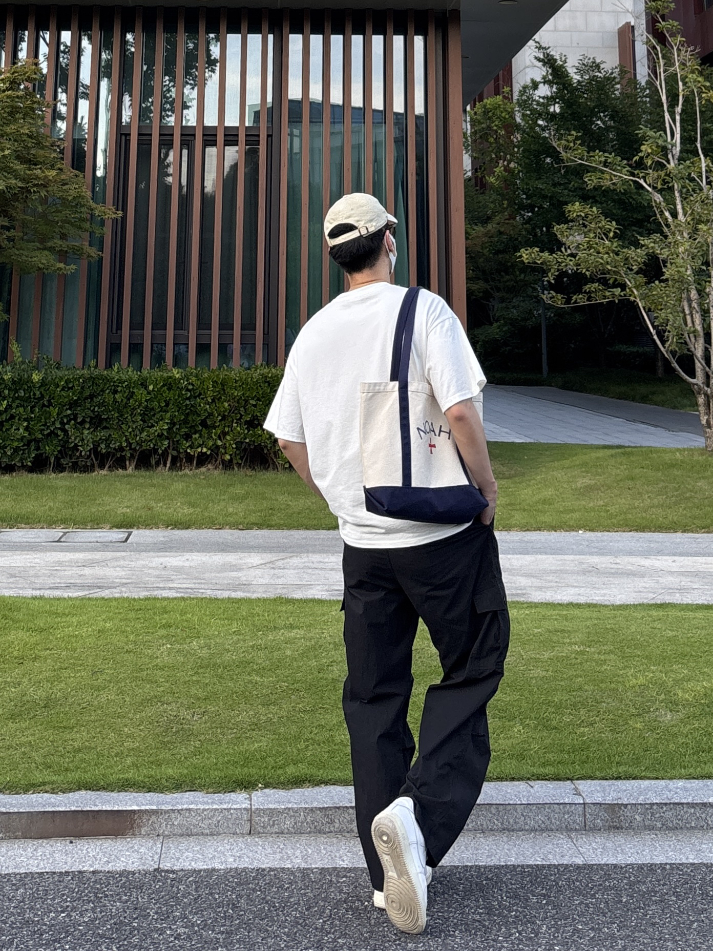 今天这套上衣穿了一件清爽干净的白蓝字母宽松阔版圆领短袖 ⬇️ 裤子选择简约大方的黑色直筒冰丝速干多口袋伞兵裤 ⬇️ 鞋子上脚经典百搭的纯白色af1 ⬇️ 最后背一个轻便的帆布托特包呼应下衣服的颜色 - 今日搭配 衣服裤子:NICE LILI 鞋子:AF1纯白