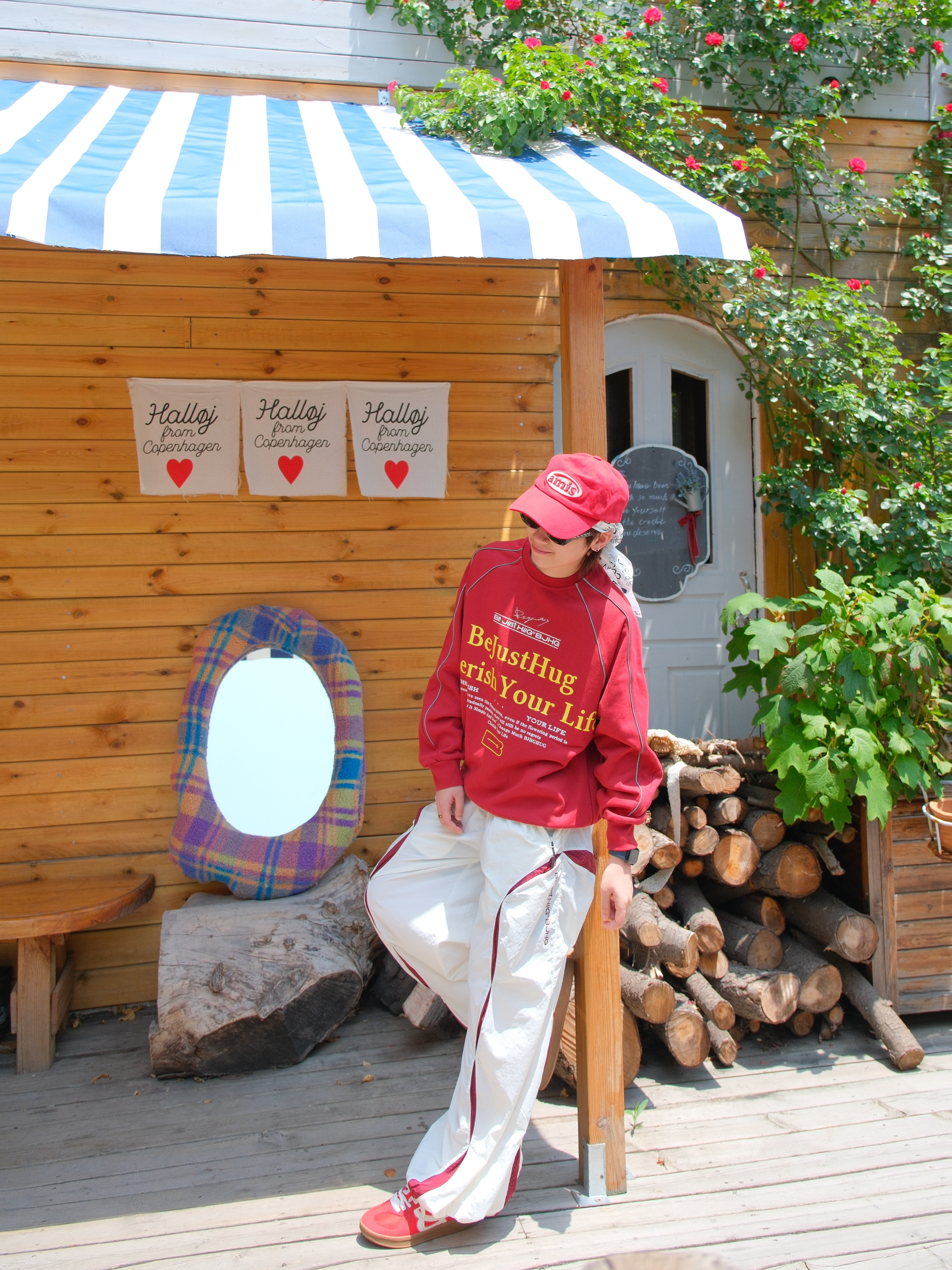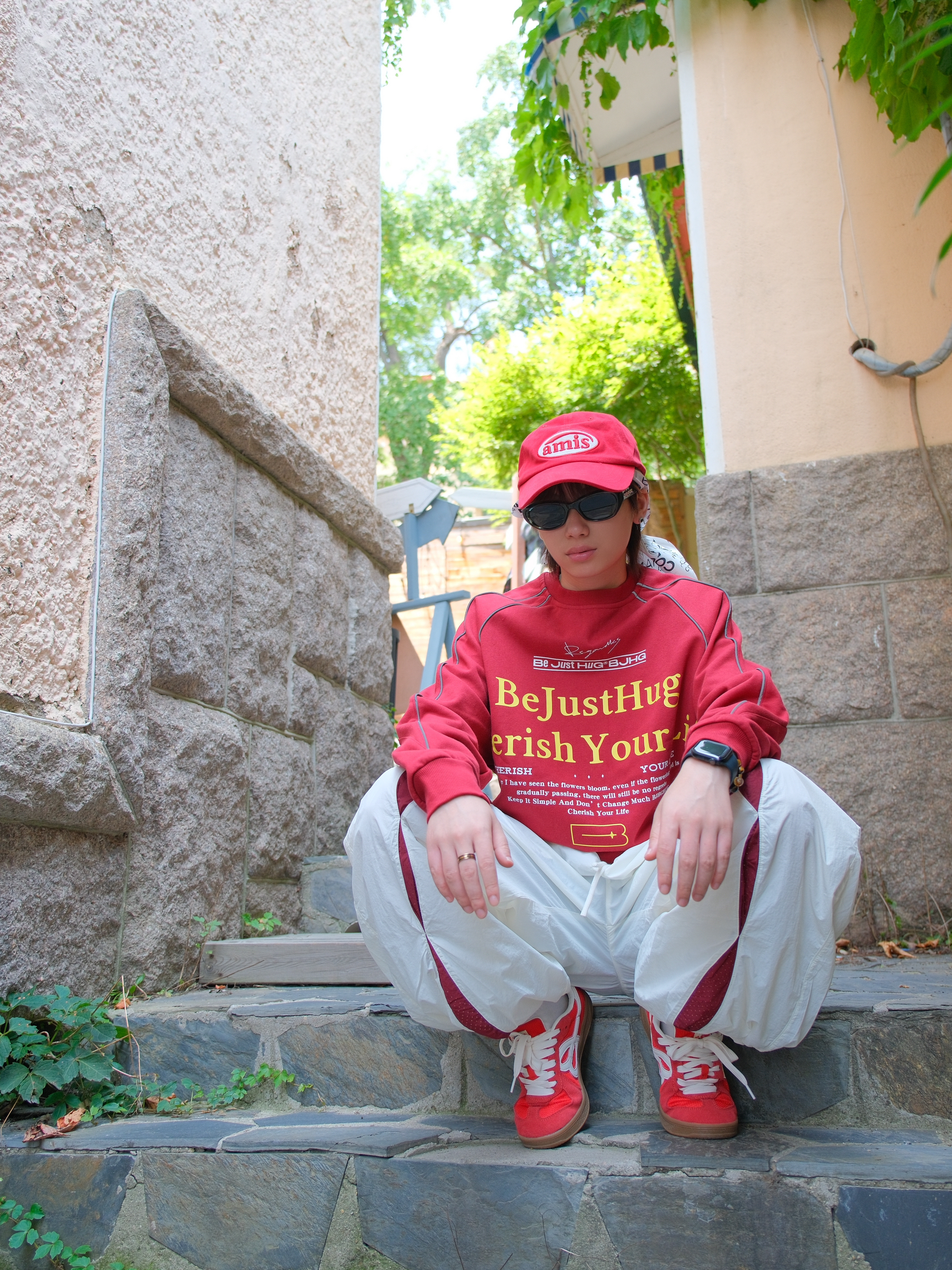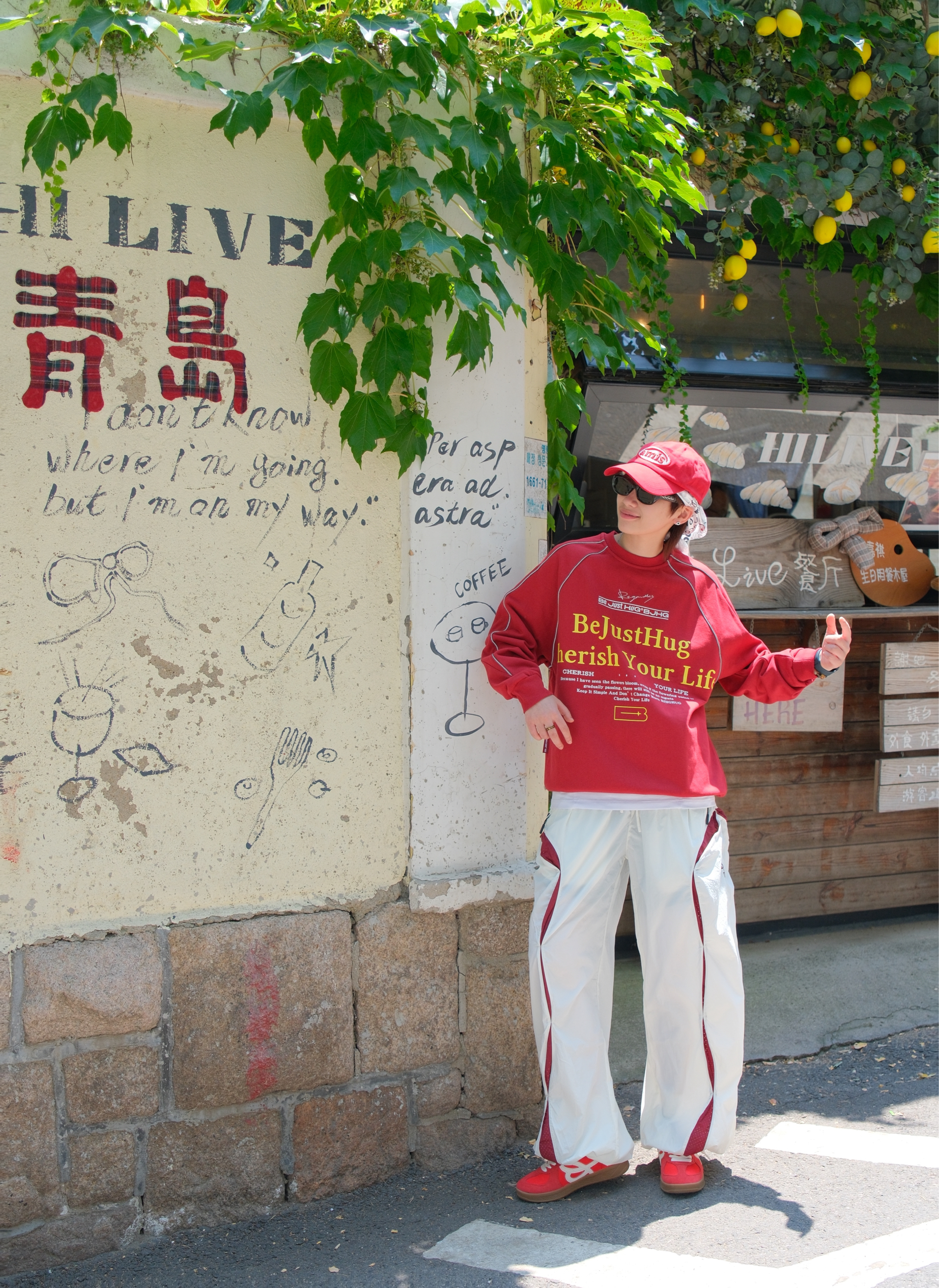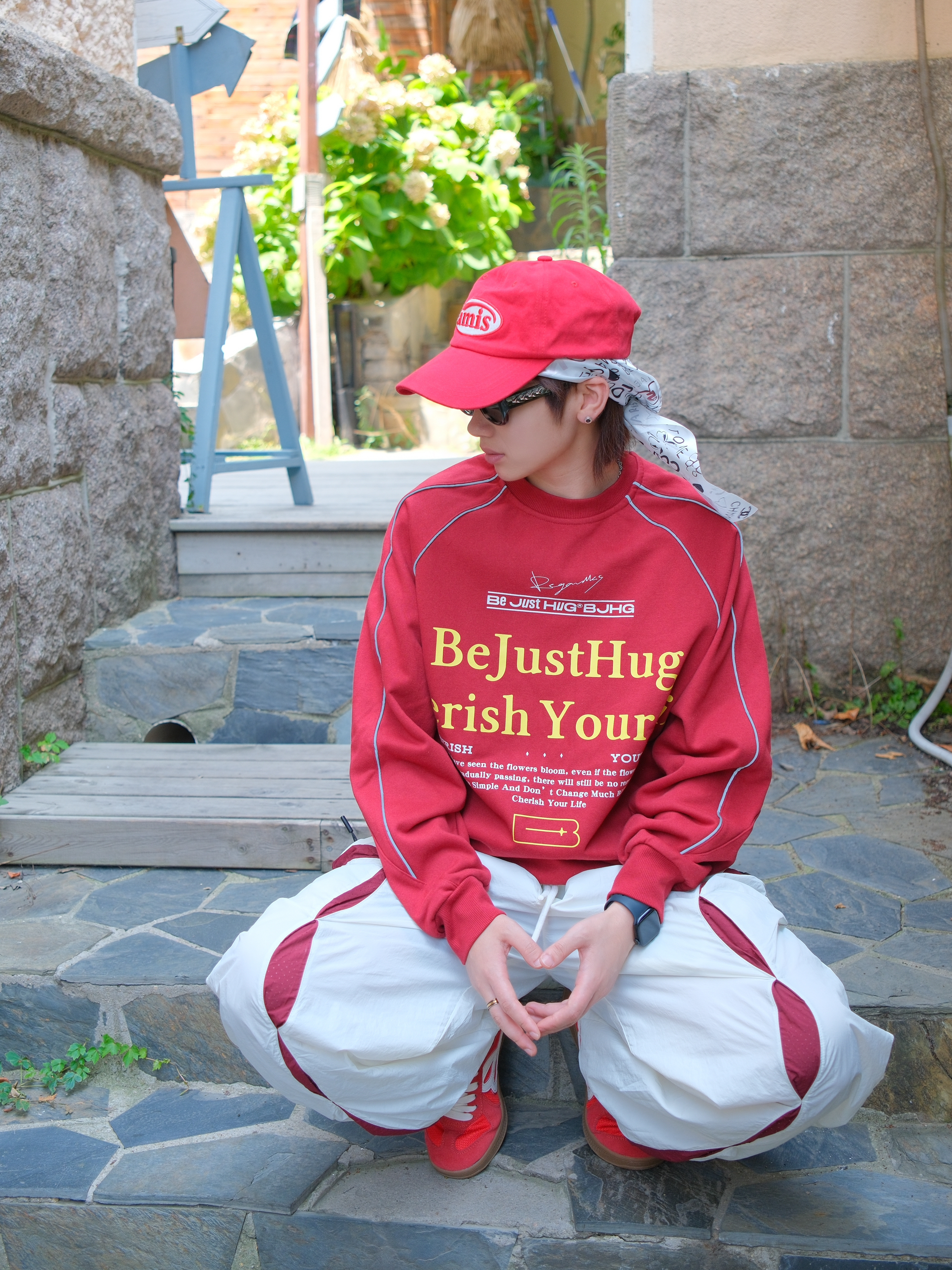 明媚的天气,就想穿点红色系❤️🔥 上身是一件红色的圆领卫衣 撞色字母logo就很有街头范 袖口的线条是反光的设计,白天没拍出来效果 下面搭配白色工装裤 裤腿加了红色拼接,刚好和上衣呼应起来 因为是速干材质,夏天穿着也比较舒服 裤脚抽绳设计,可以切换直筒/束脚两种穿法 鞋子也选了双红色德训鞋 也是第一次尝试头巾和鸭舌帽的组合 有点说唱街头小子那味了 尺码参考:163cm/48kg 上身S码