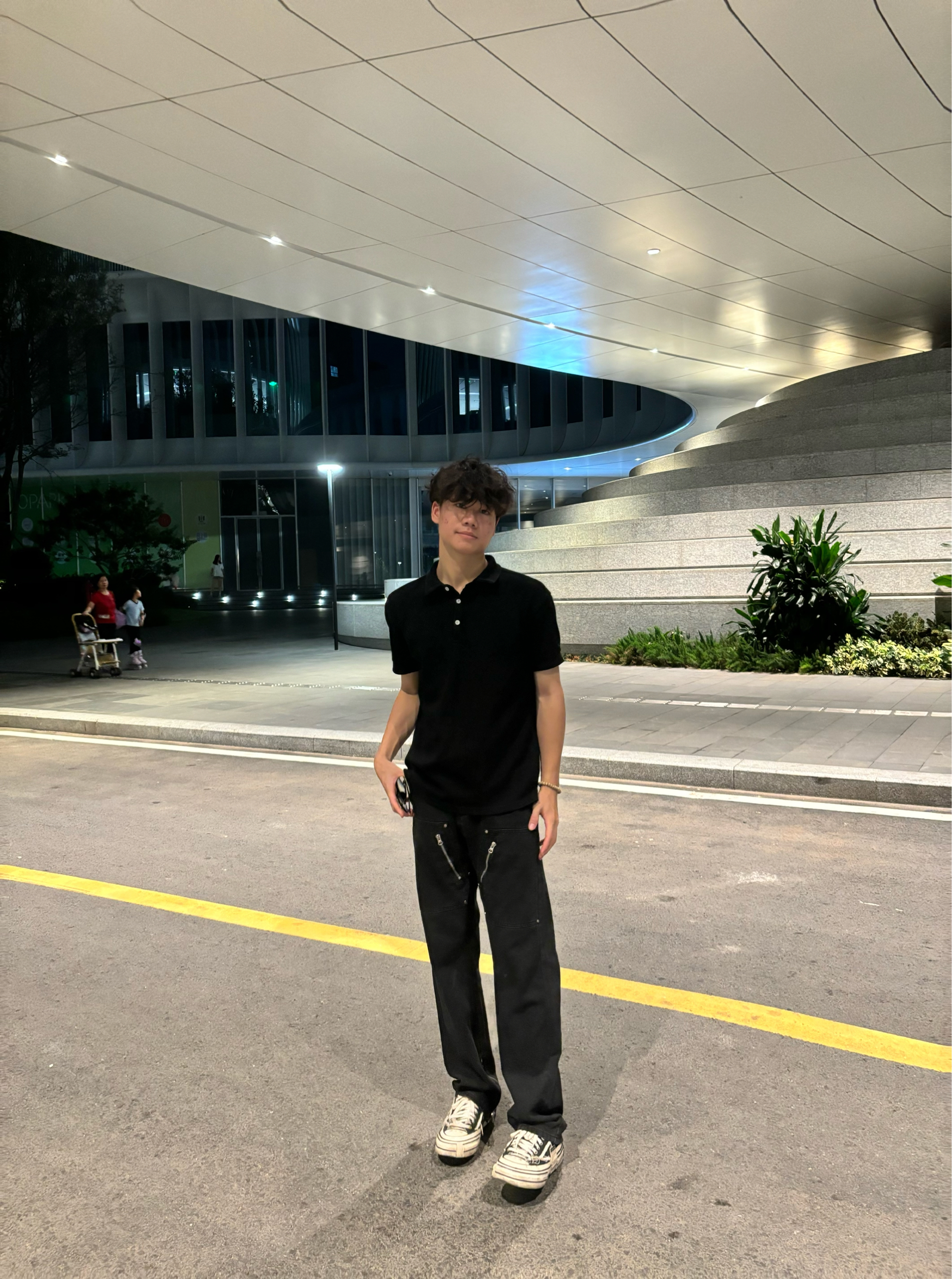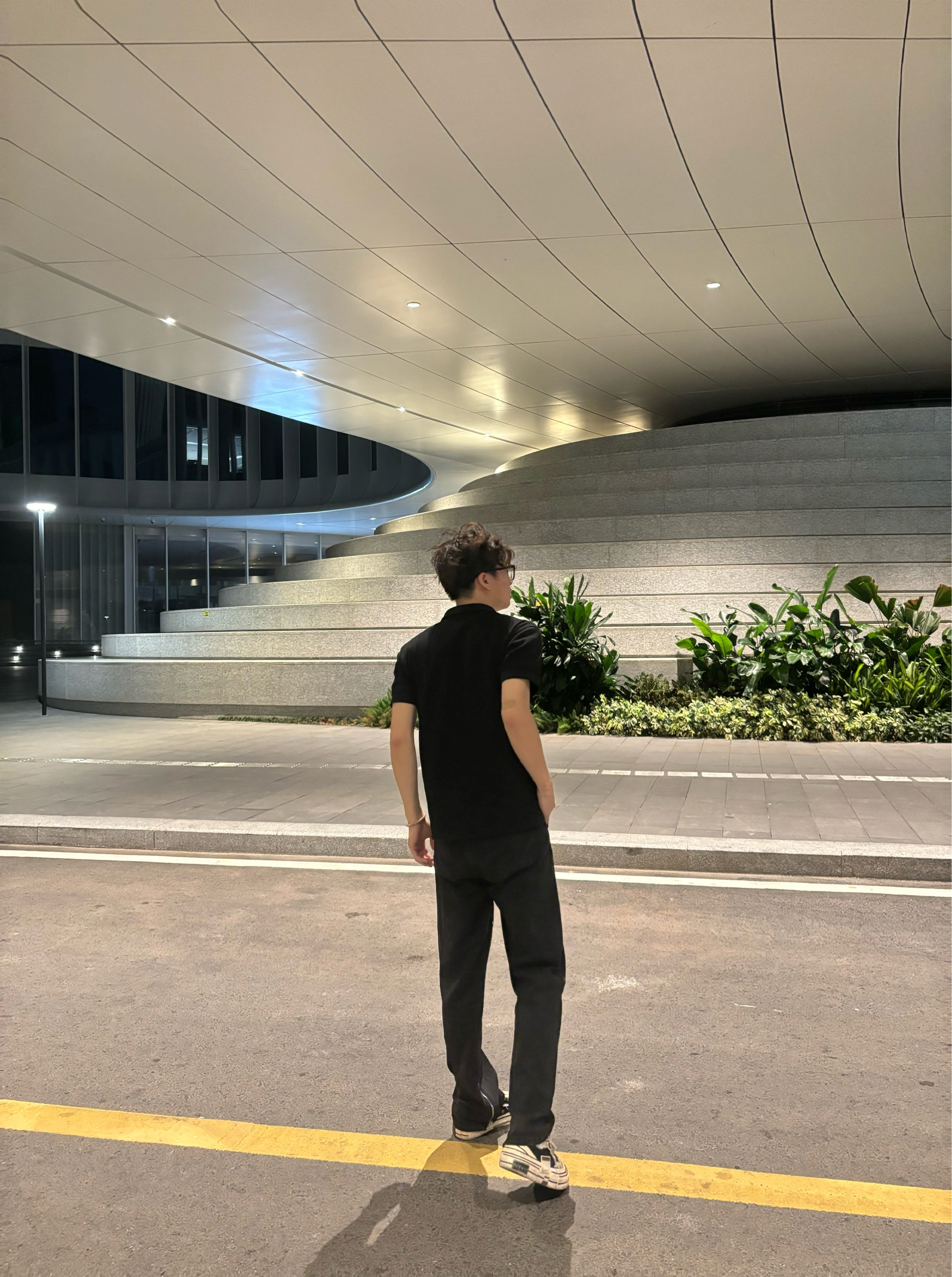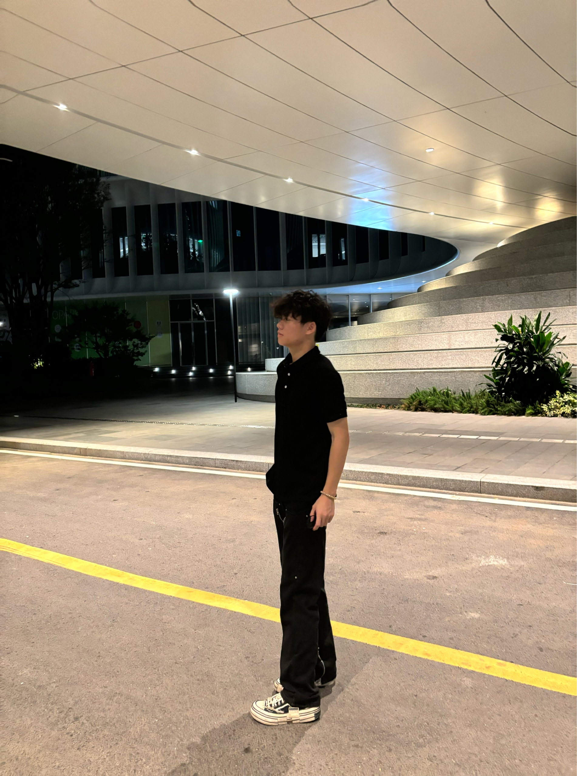 分享今日松弛感cityboy穿搭✨ 黑polo衫简约利落,藏肉又显精神,做旧黑裤拉链设计添细节,中和单调。经典帆布鞋适配度拉满,踩上就有街头感~ 建筑夜景当背景,随性出片。日常通勤、逛街这么穿,舒适又有型,识货的搭子们闭眼抄作业✔️