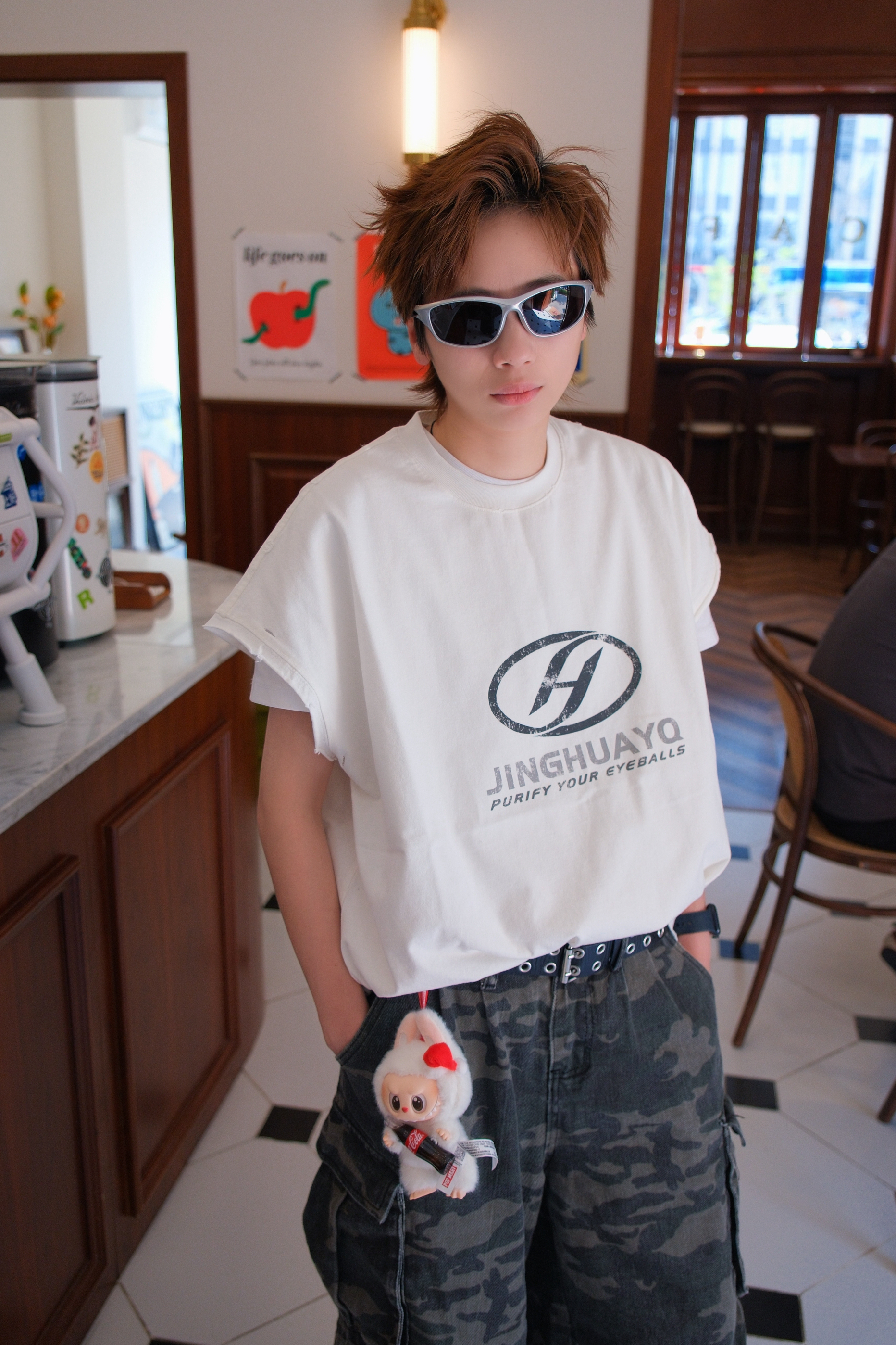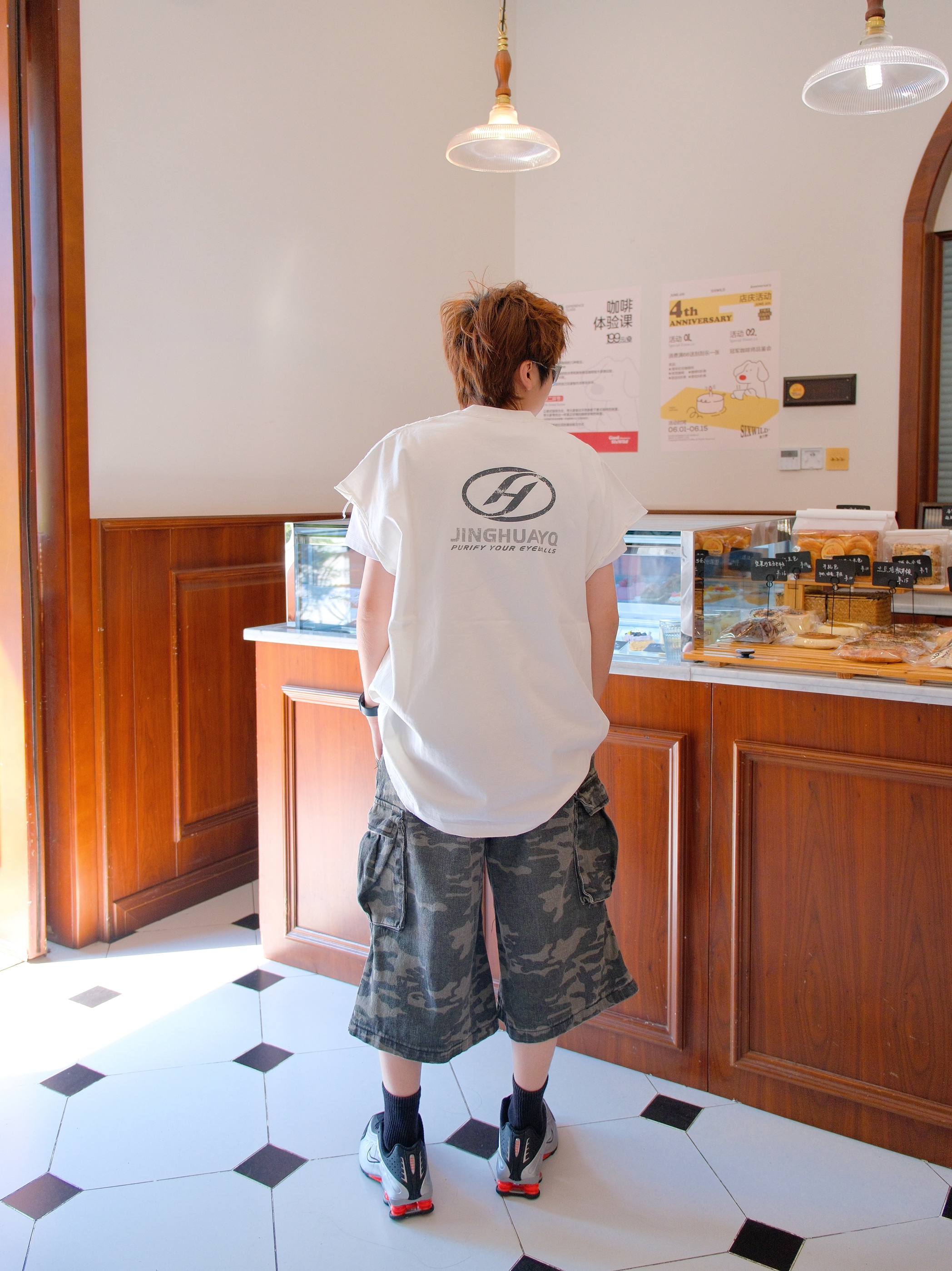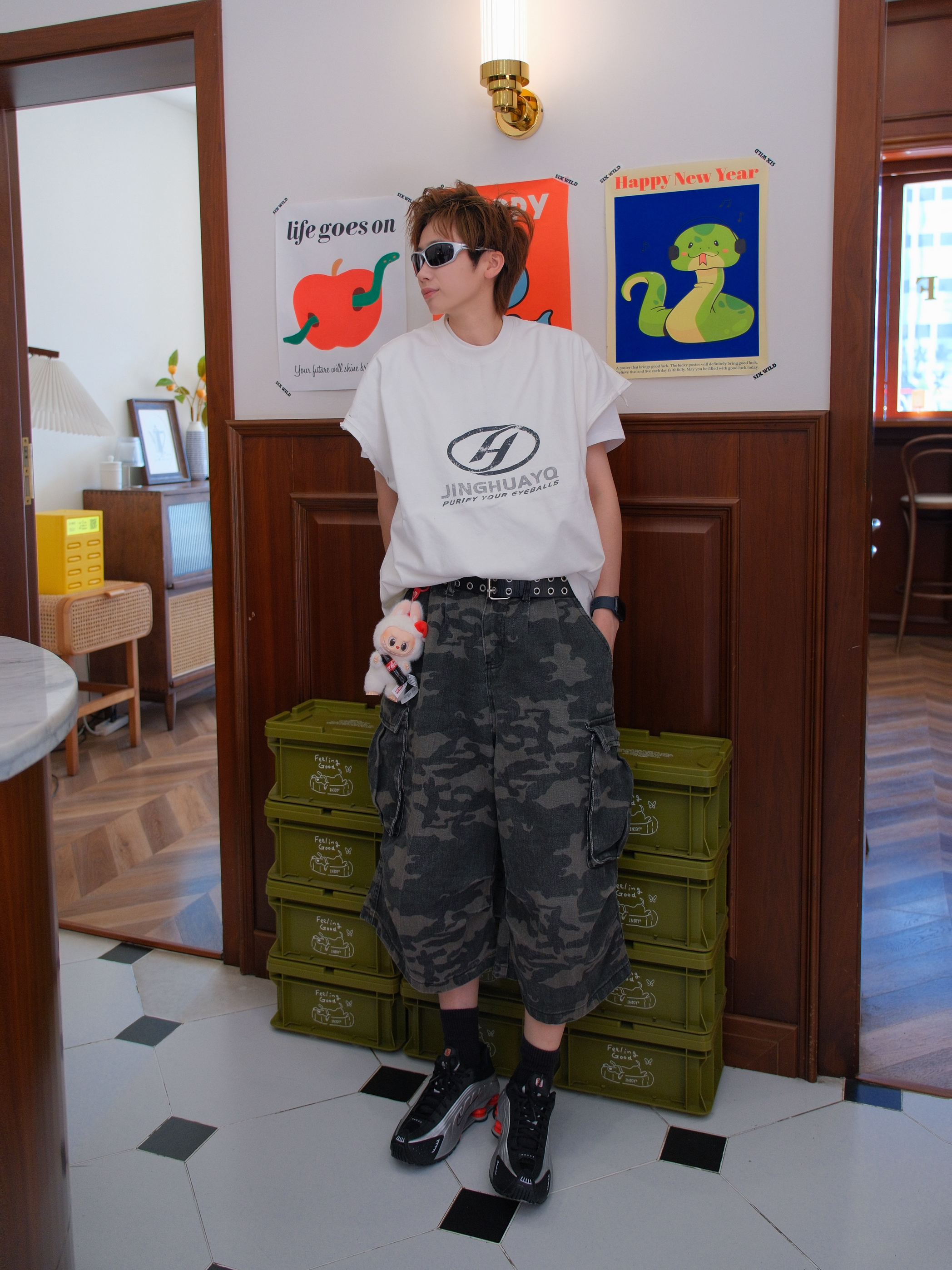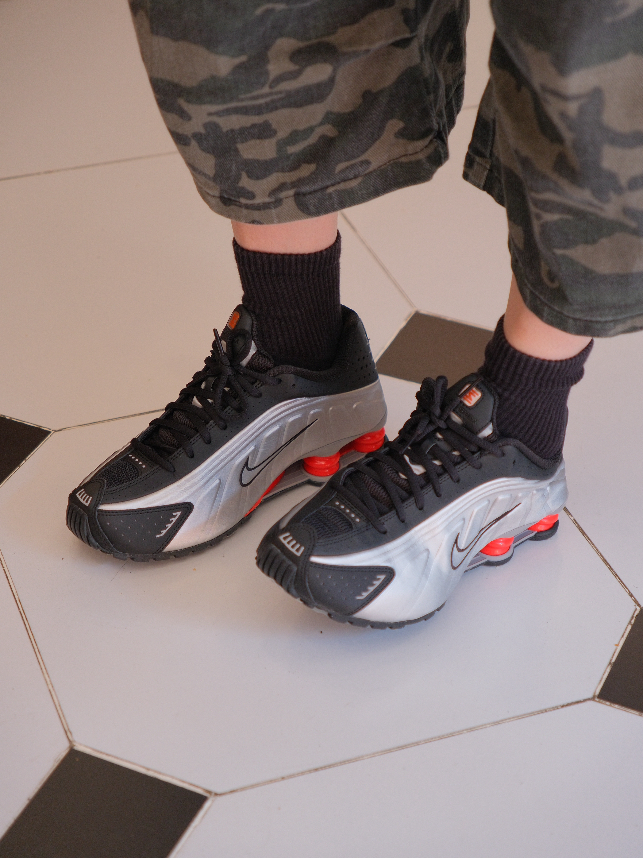 2025年才get到的千禧机能风 气柱鞋拿到手是真香 今天就用它来搭配一套look 上身选一件白色的坎肩背心🎽 侧边开叉比较大,内搭T恤会比较友好点 宽松的oversize版型,有点美式街头感 下面搭配迷彩工装裤 七分裤型压身高?系个腰带把上衣塞进去 就可以拉长腿部比例 最后搭配上黑银配色R4 红色的气柱弹簧中底真的好看 流线鞋身复古科技感十足 不过脚感稍微有点硬 尺码方面我平时AJ穿37....