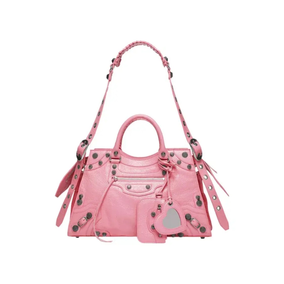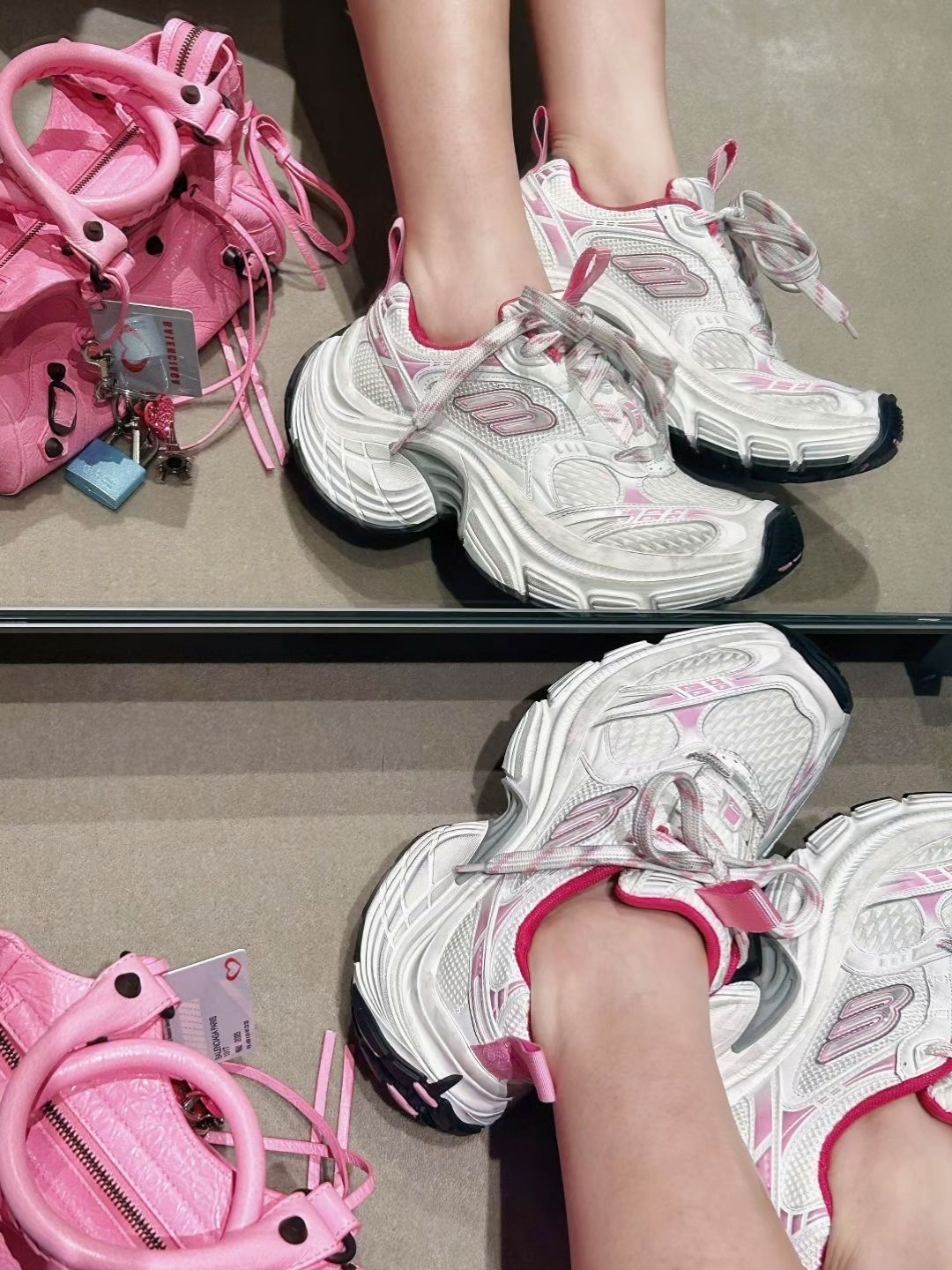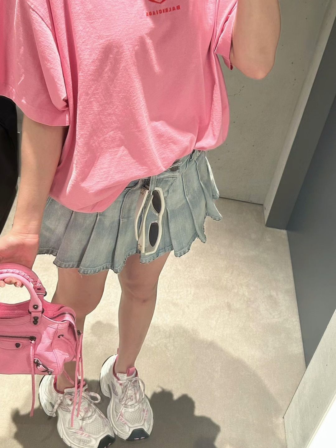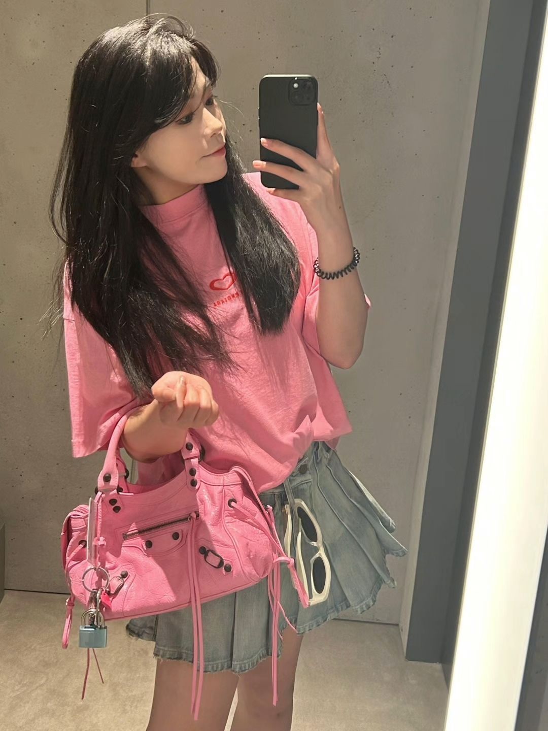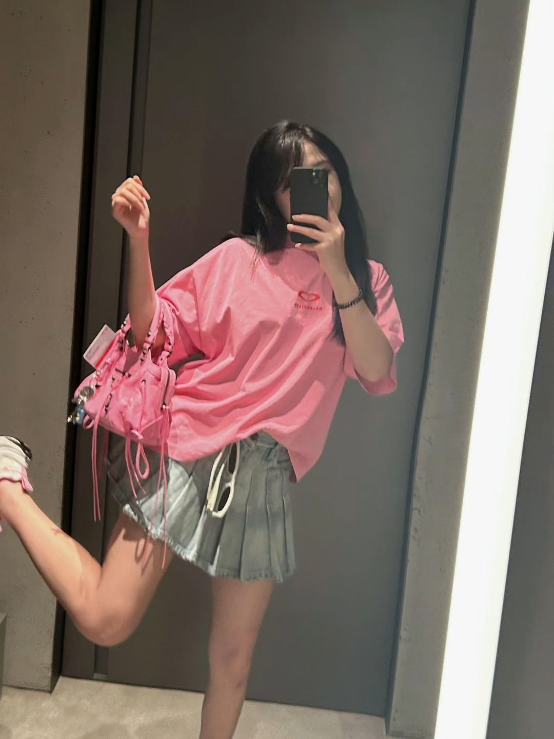 巴黎世家粉色爱心T恤宽松随性,浅蓝牛仔百褶裙带毛边小叛逆,灰白粉运动鞋添青春感,搭配同色机车包,甜酷融合,日常出街很吸睛,轻松拿捏松弛氛围 。