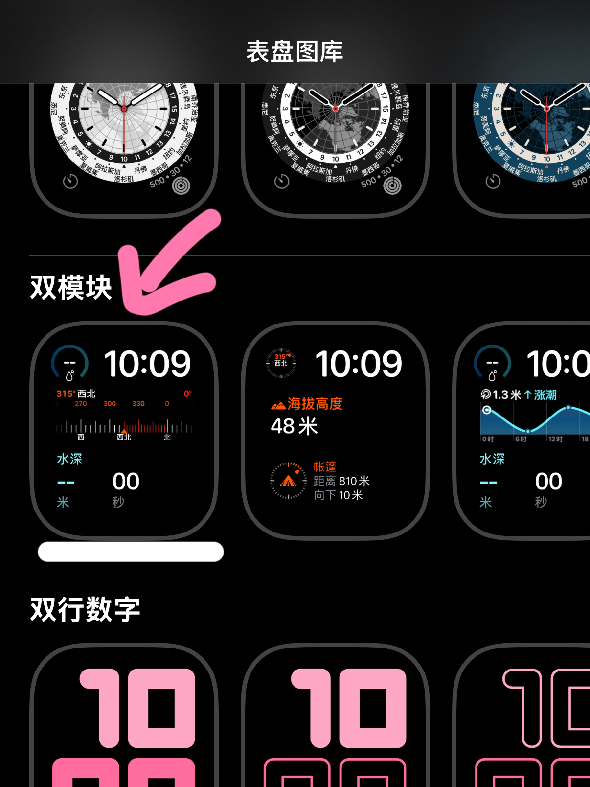 apple watch防晒教程来啦 需要提前下载好解压小橙子这个app哦 1️⃣打开苹果自带的watch 2️⃣点击底端的表盘图库,找到双模块 3️⃣设置复杂功能,选择紫外线和晒太阳时间 4️⃣设为当前表盘