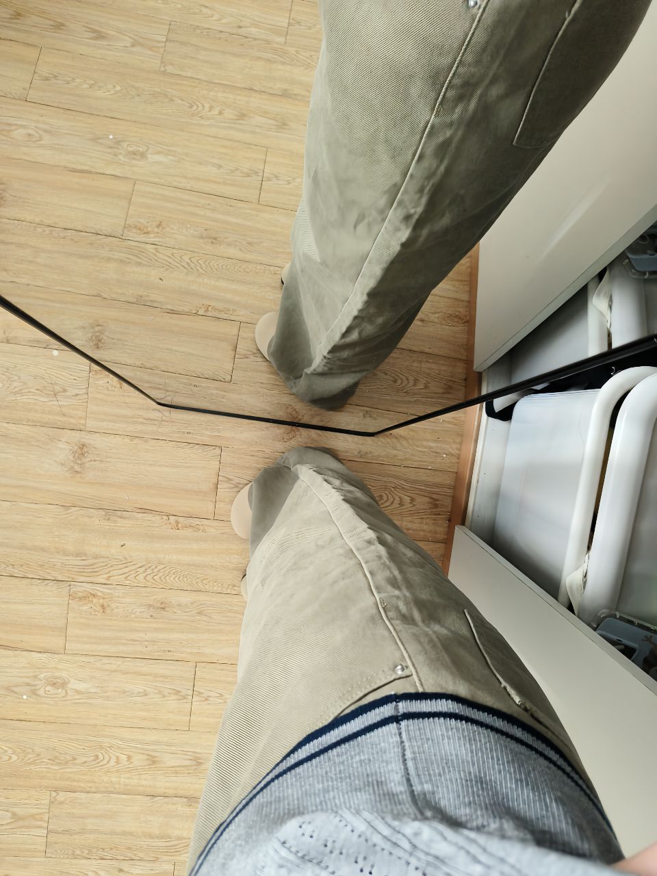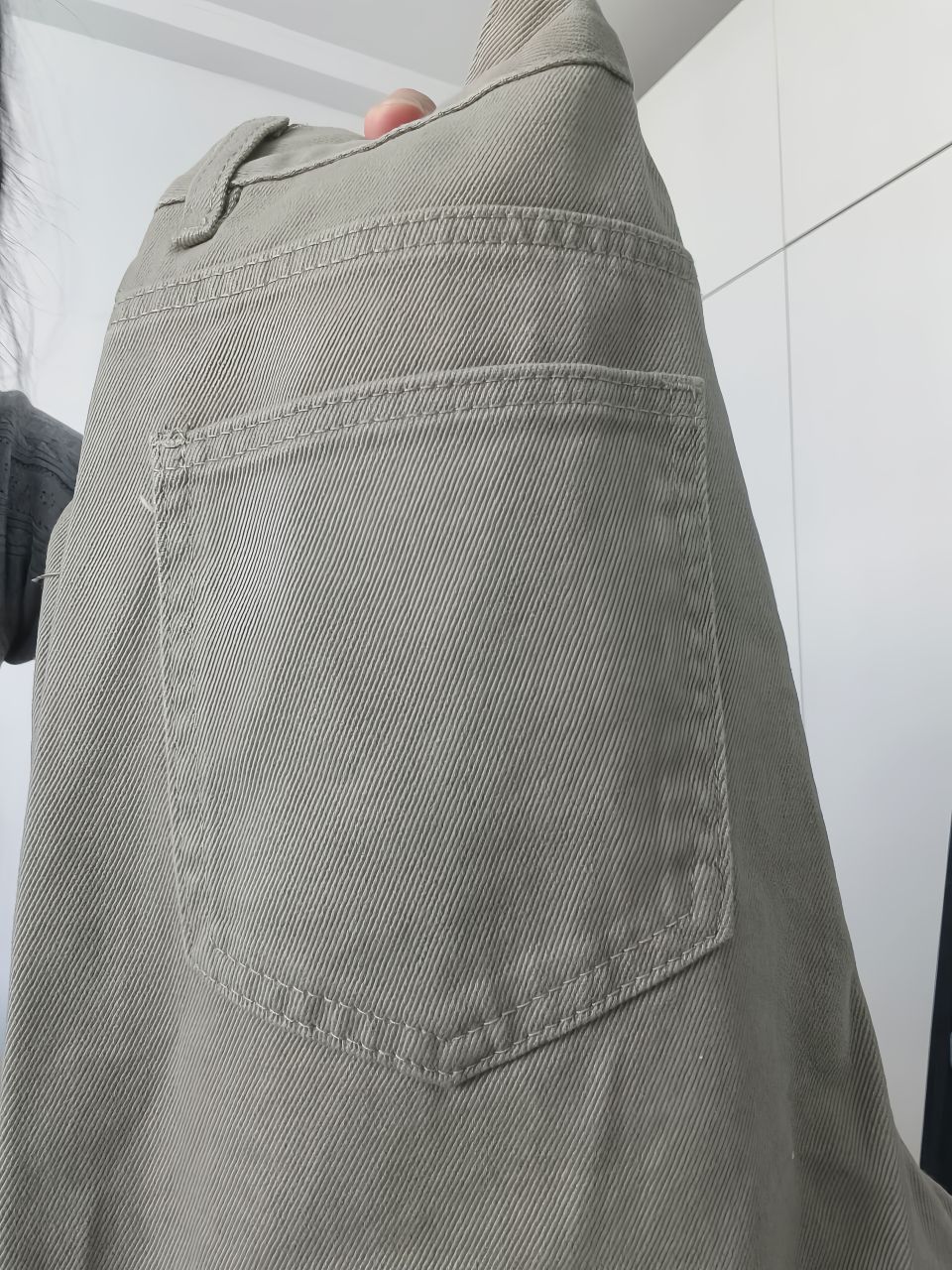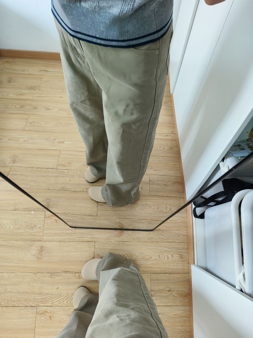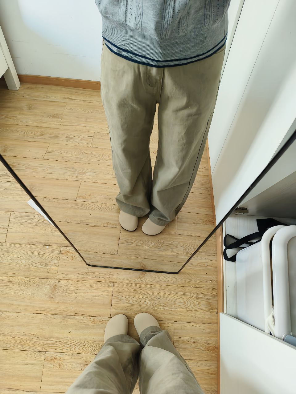 卡其色直筒裤很显瘦,面料很好,比较厚,适合秋天穿!随便搭配一件灰色短袖显得很休闲!
