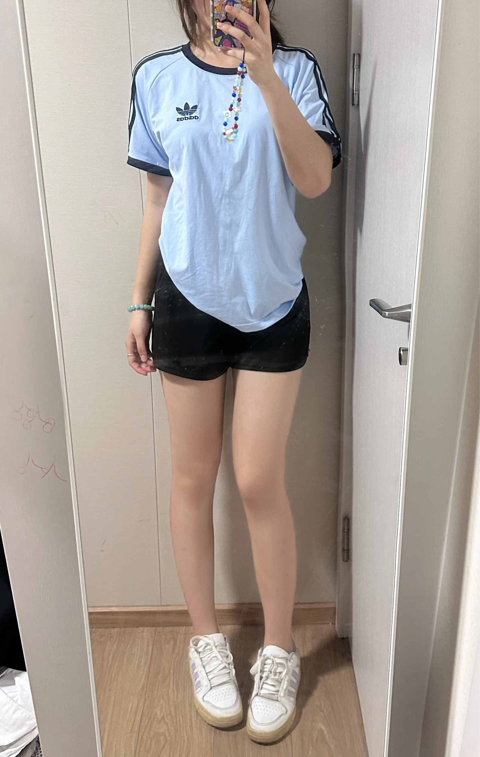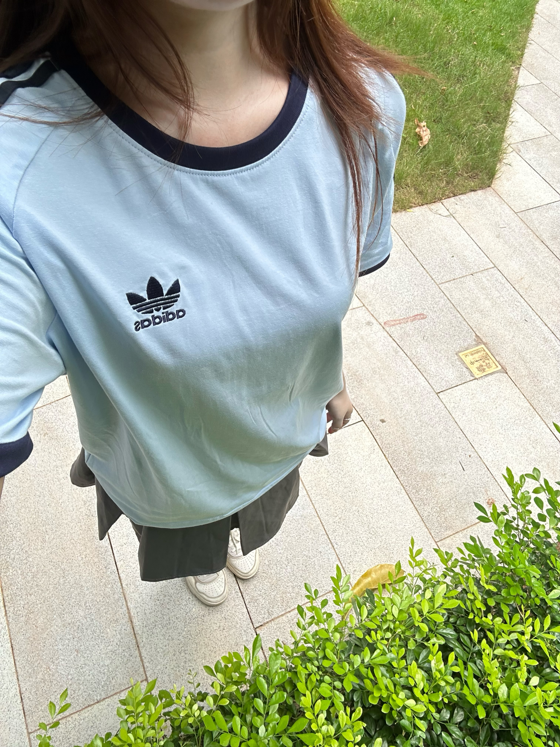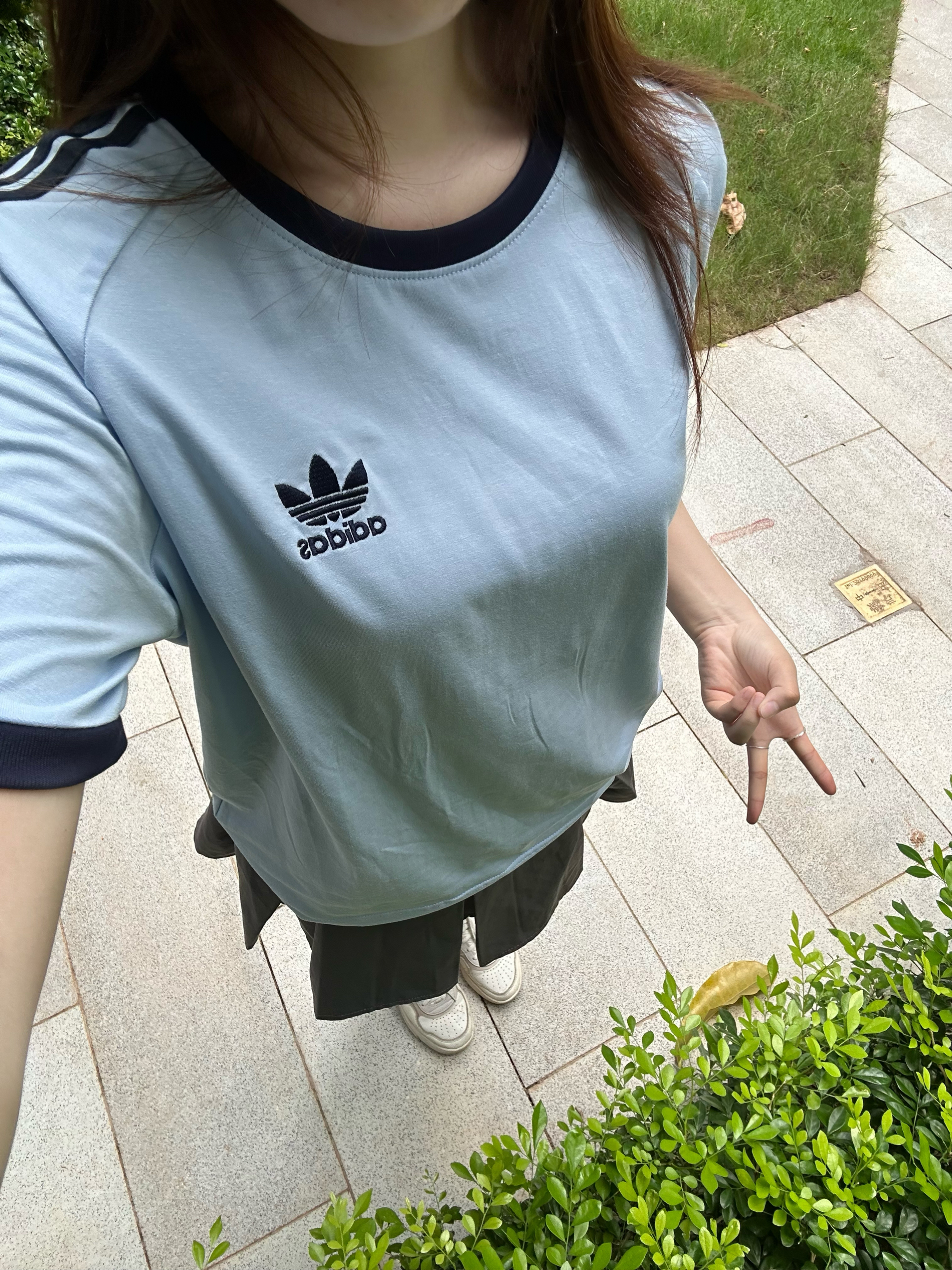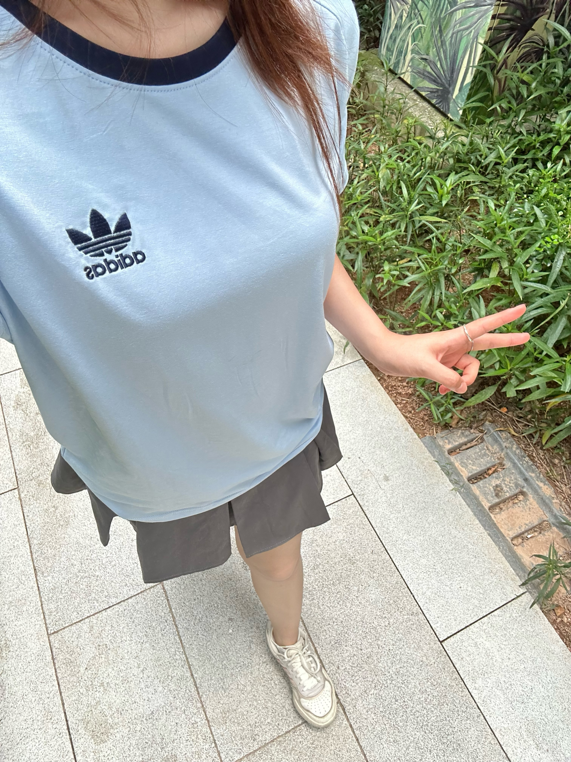 夏天穿浅蓝色是永远不会出错!视觉上就让人降温啦,蓝蓝的很安心😌,蓝色阿迪➕灰色短裙,显得整个人都淡淡的,让人心旷神怡的穿搭✔️