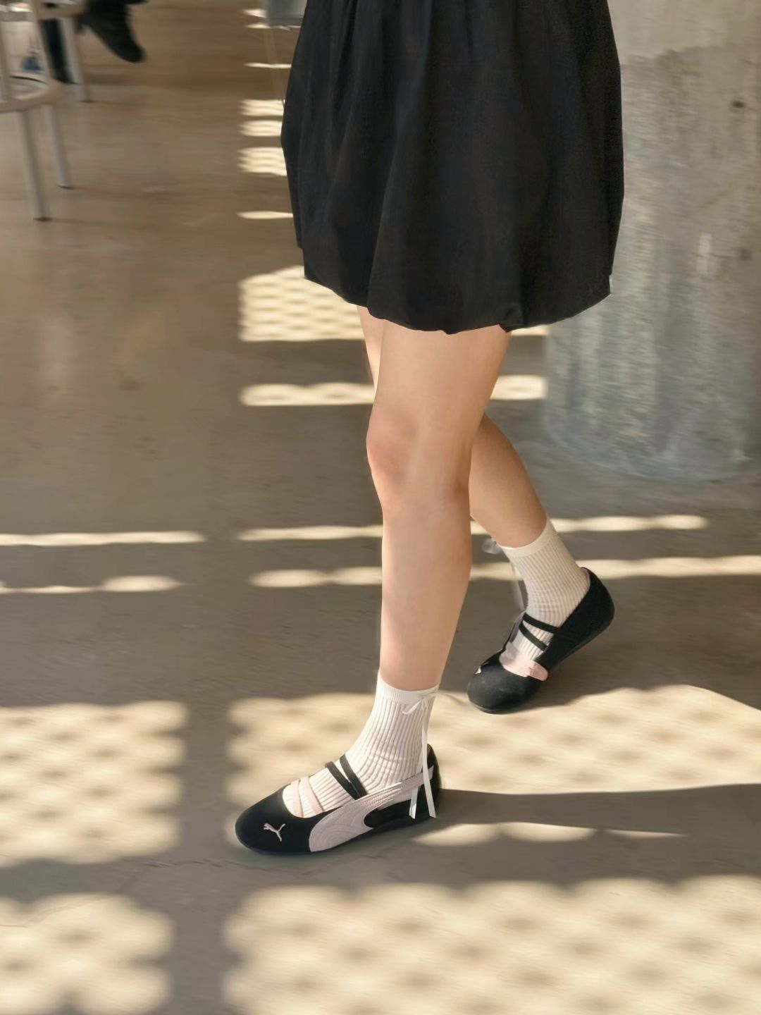 本来纠结银色和黑粉配色 但银色的鞋子有一双了 黑粉意外也很好搭 最近好流行芭蕾风呀 鞋子上脚还挺舒服的 就是夏天穿可能会热 感觉要配袜子才行 单穿就是老北京布鞋 #黑粉配色 #芭蕾风女孩 #puma #芭蕾鞋 #平底鞋 #粉色运动鞋 #运动少女风 #芭蕾风 #puma女鞋