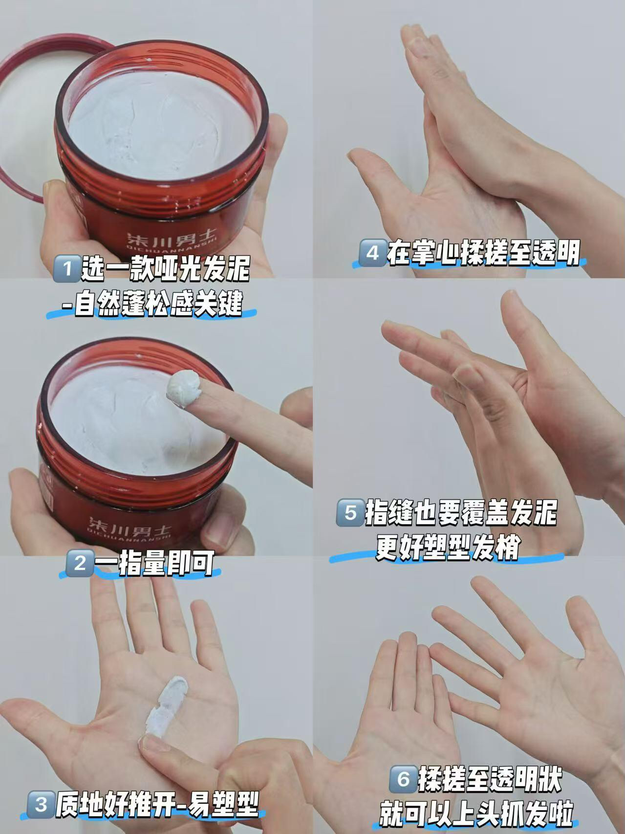 3. 发蜡塑形,捏出“尖刺感”!取黄豆大小哑光发蜡/发泥,在掌心彻底揉开、搓热。然后像“抓”头发一样, 重点涂抹在头顶区域和刚刚向上吹的那撮刘海上。手法是 用手指向上搓、捏出发束感,制造那种自然的、一根根微微立起的“尖刺”效果。不是整个头发都抹成刺猬!要的是顶部有立体的线条感。
