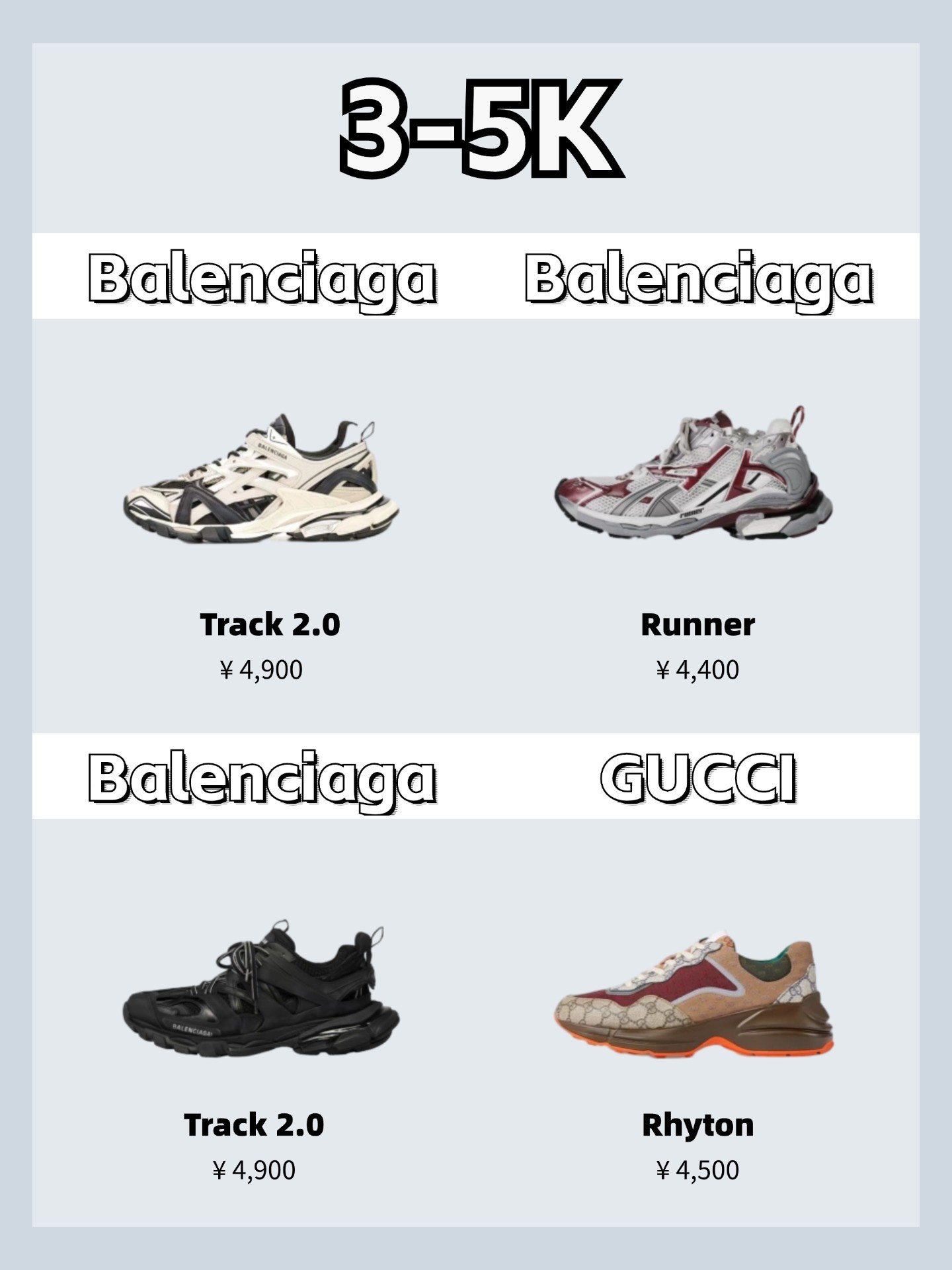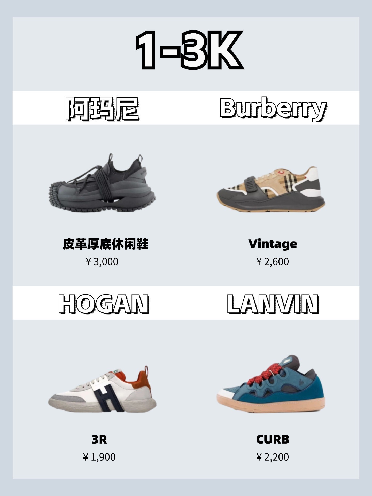 老爹鞋潮流的设计、独特的脚感 受到广大时尚人士的喜爱 今天兔兔就整理了20双适合男生的大牌老爹鞋 希望不同预算的伙伴们都能选到适合自己的爱鞋! 【0-1K】 ECCO潮趣 ADIDAS Ash Grey COACH TECH OGR异瞳GAZE 【1-3K】 阿玛尼皮革休闲鞋 HOGAN 3R Burberry Vintage LANVIN CURB 【3-5K】 Balenciaga Track...