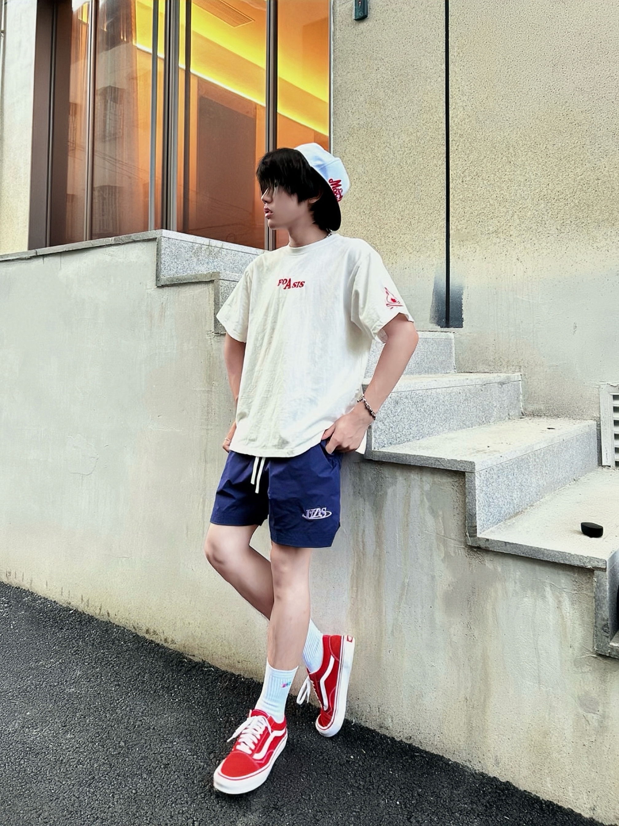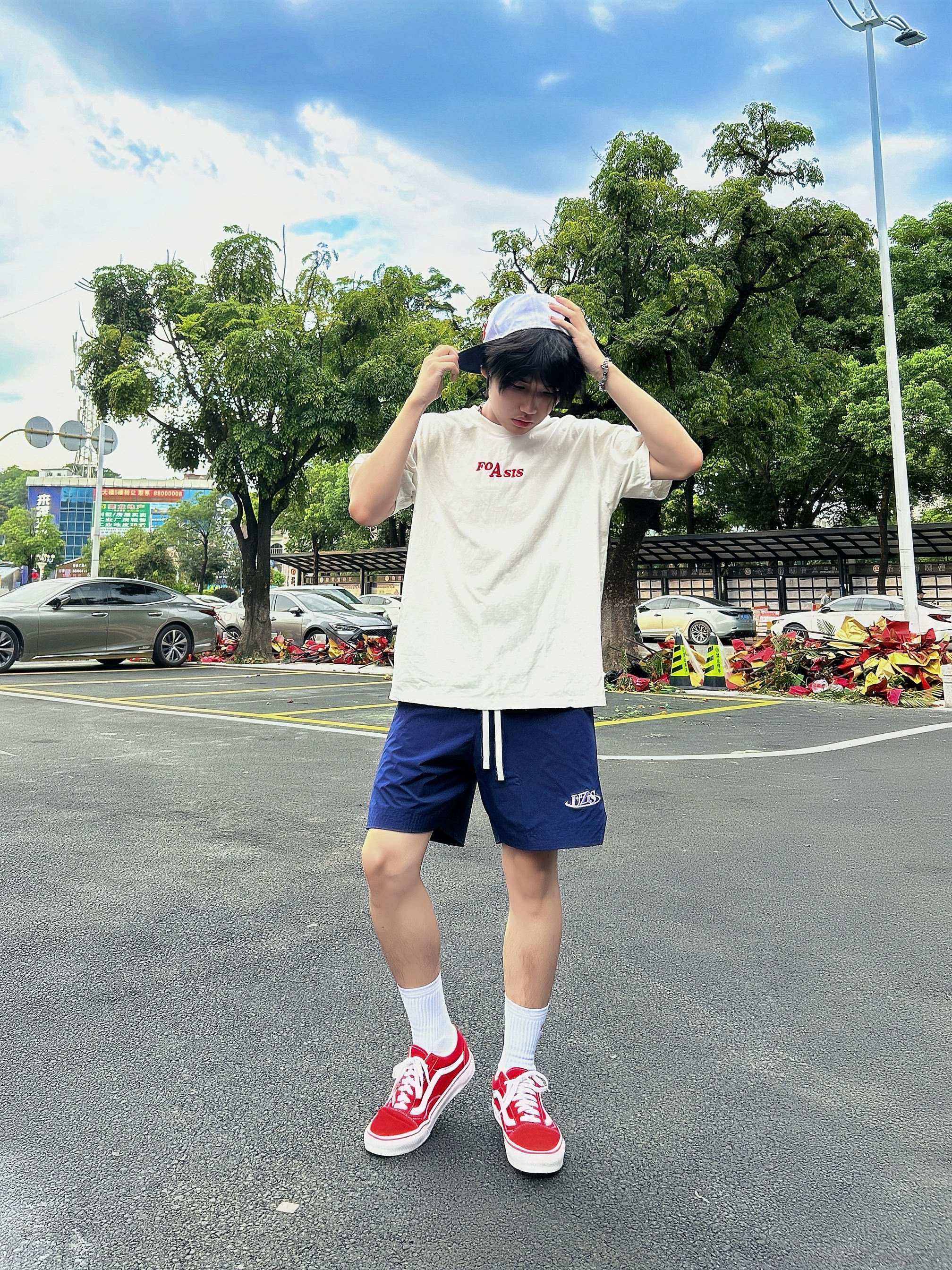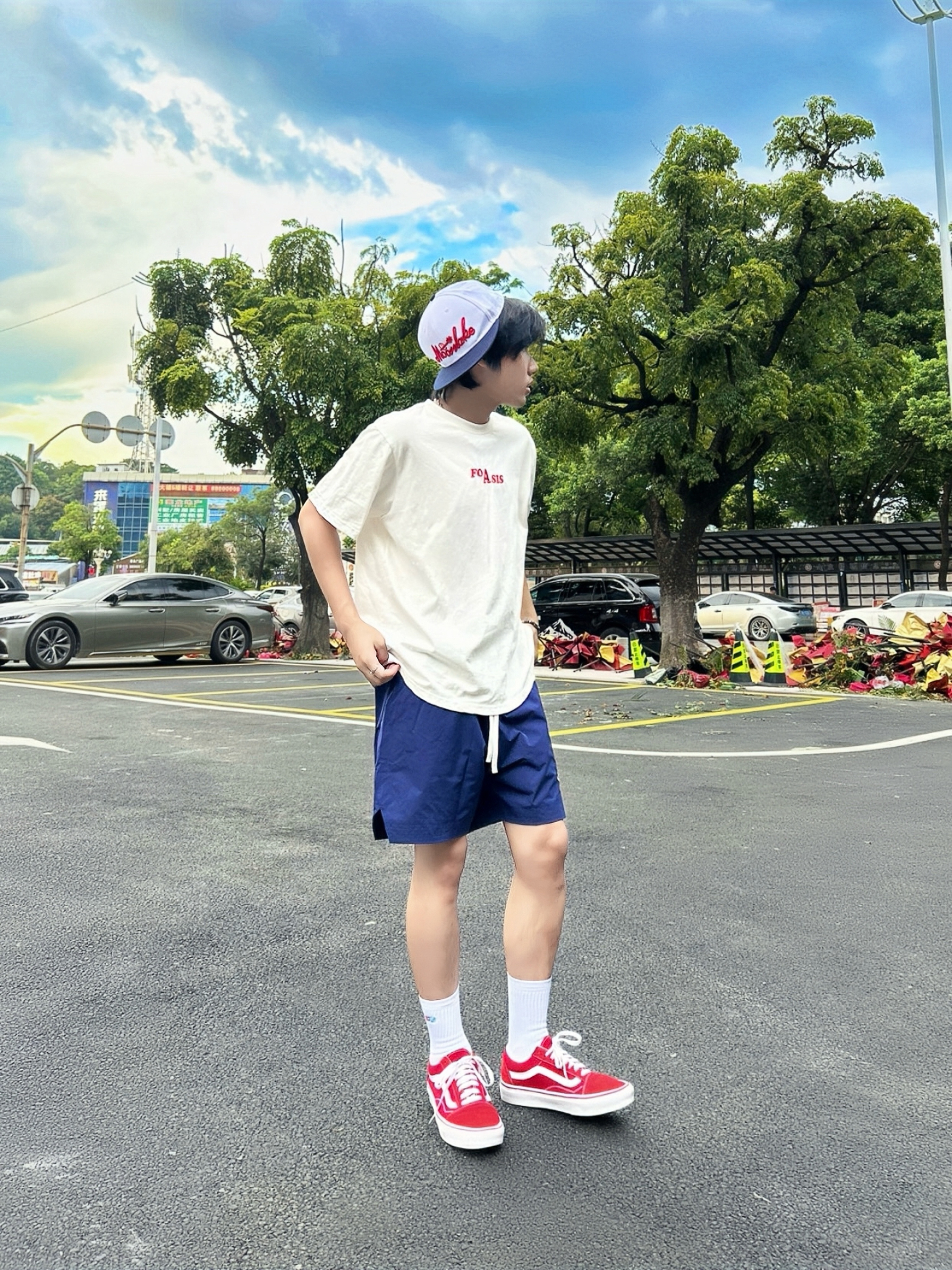 - 夏天总要当一次显眼包吧 哈哈 色彩碰撞就是最高效的帅气公式 今天来个红蓝白碰撞💥 白T打底搭配藏蓝短裤 速干属性隐形加分 脚踩红色帆布鞋呼应白T小面积红色 再来一顶藏青白色呼应全身的棒球帽 帽子反戴 谁有我帅 哈哈 男生不止黑白灰✖️ 这才是热夏街头该有的样子 帅?不过是顺手的事