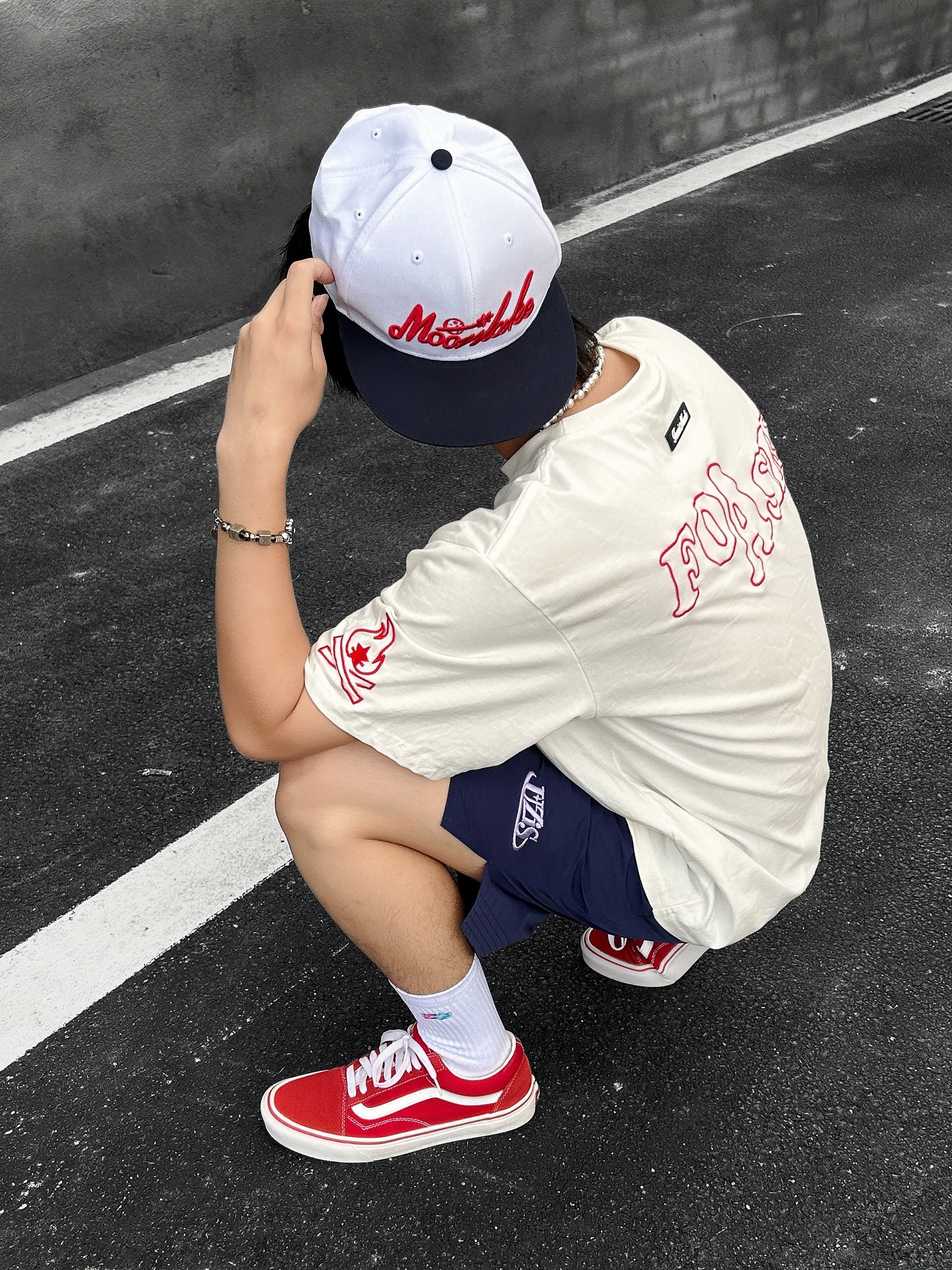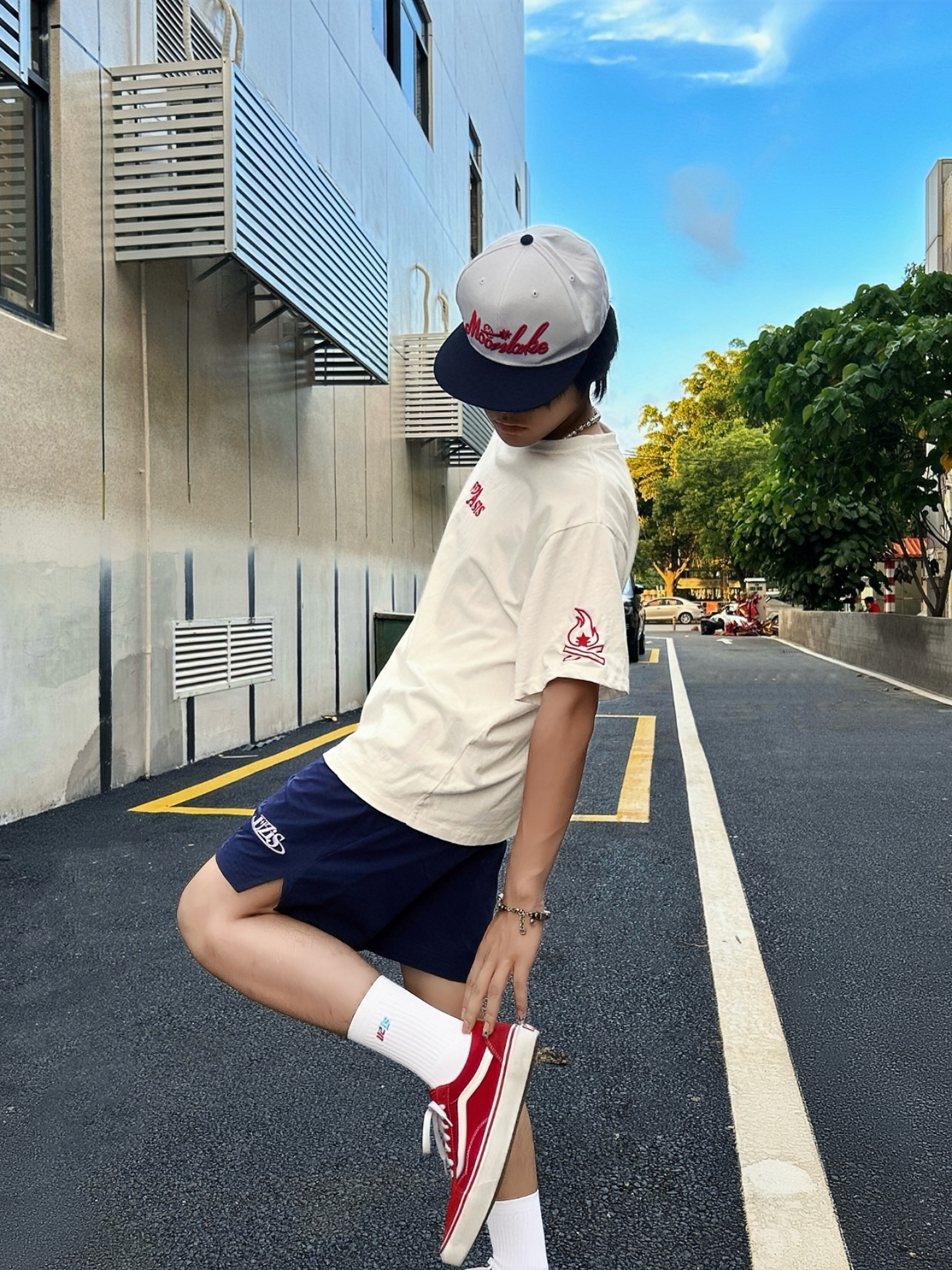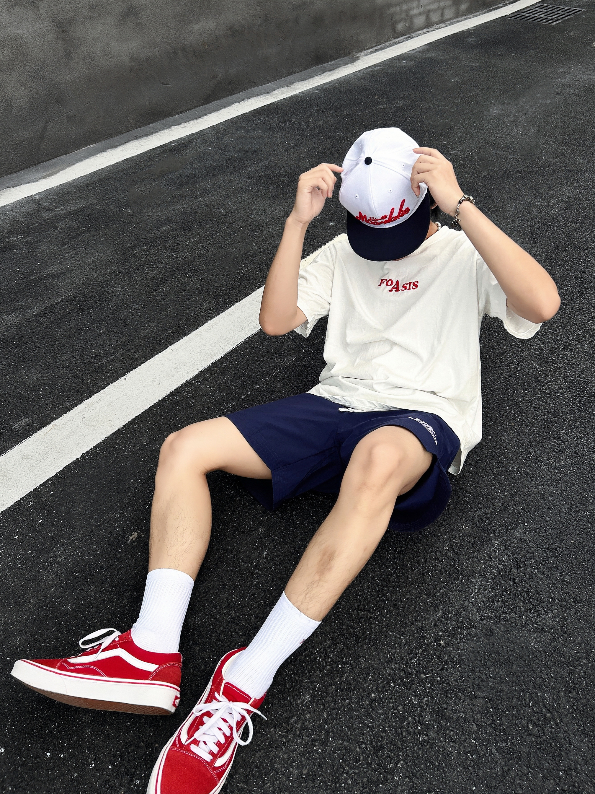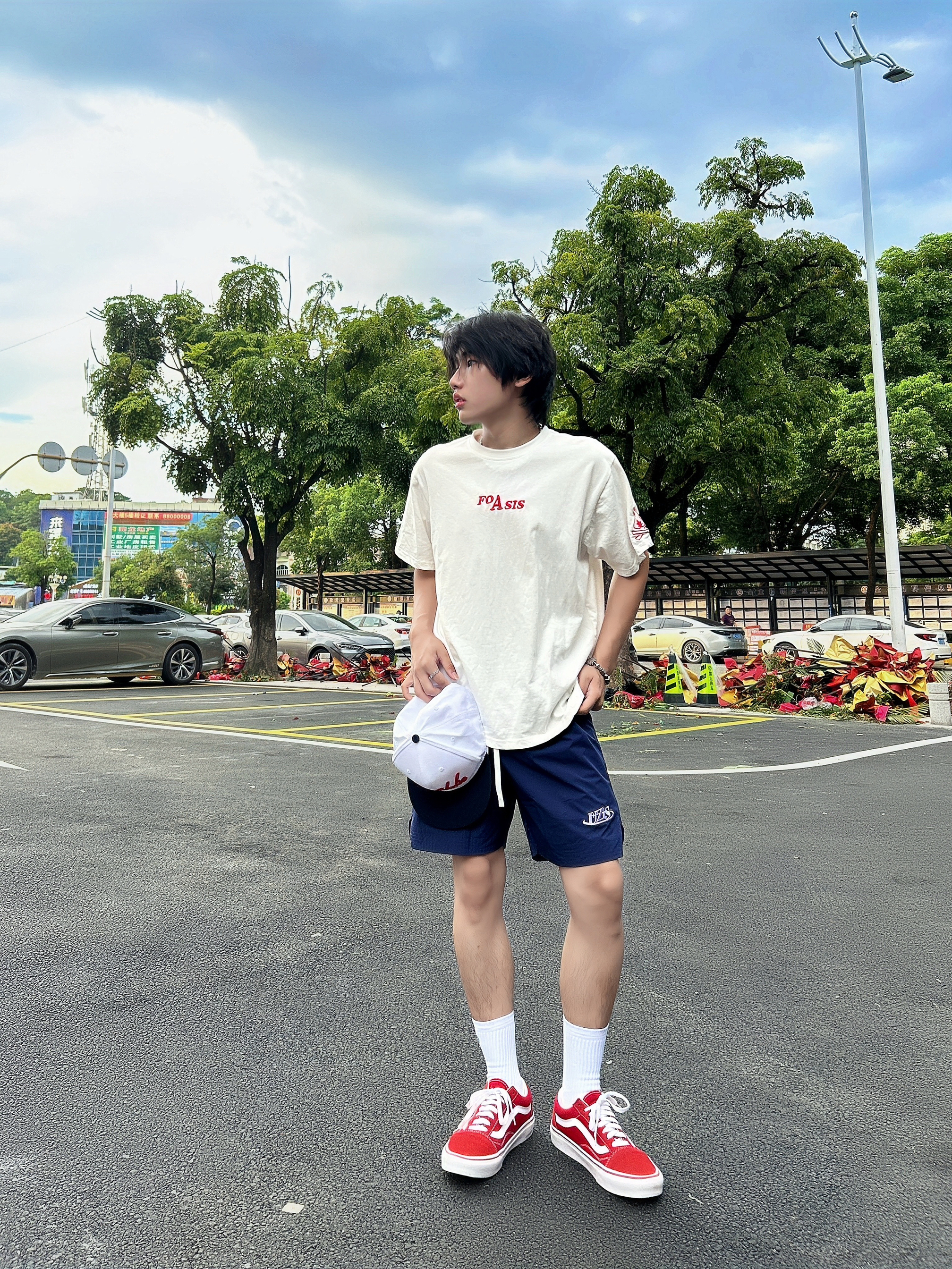 - 夏天总要当一次显眼包吧 哈哈 色彩碰撞就是最高效的帅气公式 今天来个红蓝白碰撞💥 白T打底搭配藏蓝短裤 速干属性隐形加分 脚踩红色帆布鞋呼应白T小面积红色 再来一顶藏青白色呼应全身的棒球帽 帽子反戴 谁有我帅 哈哈 男生不止黑白灰✖️ 这才是热夏街头该有的样子 帅?不过是顺手的事
