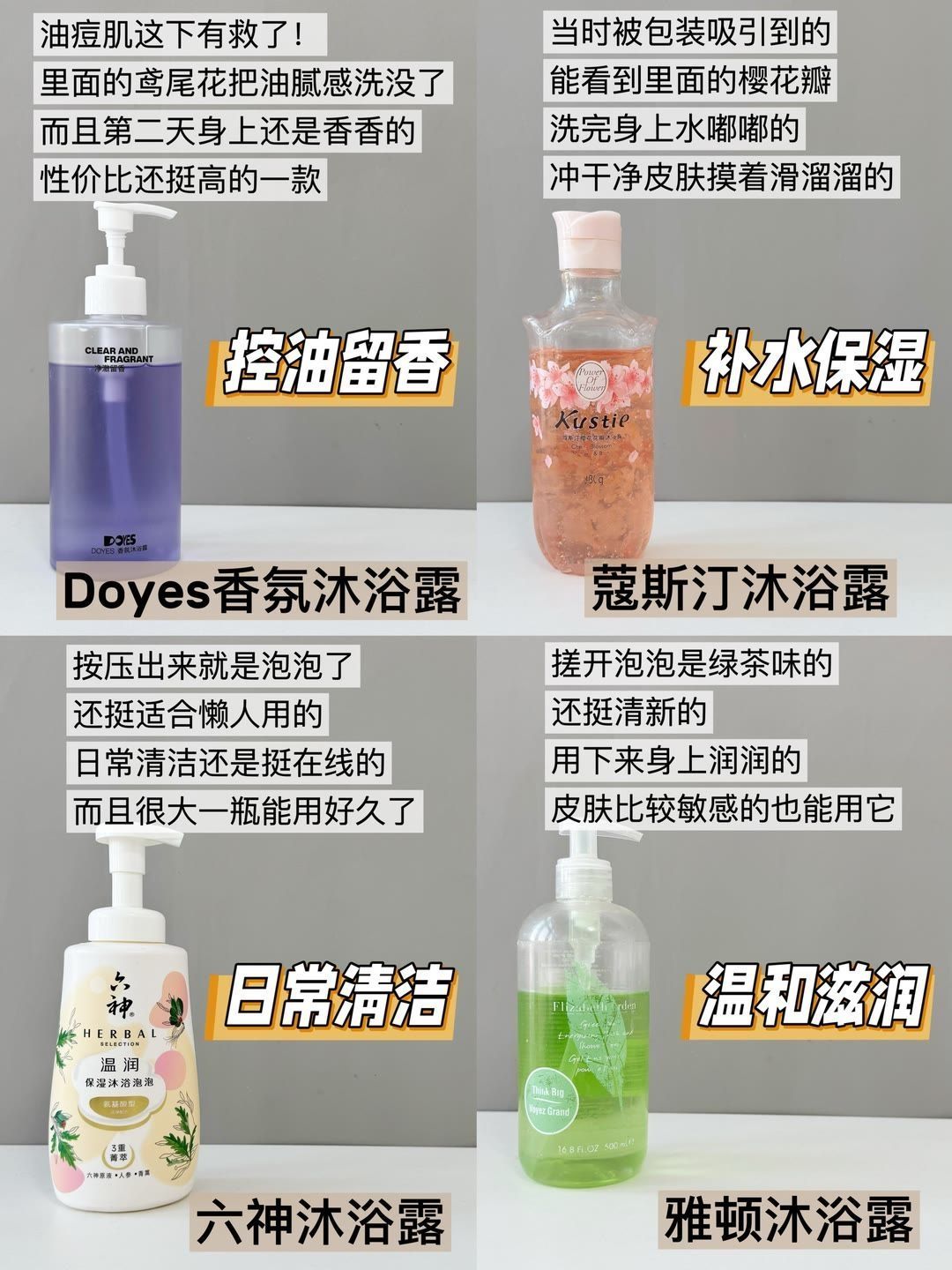 干货整理!热门控油沐浴露看这篇不走弯路! 沐浴露推荐/沐浴露排行榜/控油沐浴露/后背痘/沐浴露测评/平价沐浴露/学生党/双十一购物清单 来来回回踩雷那么多次总结出来了不少选沐浴露经验!大家千万别再跟风了~ 一定要根据自己的肤质选择才是最香的! 今天来给大家分享几款热门的平价控油沐浴露,有需要的姐妹抓紧抄作业啦! - Doyes香氛沐浴露——控油留香 蔻斯汀沐浴露——补水保湿 六神沐浴露——日常清...
