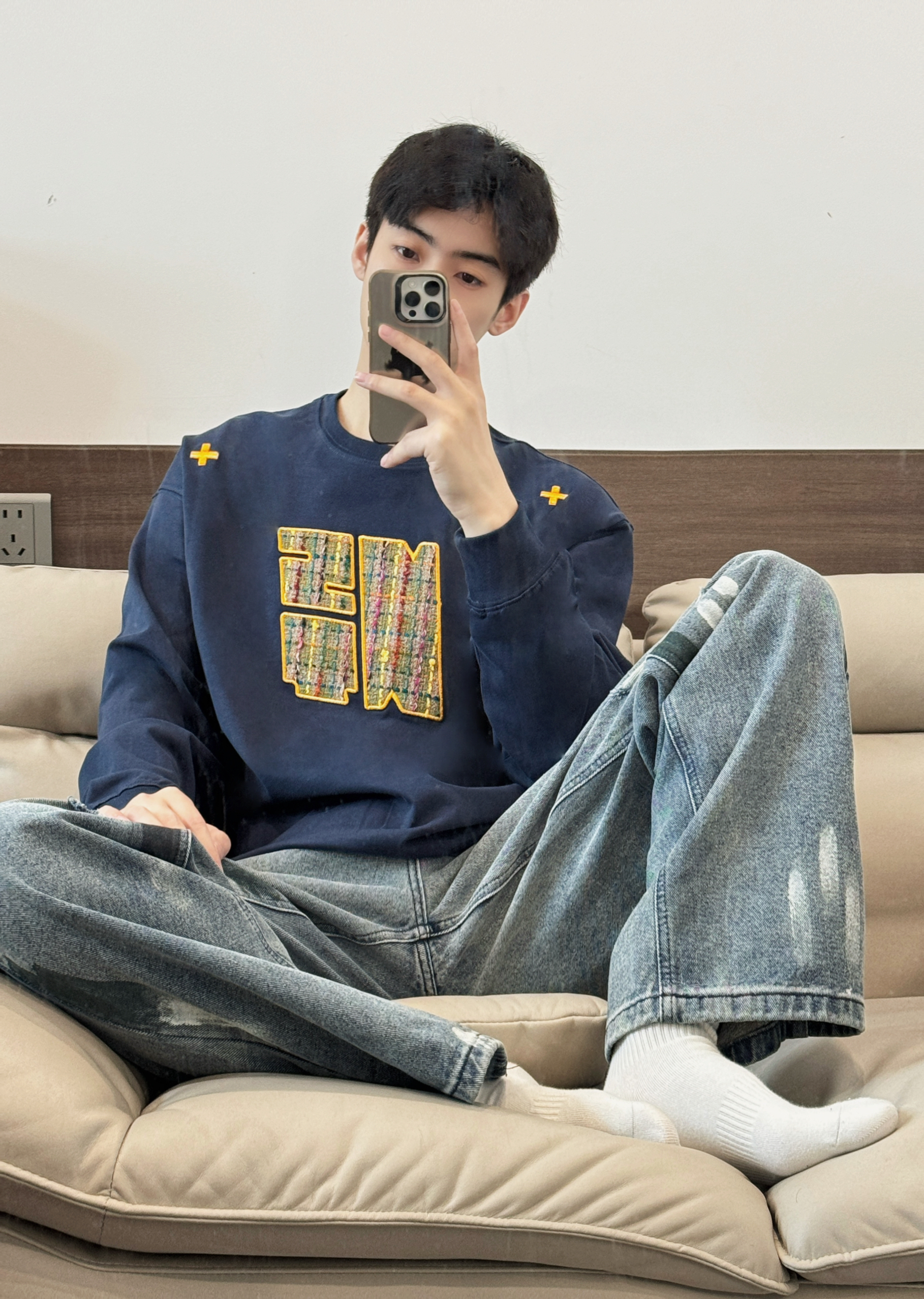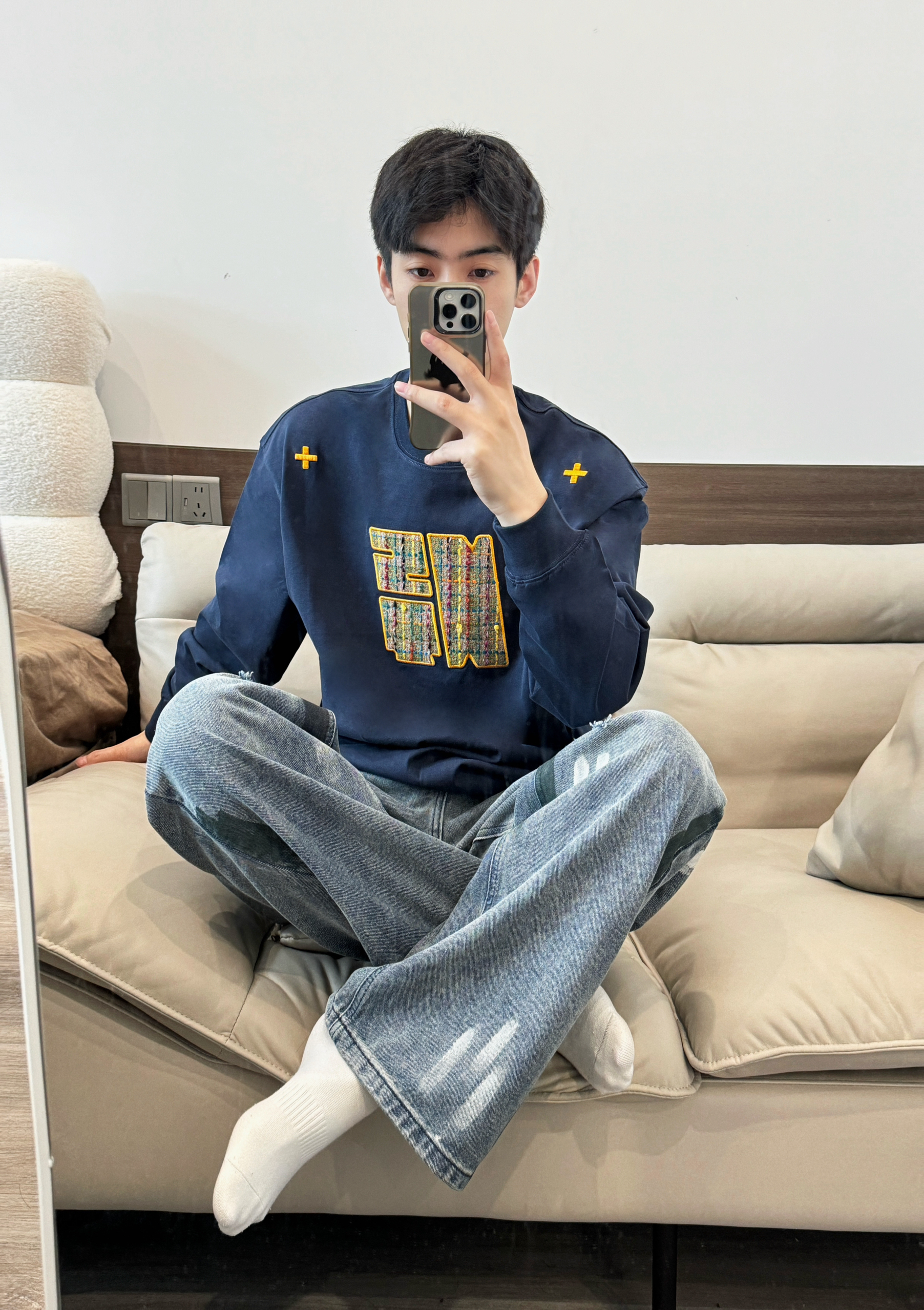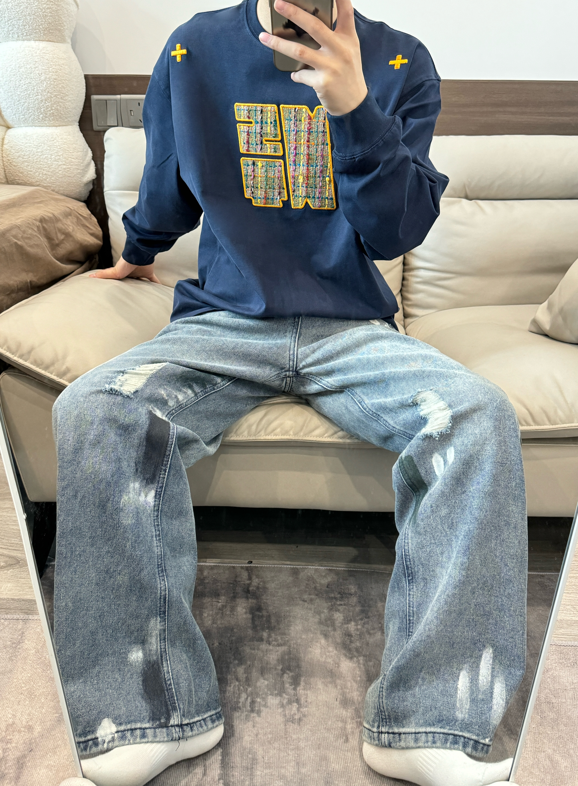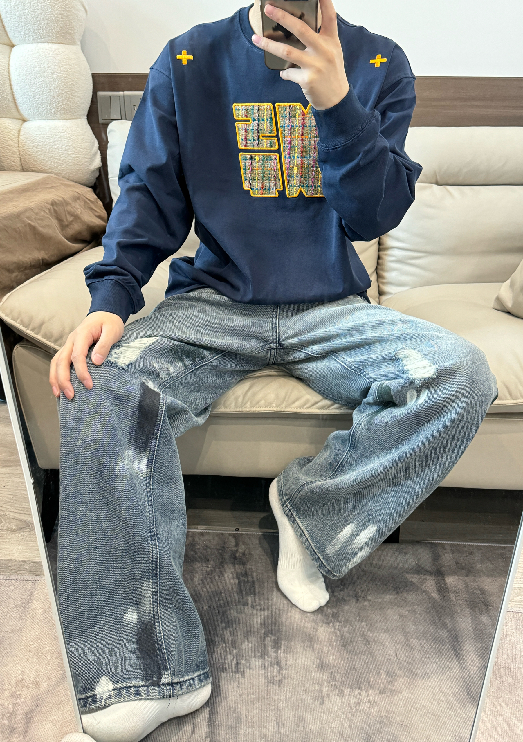 今日份穿搭 ⬇️ 没事T恤➕破洞牛仔裤👖 上身是NSTNEW START家的T恤~ 藏青色打底胸前logo和肩上十字架刺绣我很喜欢🥰 再搭配浅色牛仔裤 一整个美式大男孩😎