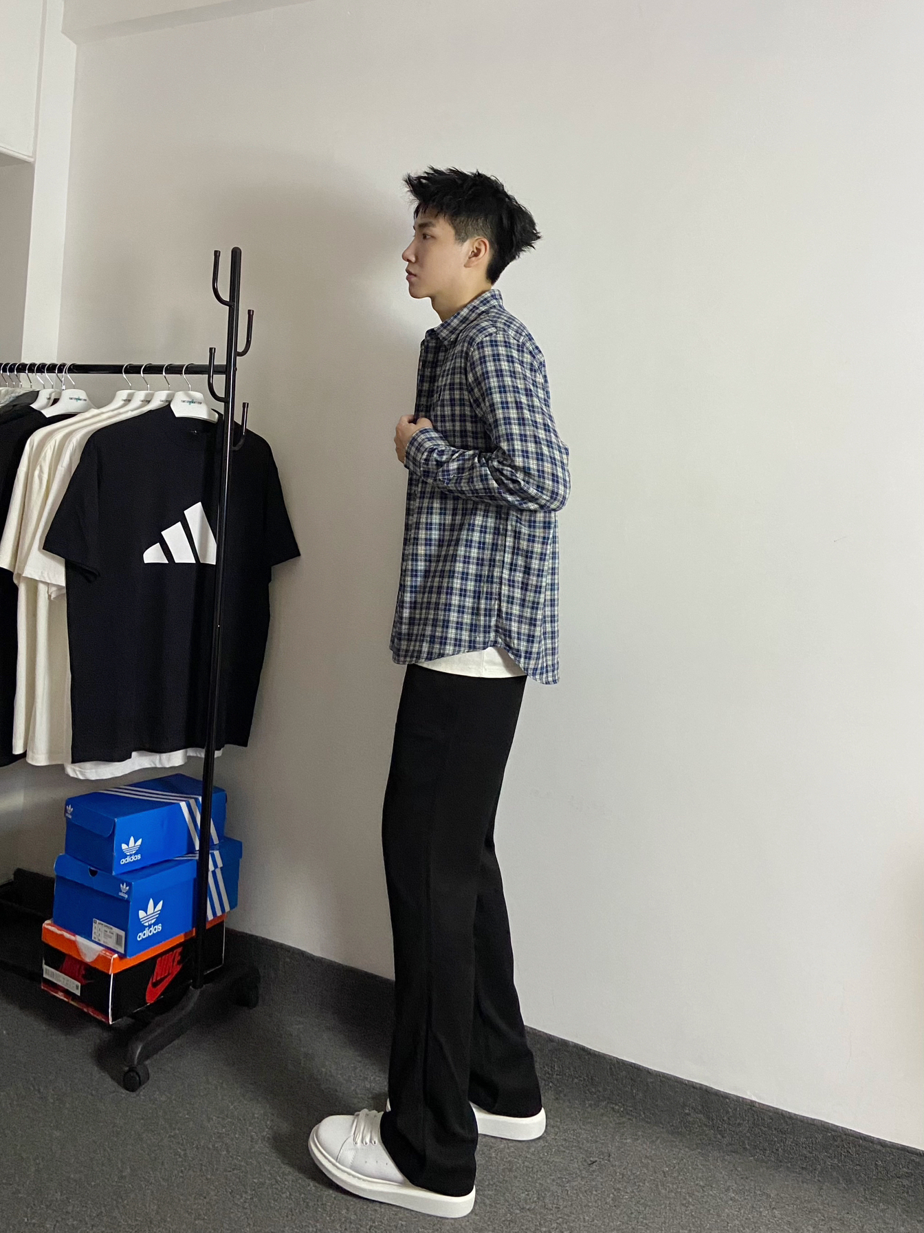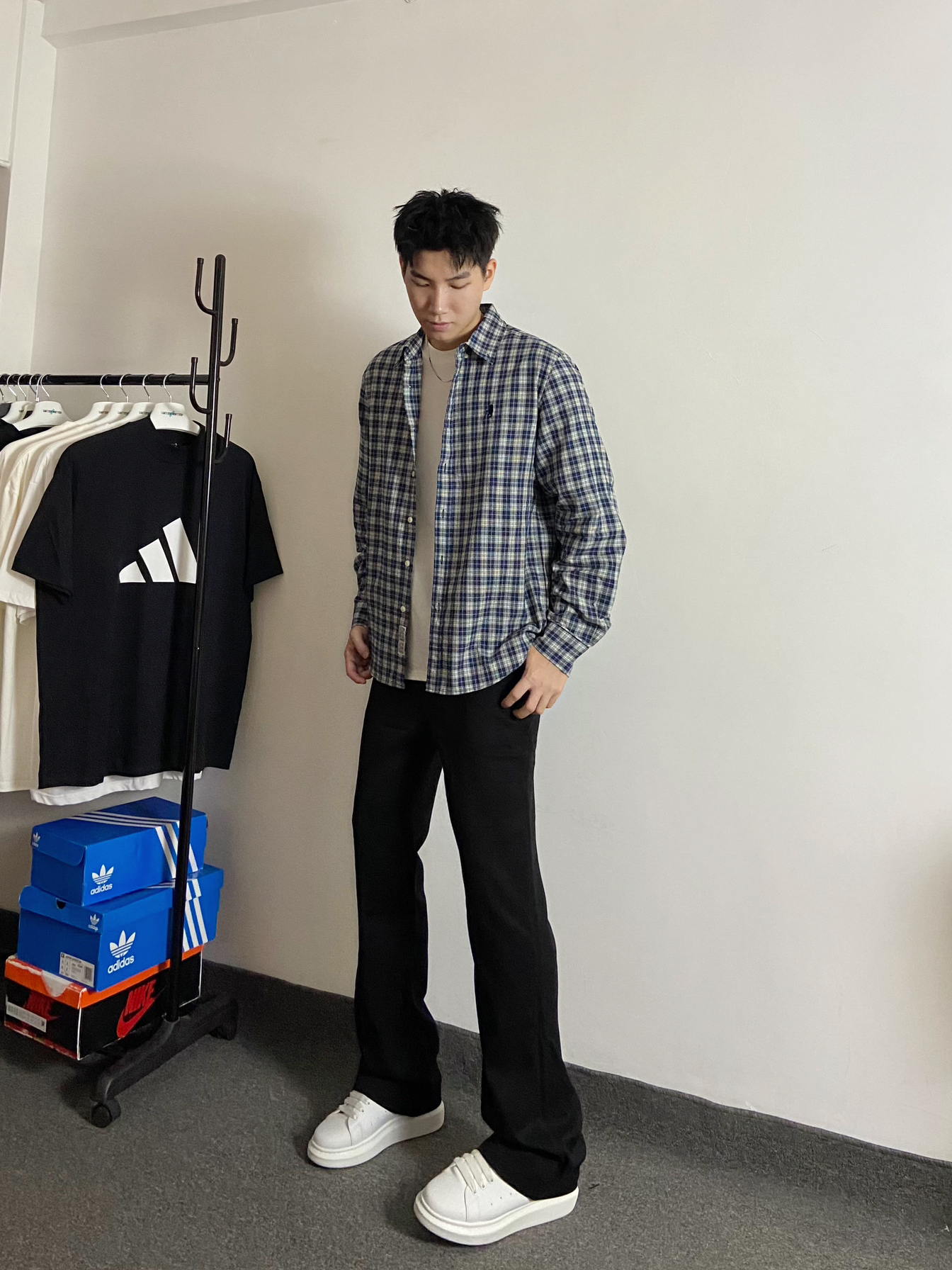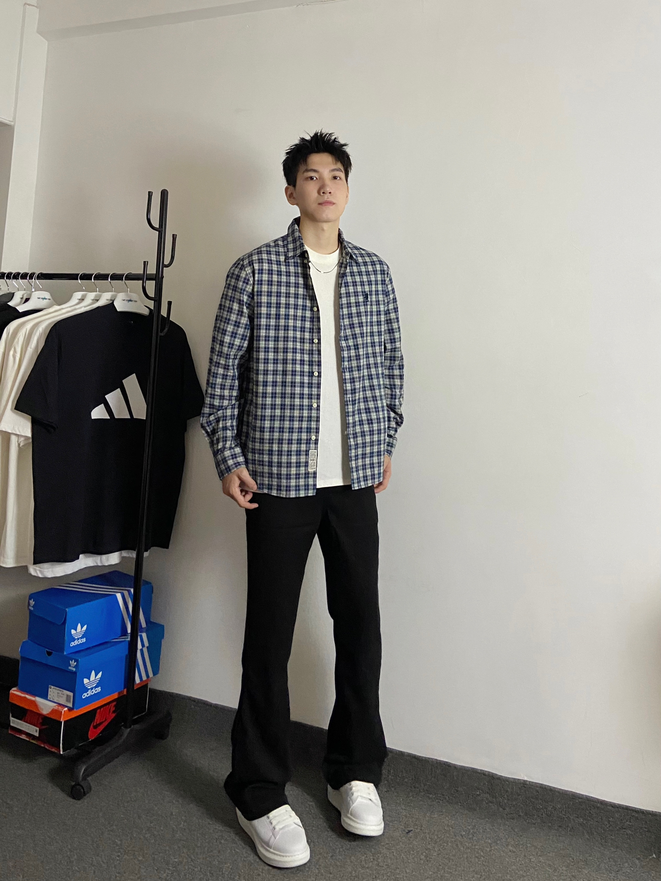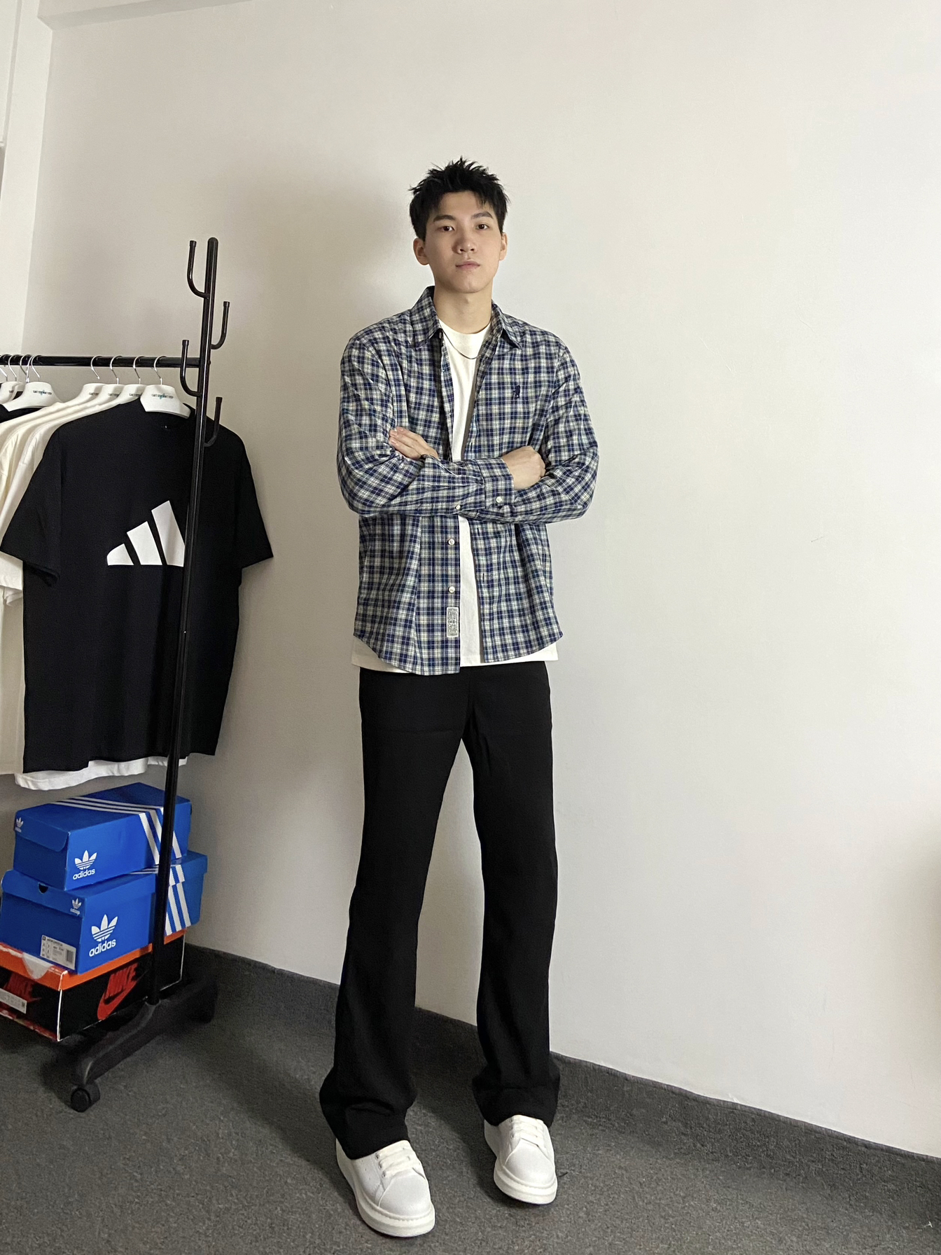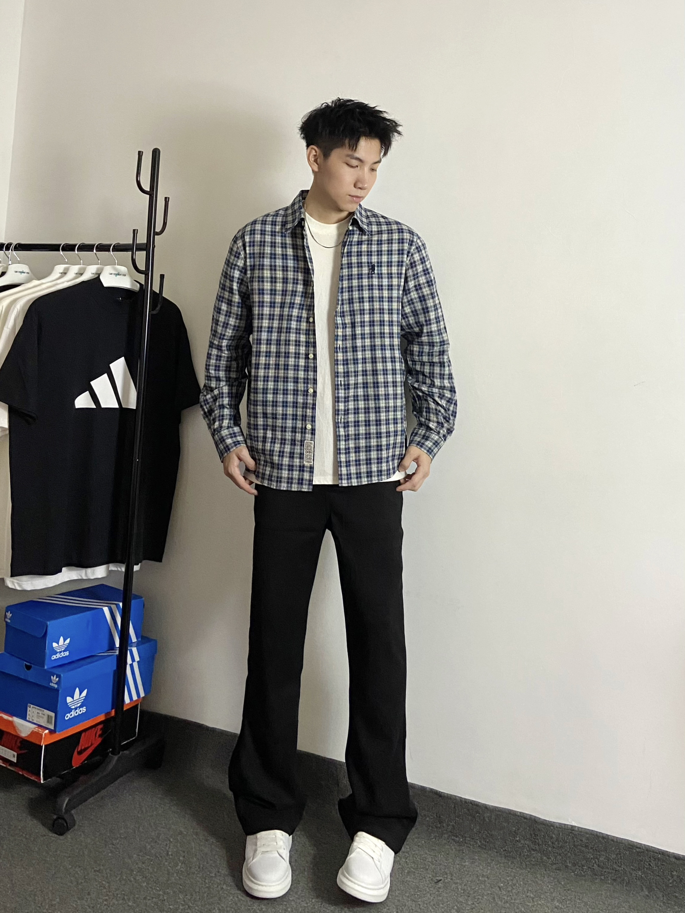 身高|体重:181|130 今日份穿搭: - 上衣选择一件常青系列衬衫 格纹设计上身很有高级感,搭配胸前小熊标细节满满 内搭一件白色打底衫 - 裤子搭配一件修身版型黑色休闲直筒裤 入秋干净高级的一套!