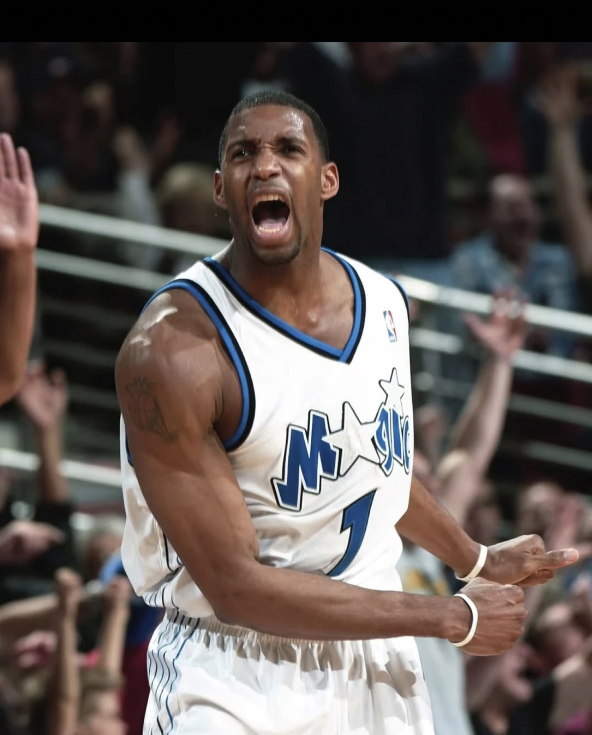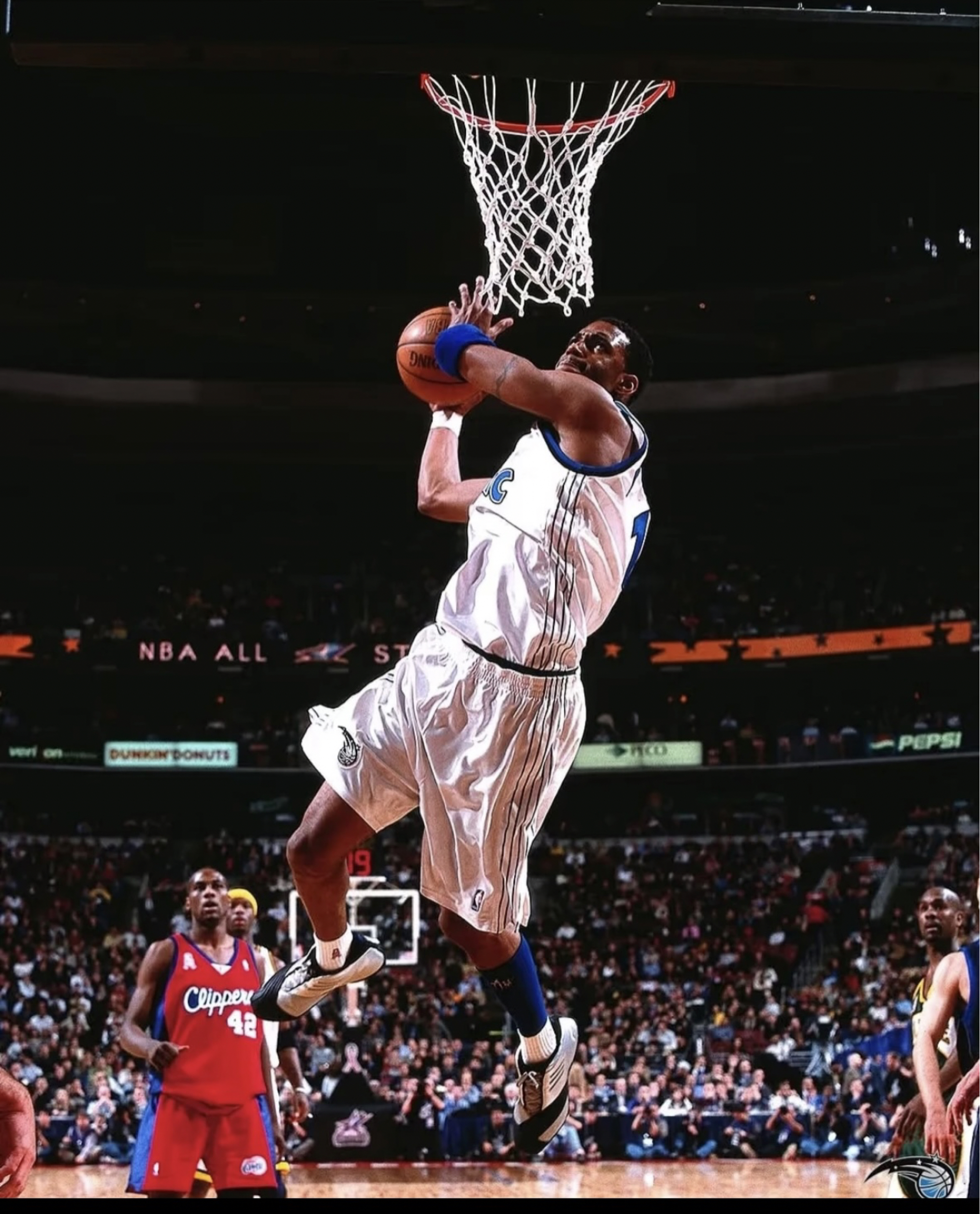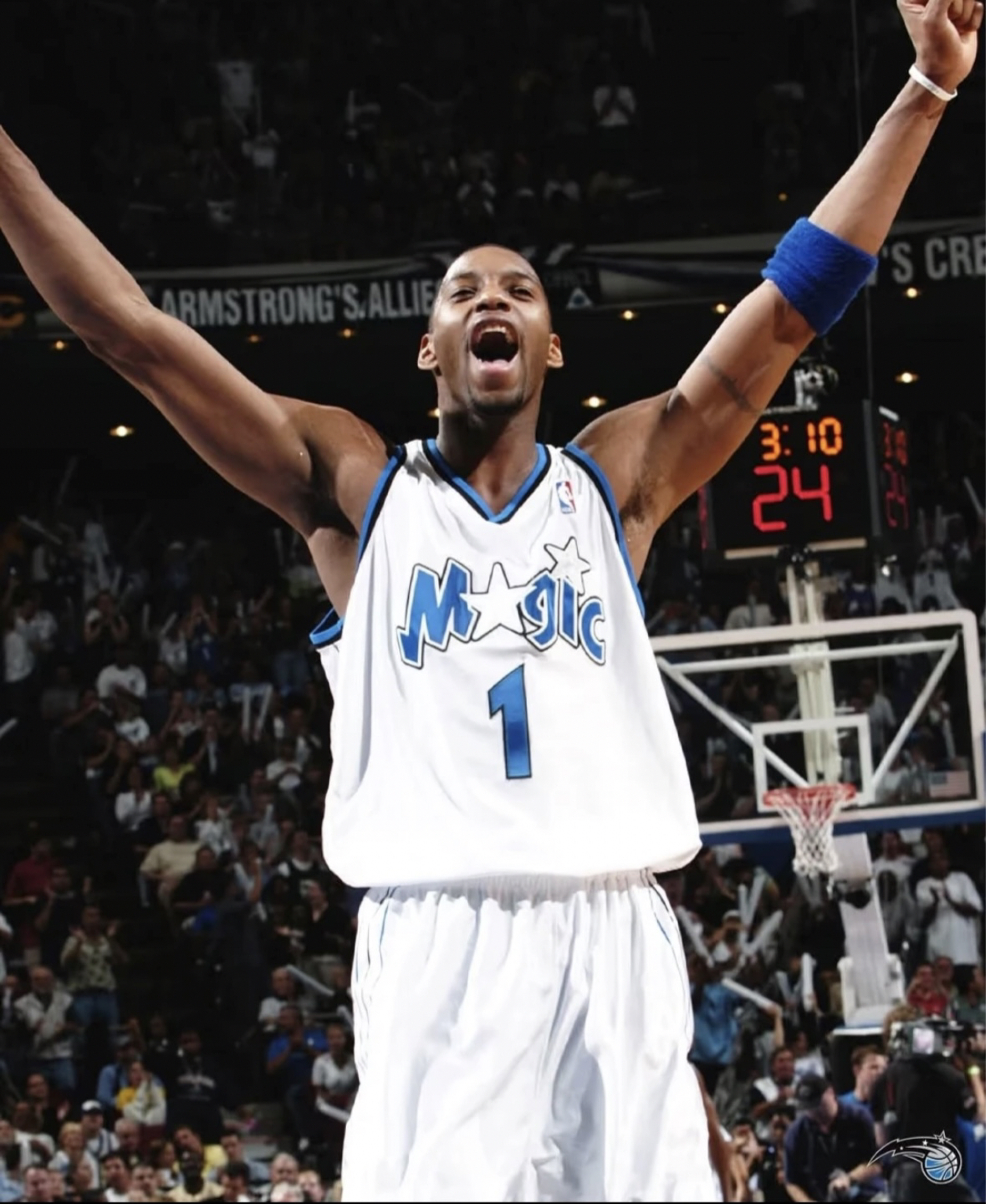 麦迪:奥兰多球场上的灵动传奇 在奥兰多魔术队的主场球馆,特雷西·麦克格雷迪(Tracy McGrady ,简称麦迪 )再次成为焦点。当他身着印有 “MAGIC” 与数字 “1” 的白色战袍踏上赛场,那标志性的干拔跳投前奏——运球、沉肩、起势,便点燃了球迷的热情。 面对对手严密防守,麦迪展现出超强个人能力。他的第一步启动极具威胁,节奏变化让防守者难以招架,突破时如利刃直插腹地,遭遇包夹又能冷静分...