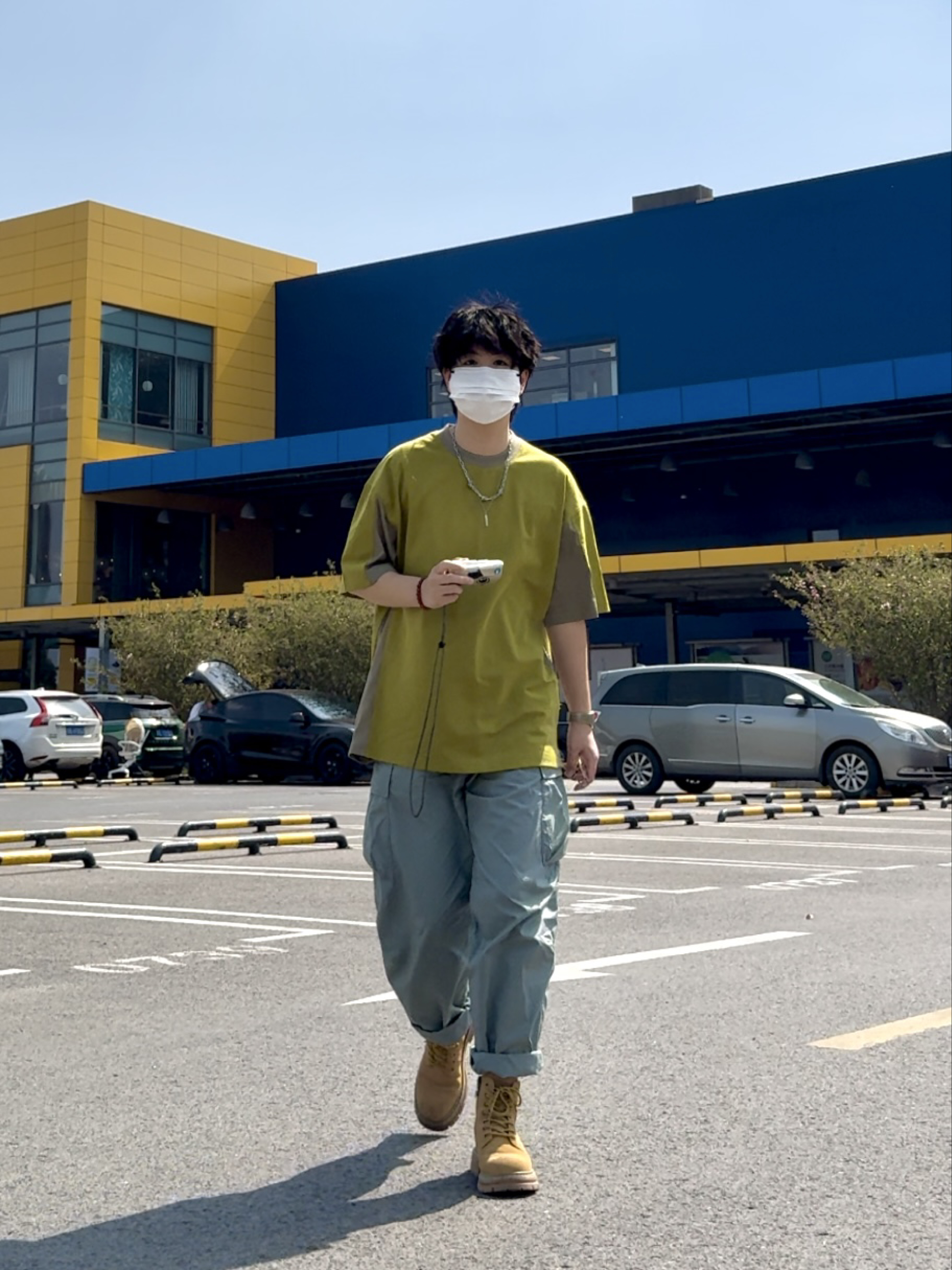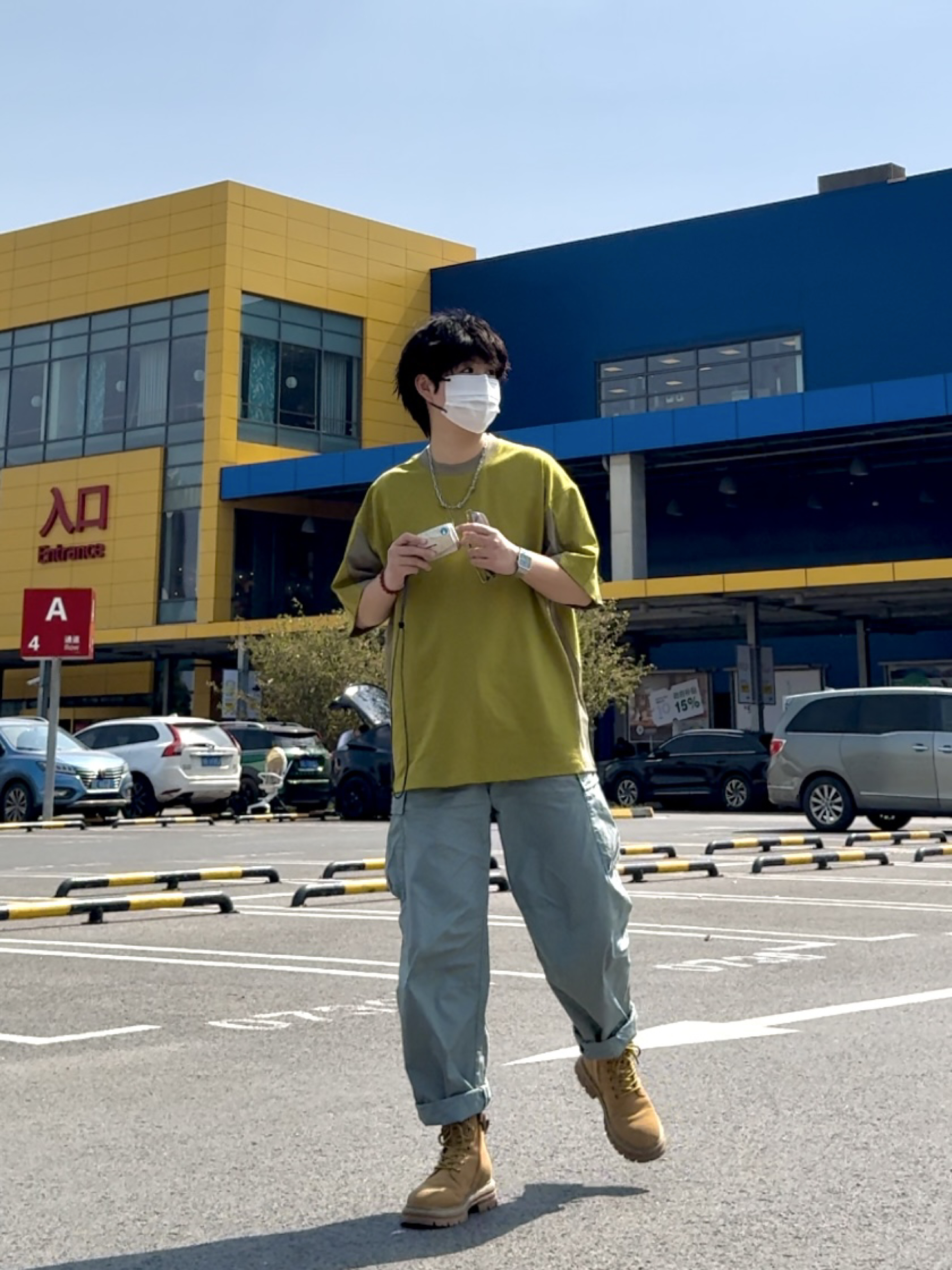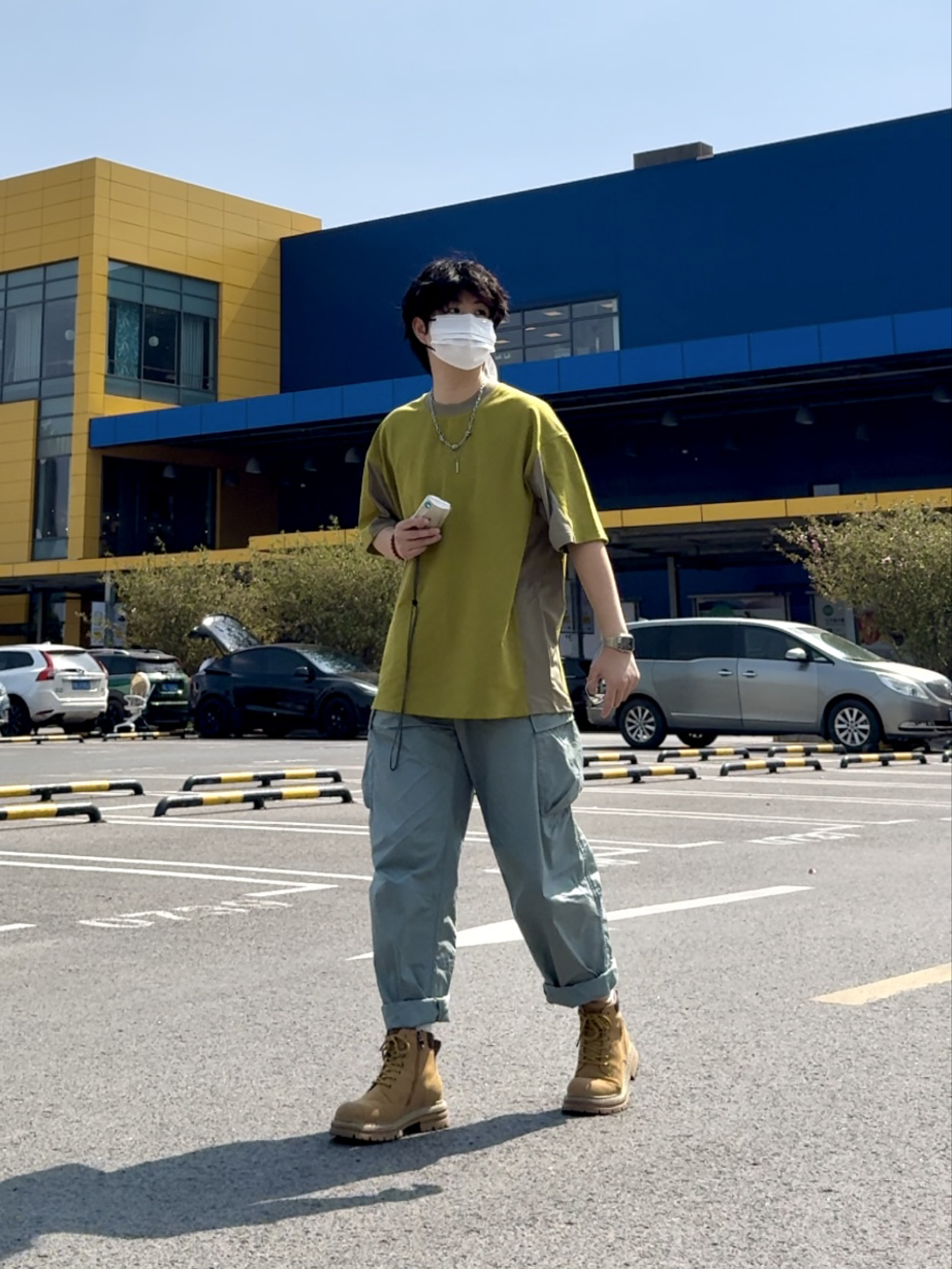 今日穿搭 优衣库的夏日薄款工装裤 大黄靴 浅黄拼色的户外T恤