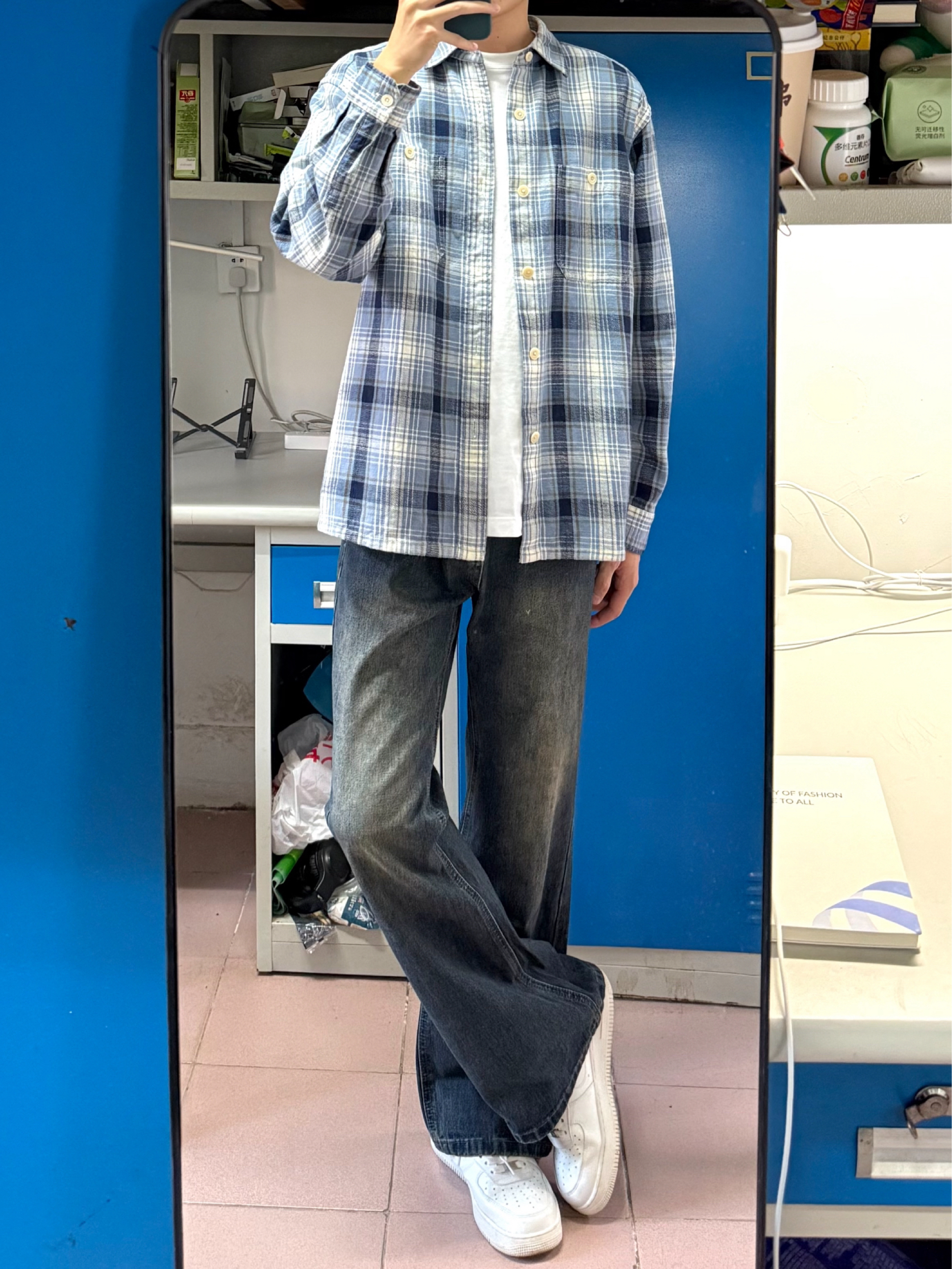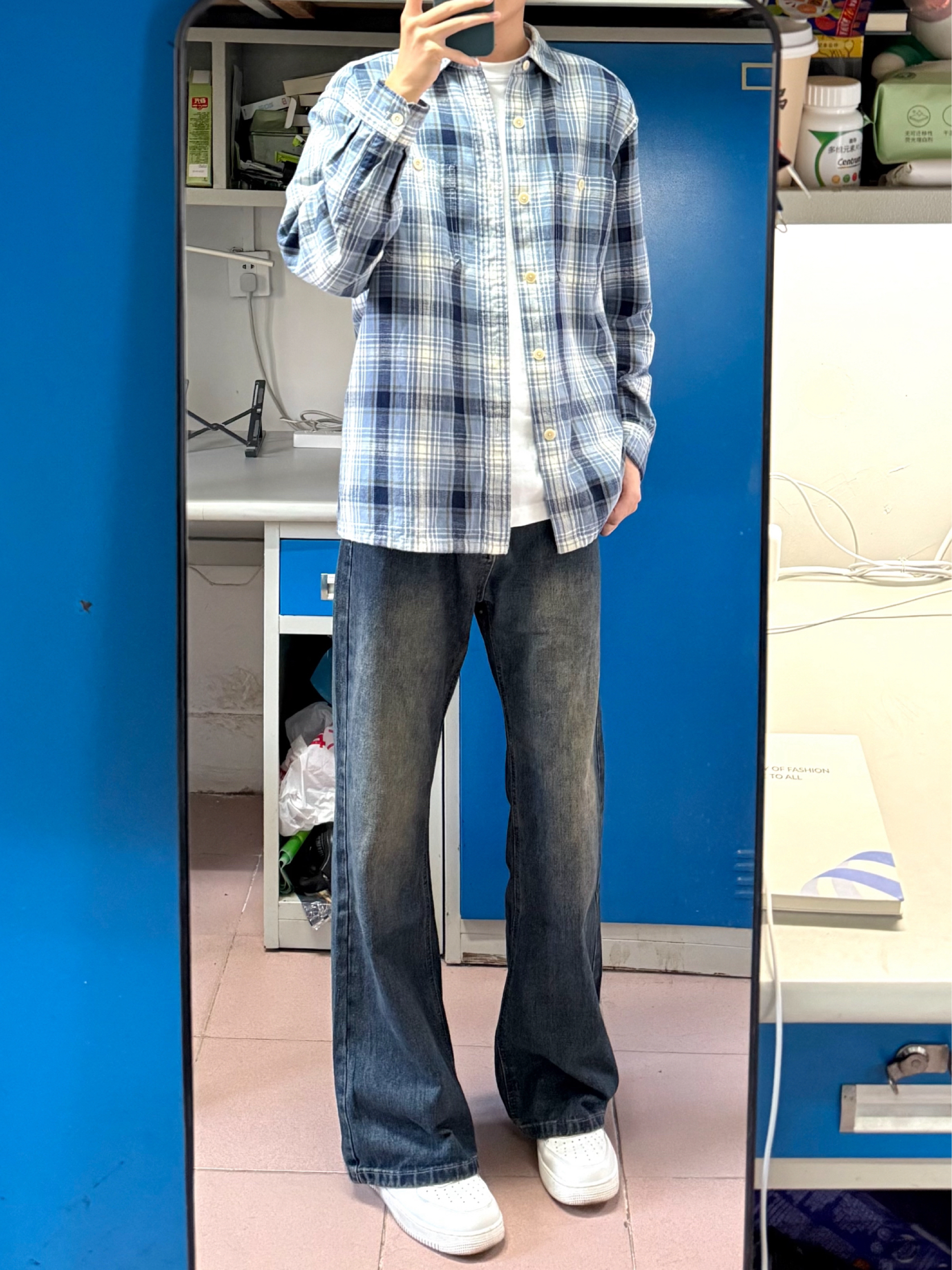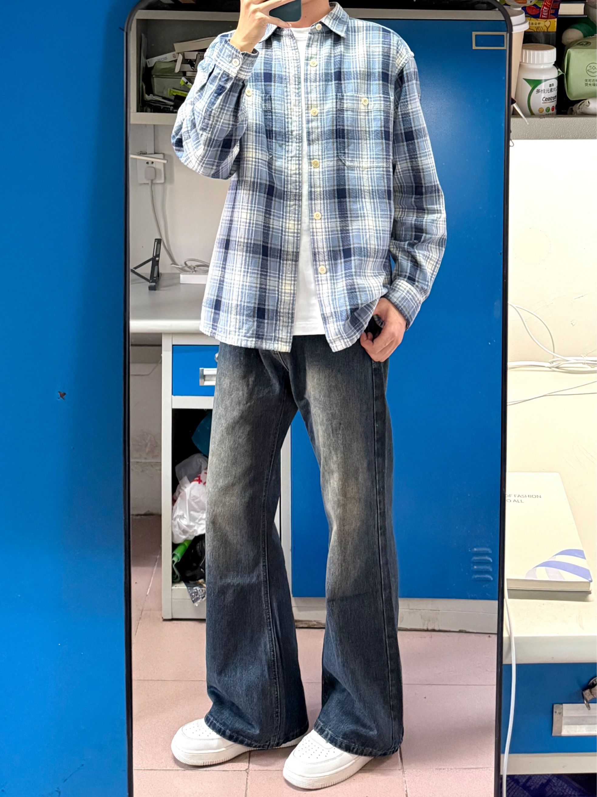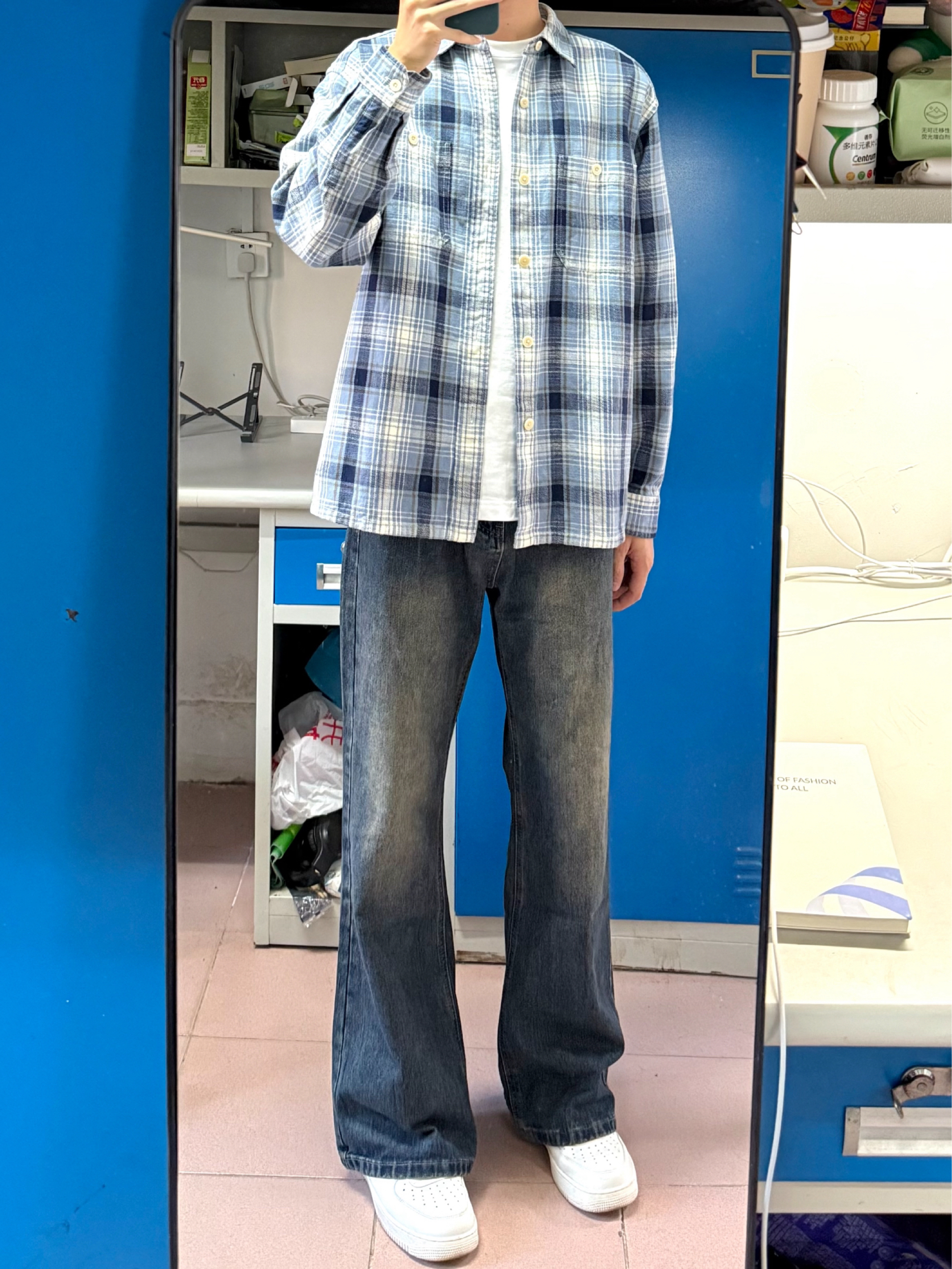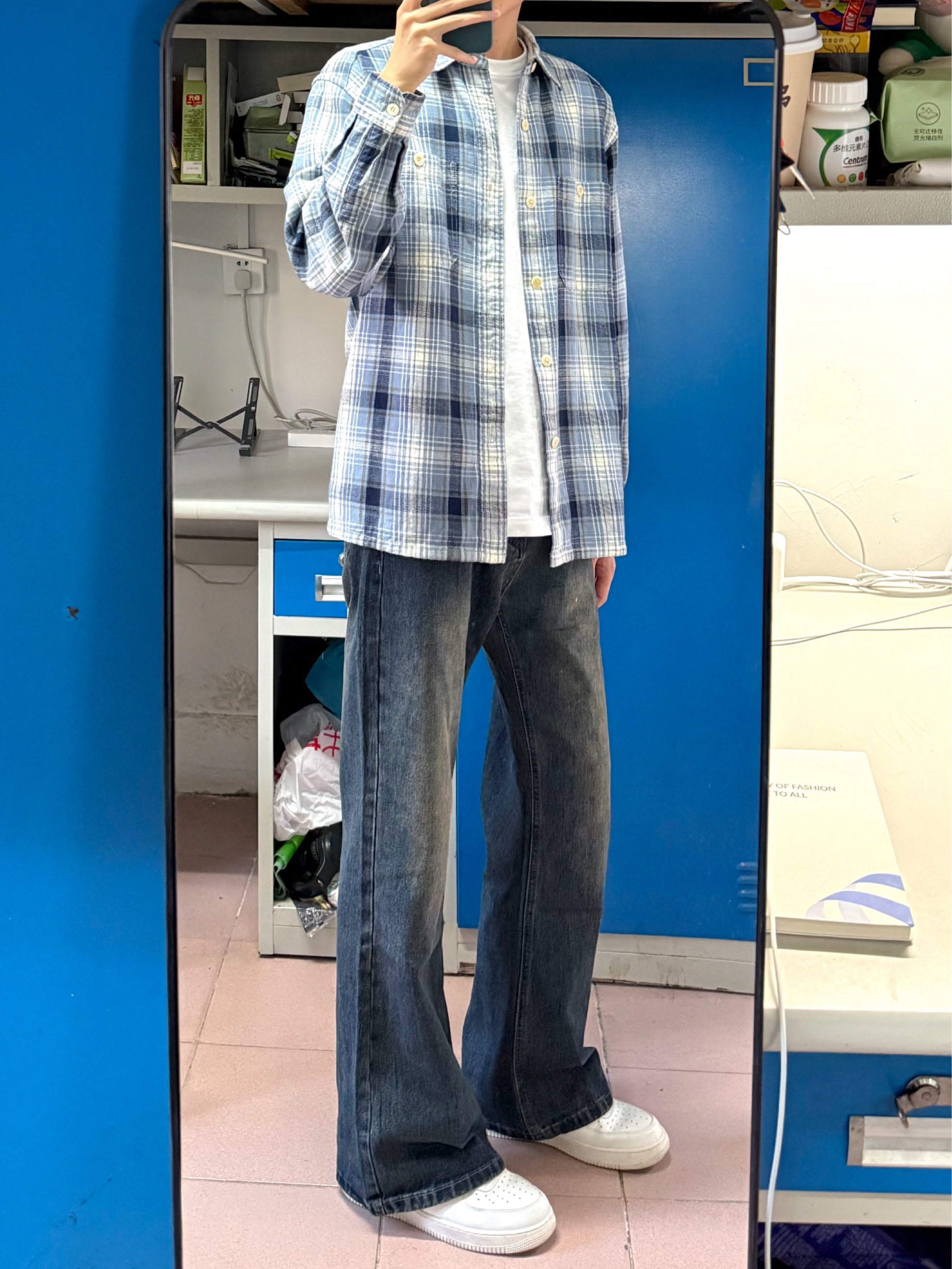 今天穿蓝色短袖🙋 搭配的是复古蓝色的微喇牛仔裤 这一身就很清楚男大学生的感觉🤩