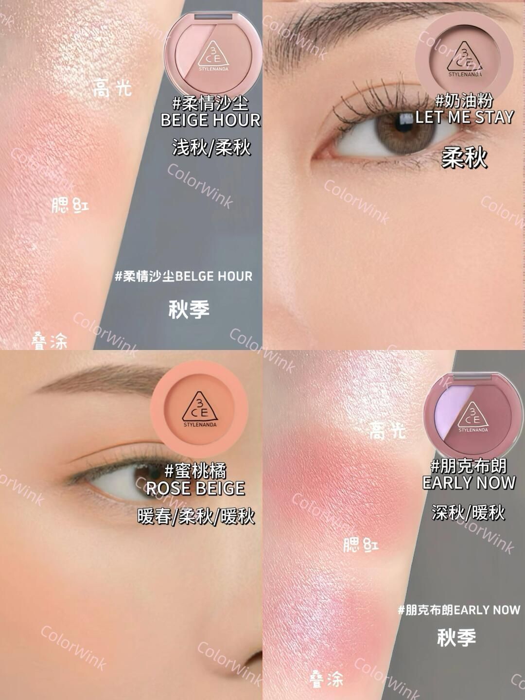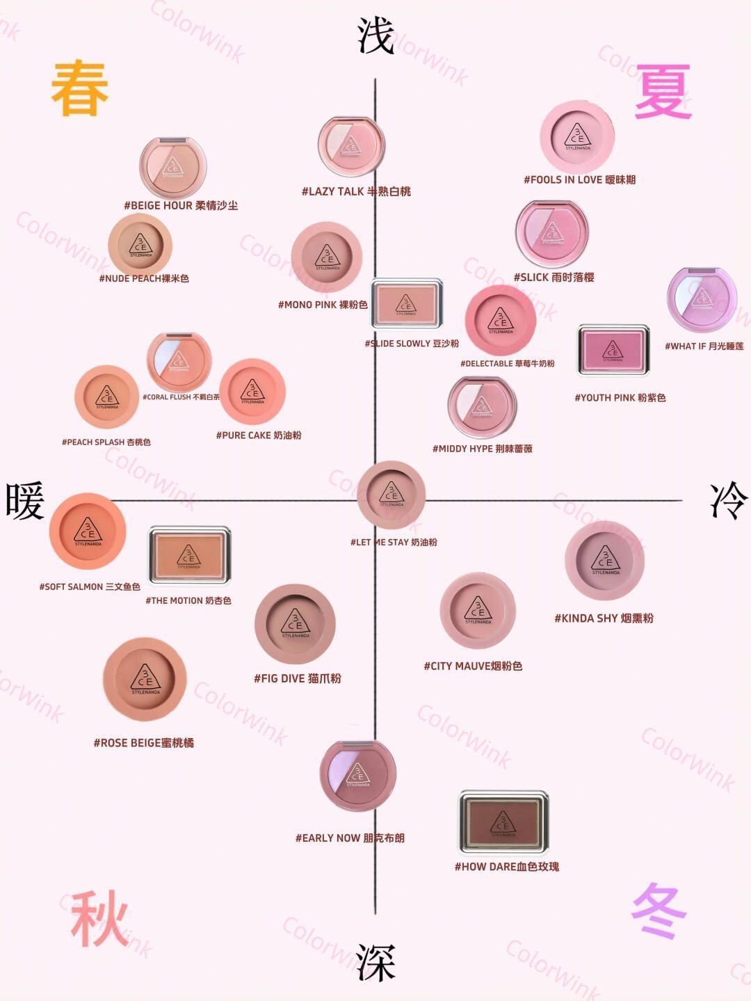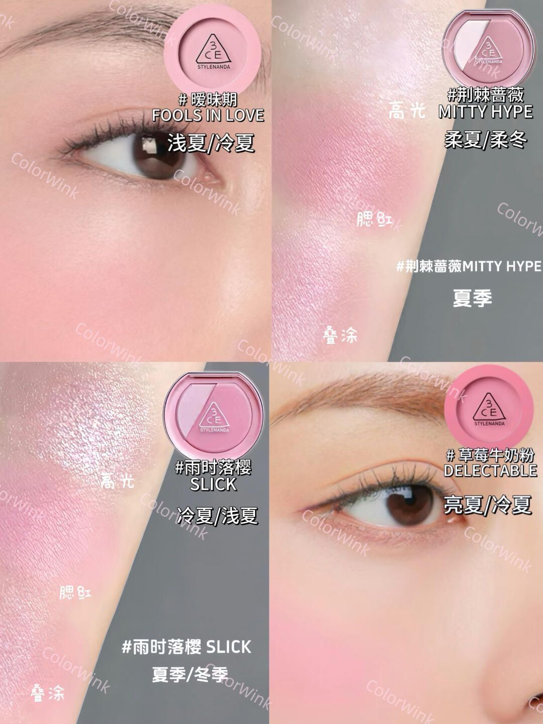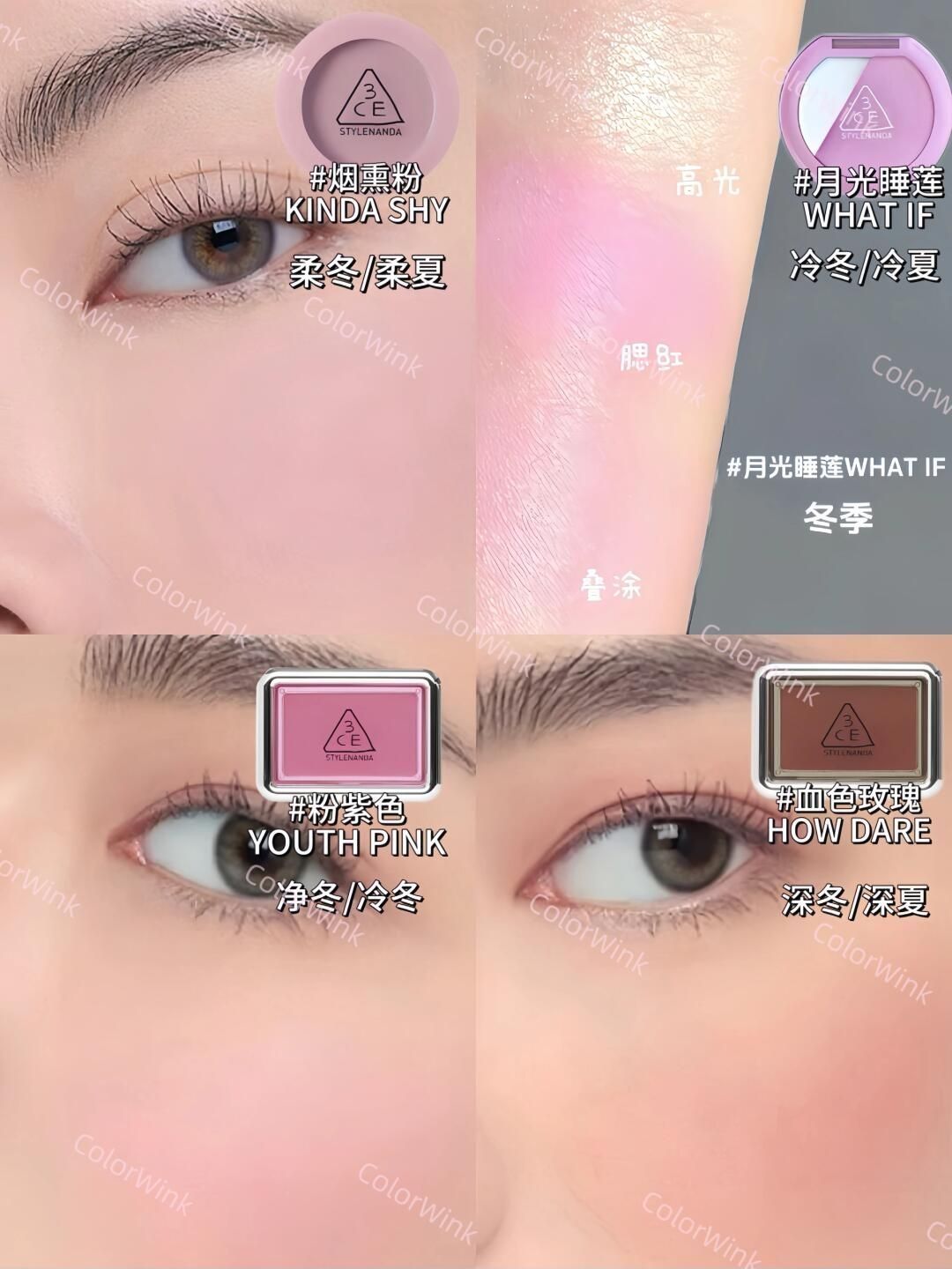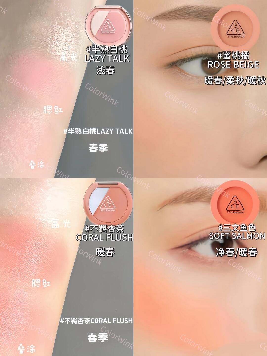 3CE腮红|四季十六型选色攻略|新品试色合集|||宝宝们大家好,今天给大家带来的是3CE腮红全系列的四季十六型分类+试色合集。大家可以参考以下的思路进行腮红的选择哦 春季型人腮红常用颜色:蜜桃色、珊瑚色、暖粉色等等 适合春季型人的腮红以明度偏高的暖色为主,主要突出清新活泼可爱的气质 夏季型人腮红常用颜色:芭比粉,康乃馨粉,山茶花粉等等 夏季型人的腮红色卡以偏高明度的冷色为主,这些色彩更能突...