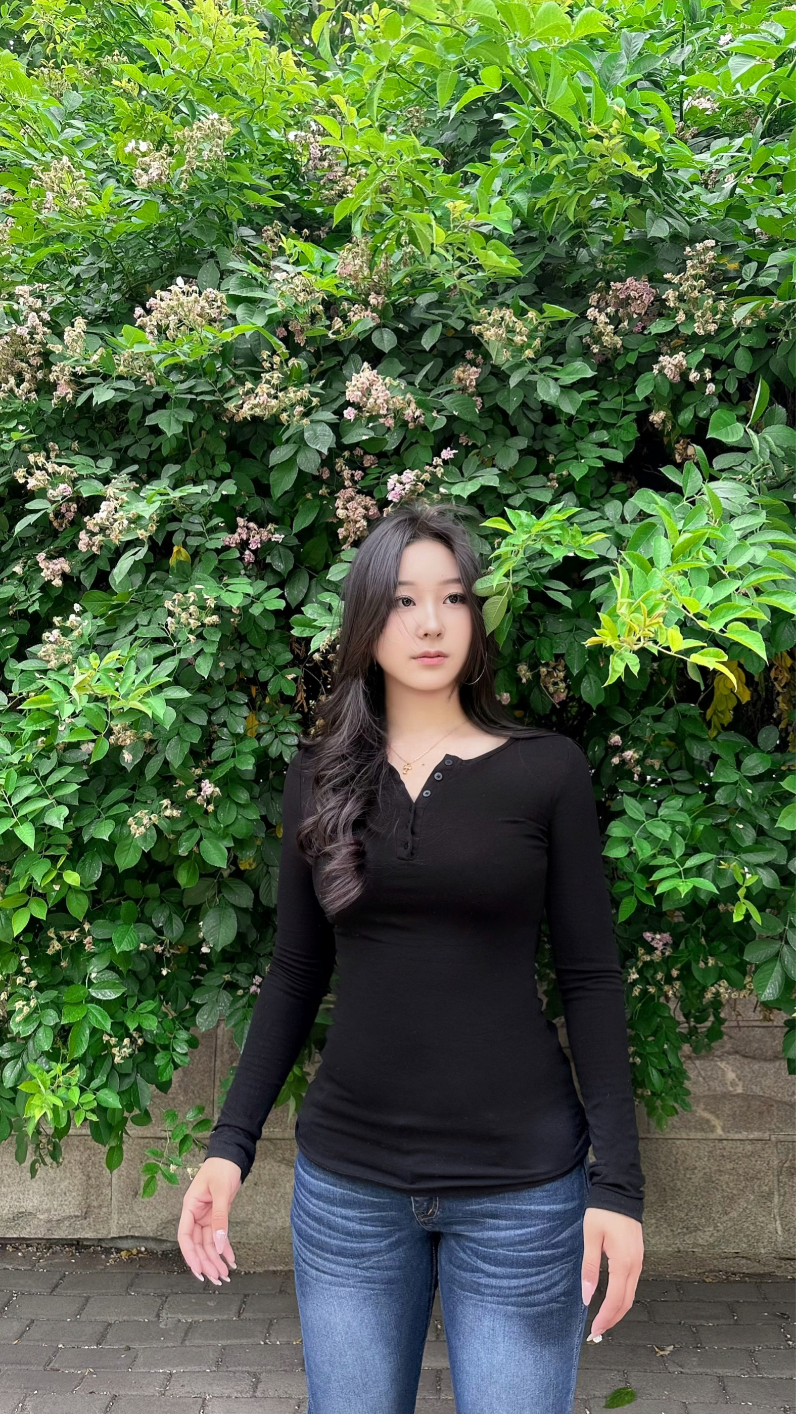 日常松弛感穿搭|基础款的高级演绎! 拿捏日常松弛感!一身基础款穿出别致韵味,黑色亨利领长袖上衣,简约小纽扣增添细节,贴合身形勾勒曼妙曲线 。搭配经典蓝色牛仔裤,利落又显腿型,日常又百搭。大圆环耳饰为整体造型注入时尚感,与自然绿植背景相衬,营造出随性又不失精致的氛围,轻松展现日常出街的舒适时髦感,她的穿搭思路很适合借鉴,用基础单品打造不费力的好看,让普通人也能轻松Get时尚日常Look 。