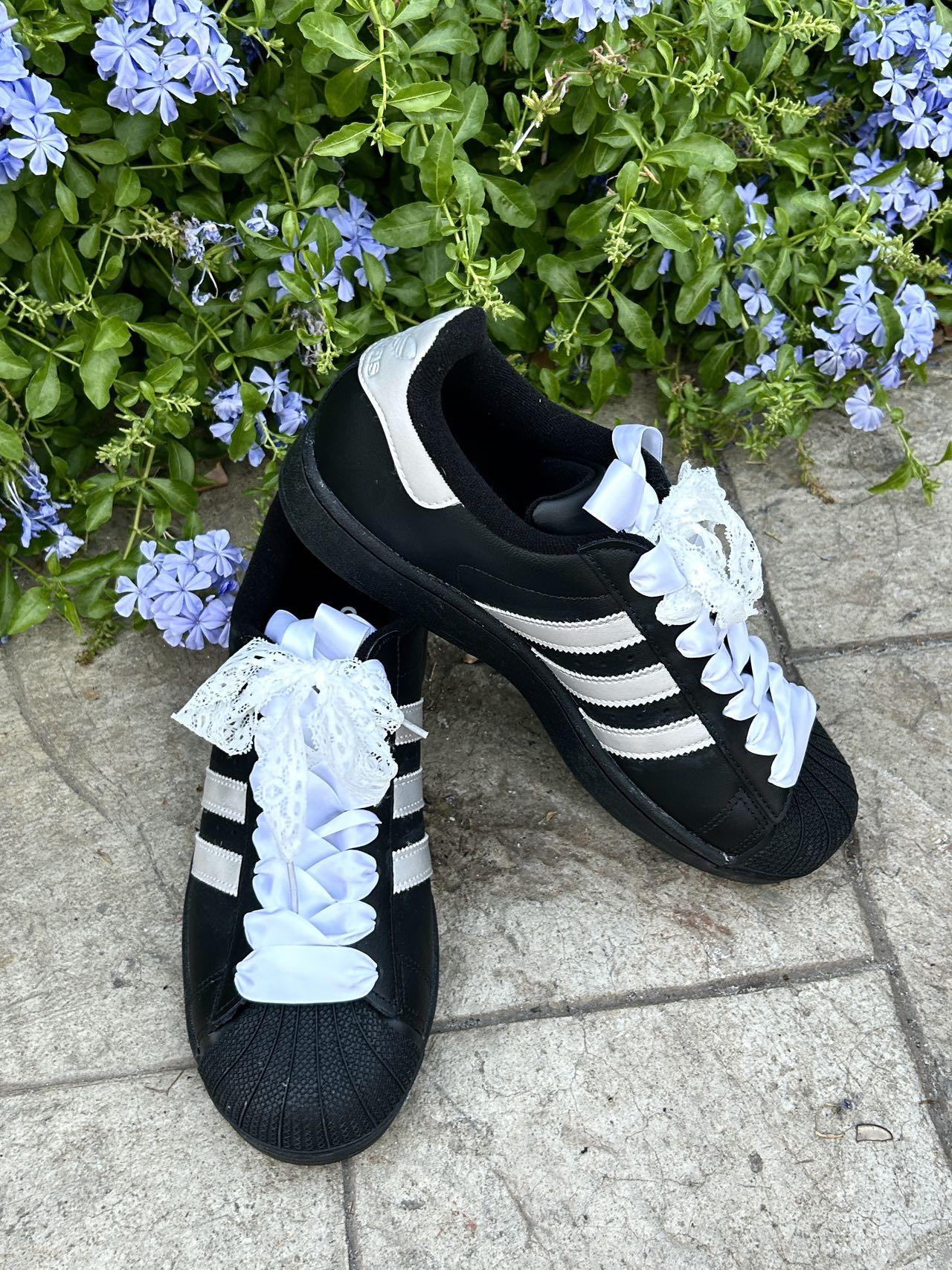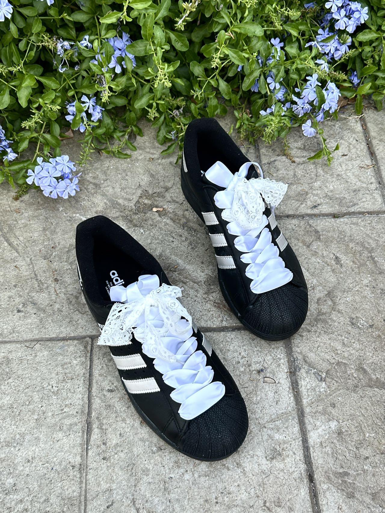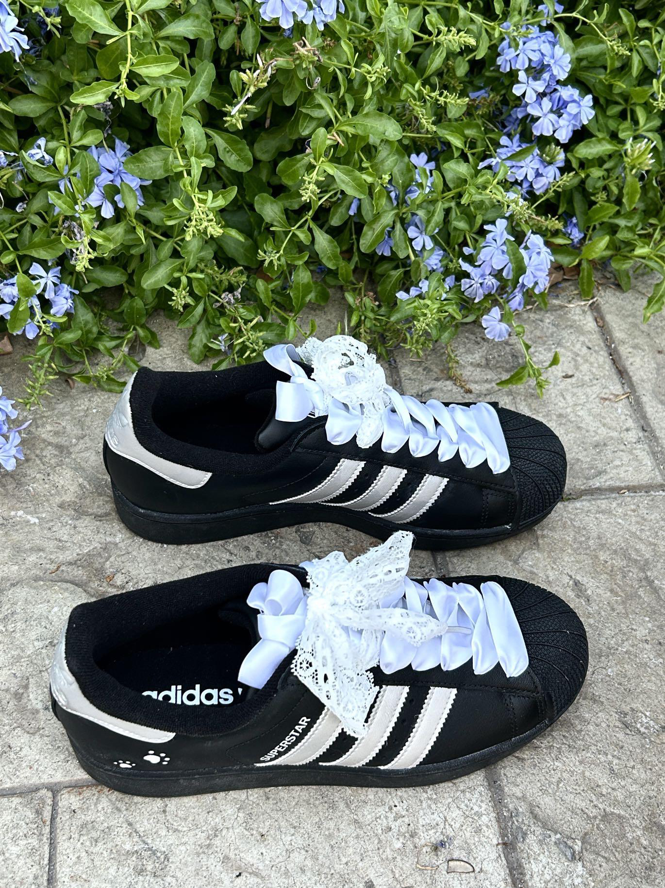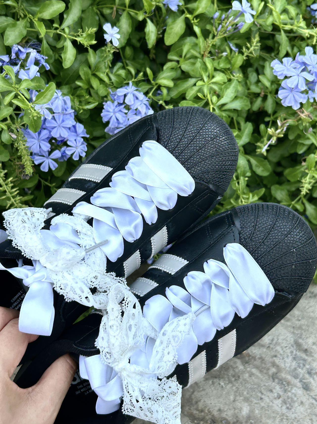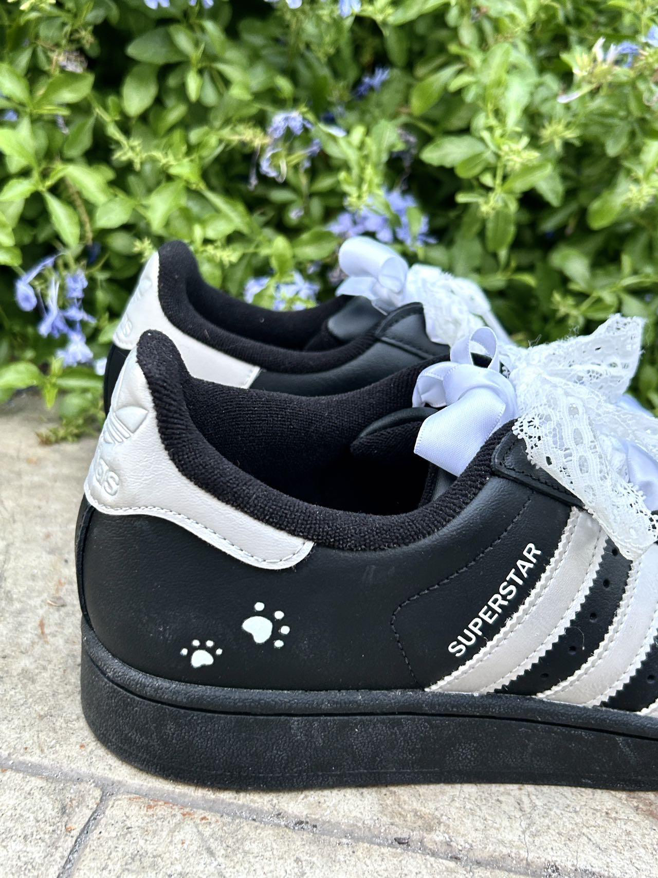 今日分享🧭|adidas SUPERSTAR ✨ 银色的logo质感细腻,和黑色鞋身搭得恰到好处 蕾丝缎带鞋带添了份柔,鞋侧还有象征可爱的小爪印🐾 日常穿出门特别亮眼[强_blue][强_blue] 必须再说亿遍,我好稀饭这个银色阿迪 logo 呀~ #定制我主场 #买鞋抄作业 #今天只晒鞋 #把这双鞋焊在脚上 #阿可迪达斯贝壳头潮鞋百搭