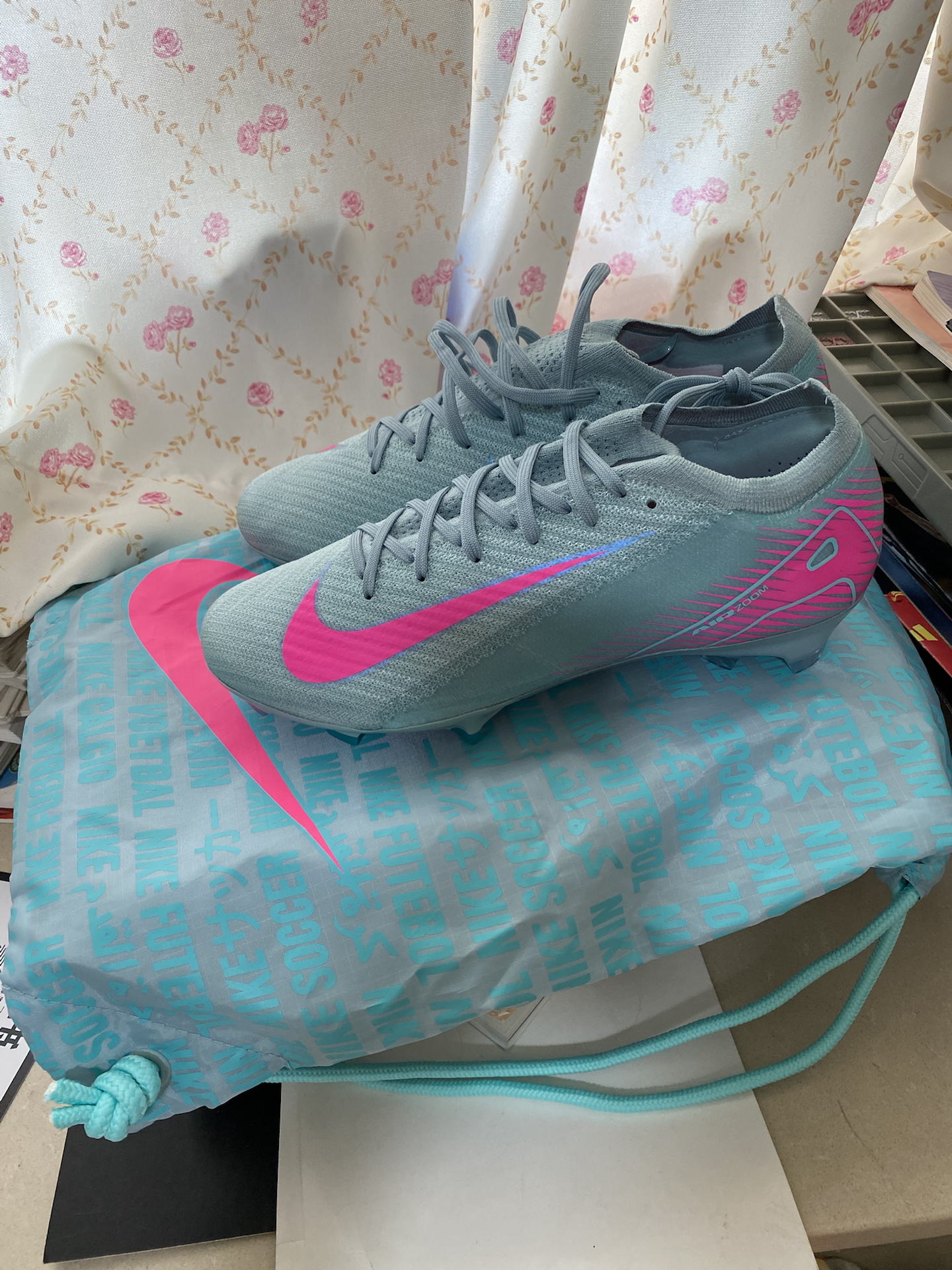发现一款颜值超绝的足球鞋🥰。灰白主色调搭配亮粉色勾边,相当吸睛😎。我实测它在人工草场地表现很稳,胶质短钉抓地力好👍。适合足球训练场景,不管是学生还是上班族都能用🙌。就是价格不算特别亲民啦🤔,追求品质颜值的宝可以冲一波✅!