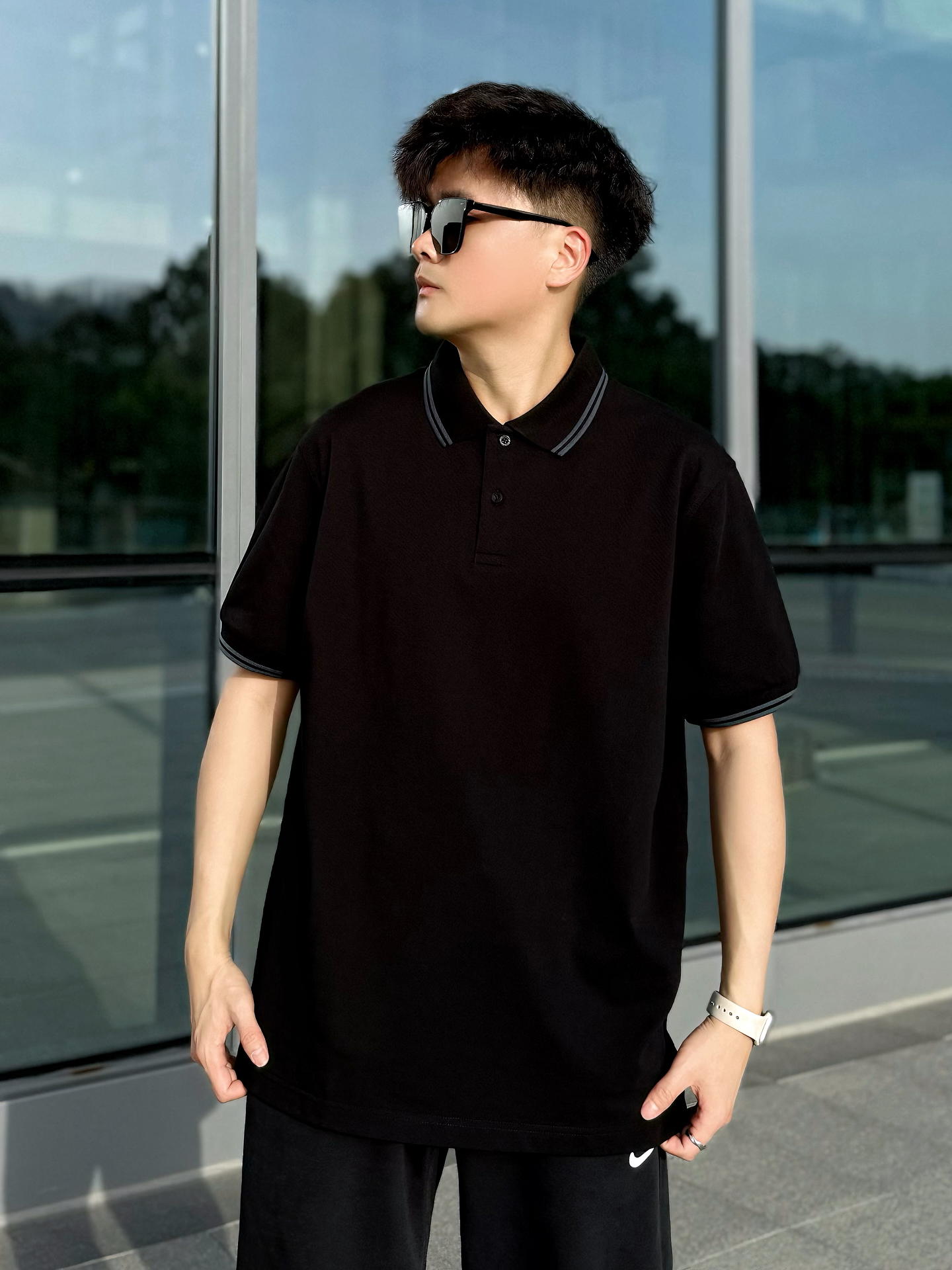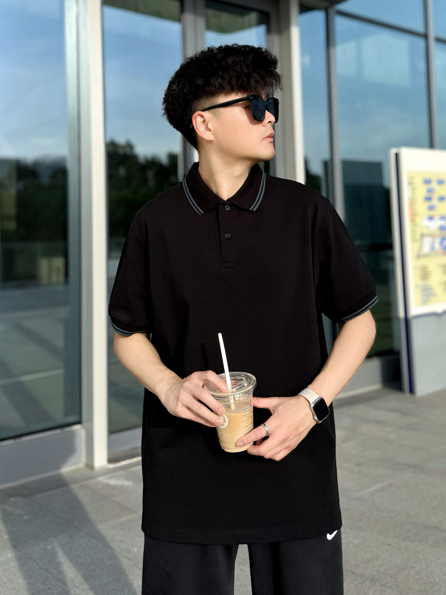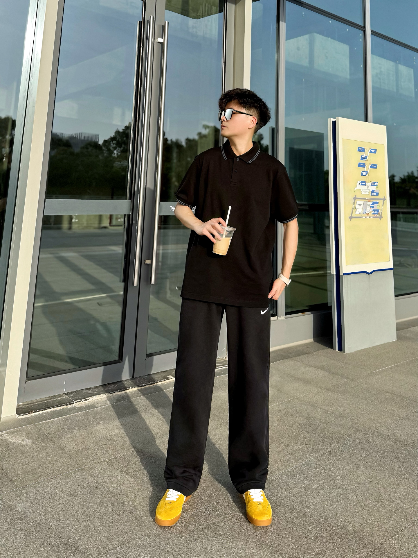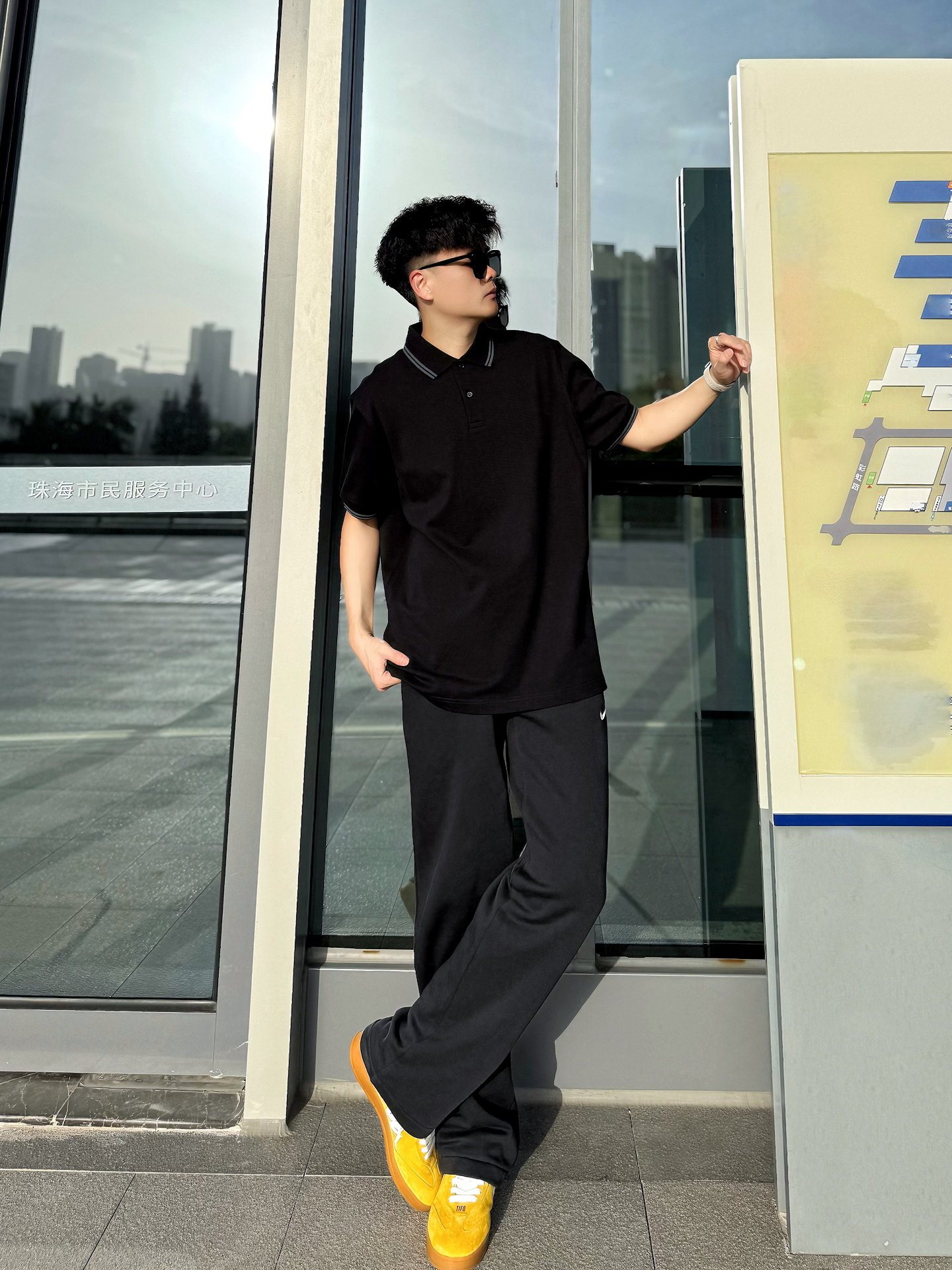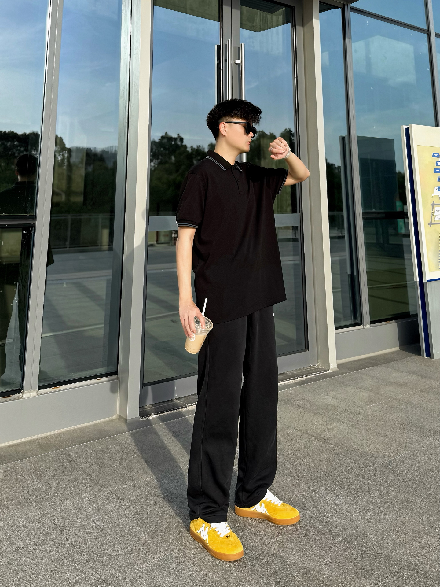 最近发现一套很有少年感的通勤穿搭。上身的黑色polo衫翻领设计,潮流帅气还舒服。下身搭配的裤子,版型宽松,束脚设计很利落👍。再配上亮色德训鞋,打破单调。整体简约时尚,唯一不足的是全黑可能有点吸热,不过不影响整体好看~。 图源网络侵删
