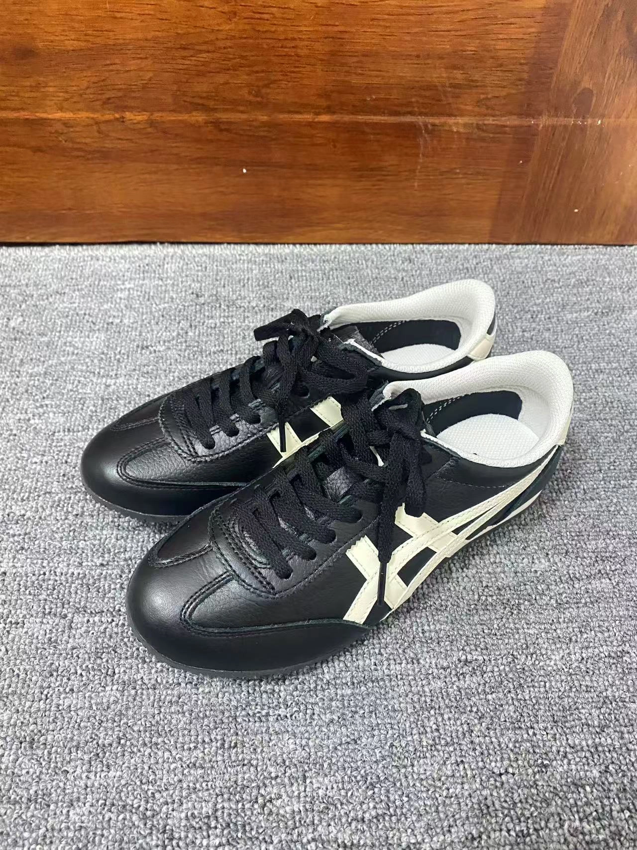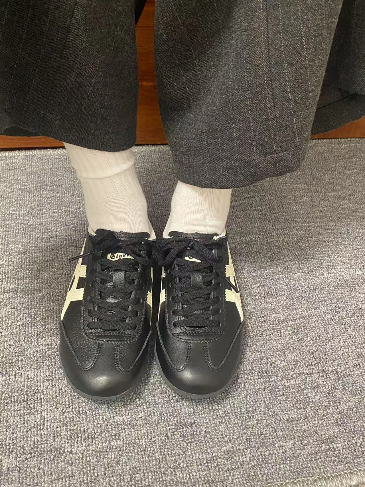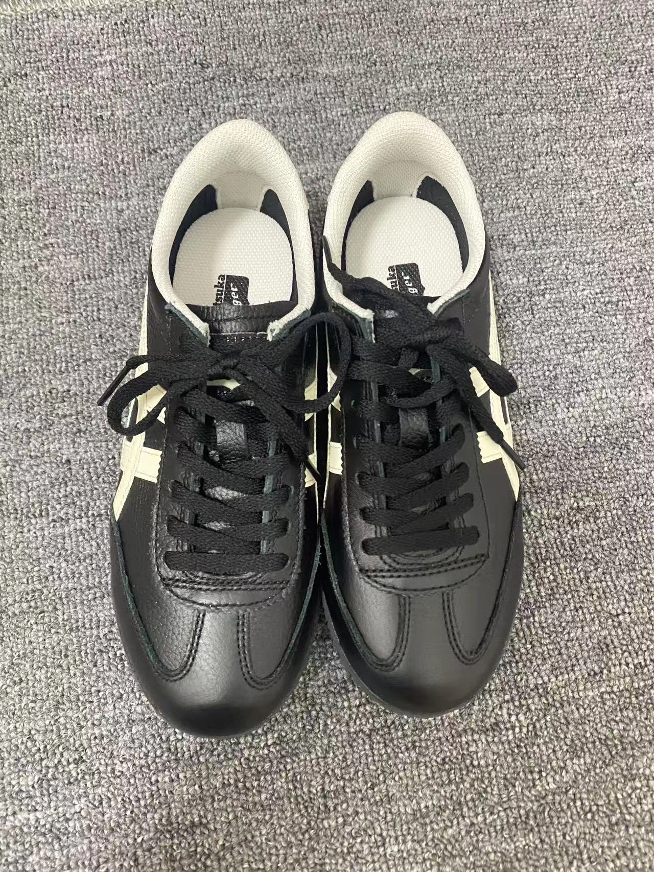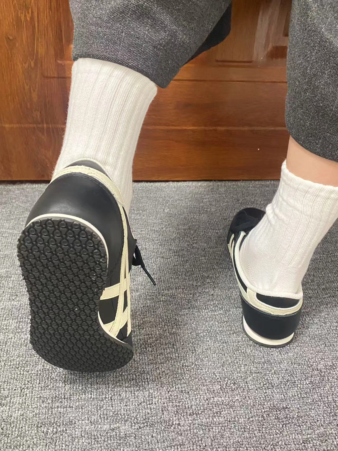 不得不说一眼望去真的有点像,特别是logo,这款鬼塚虎也是经典黑白配色,德训的感觉很有风格,整体外观还是比较深得我心,鞋底一眼防滑,上脚柔软不偏码。