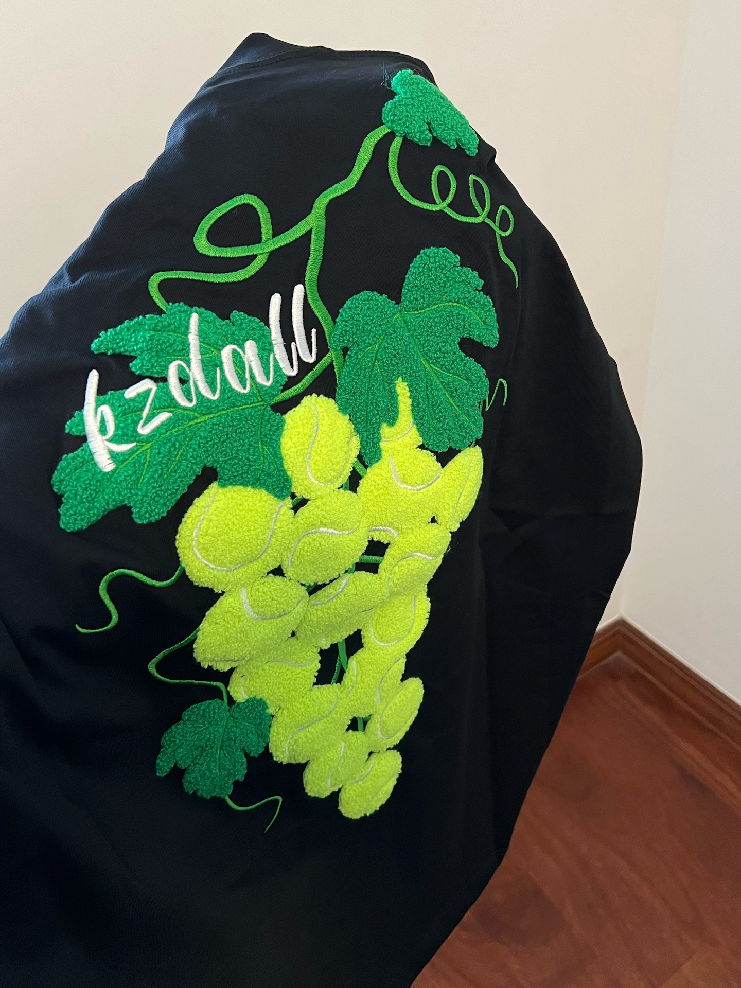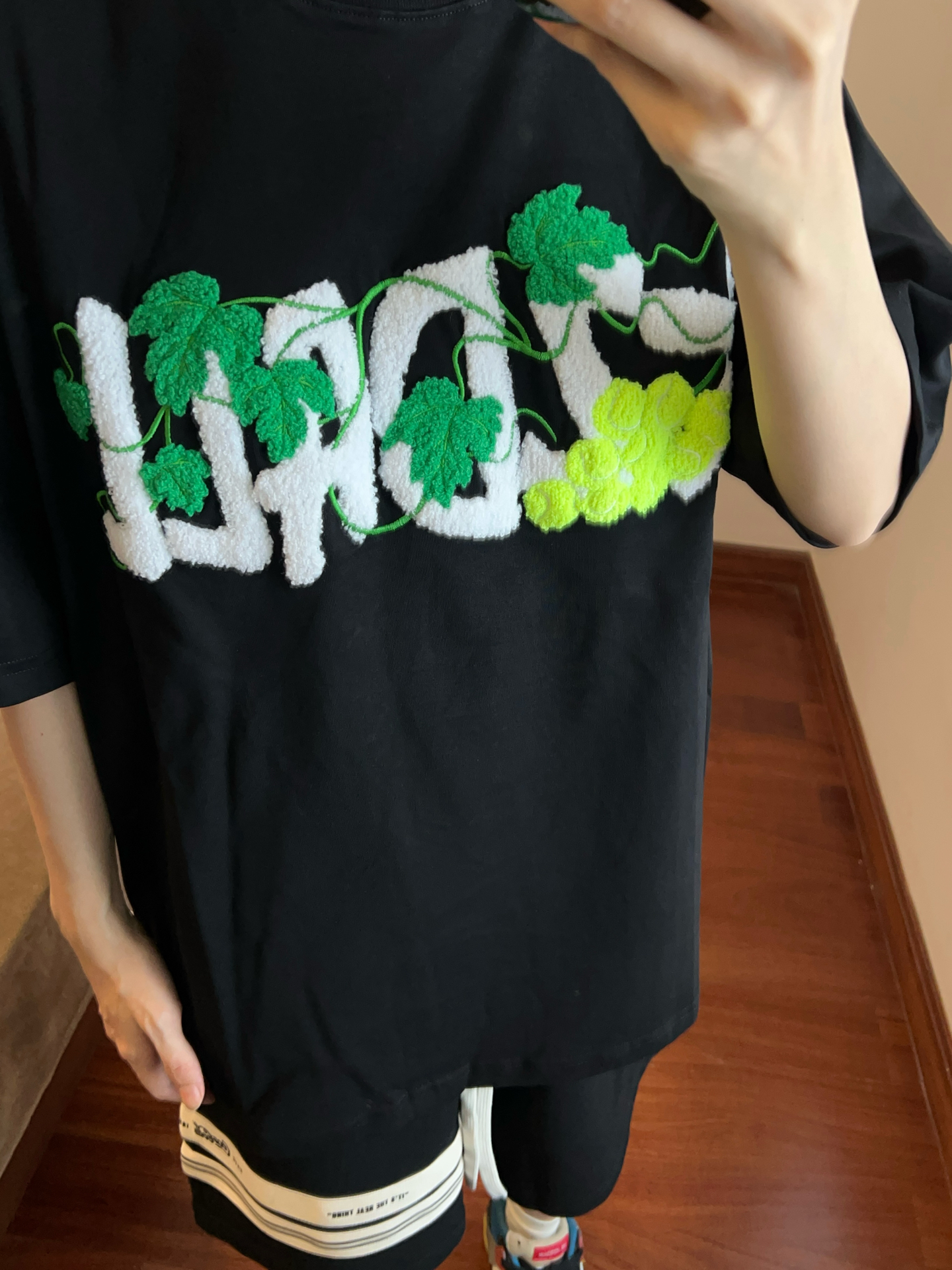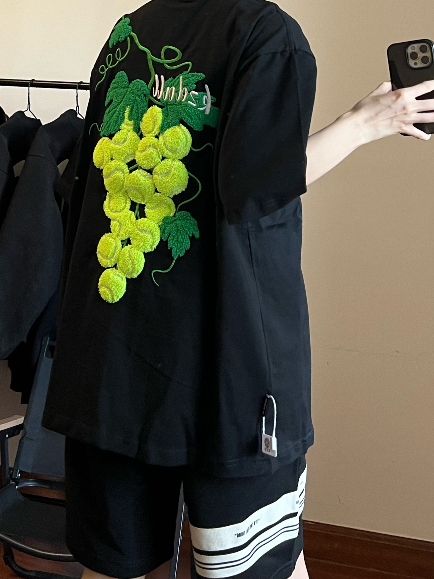 我最近入手了件短袖,设计感真的拉满~背后葡萄和网球结合的刺绣图案太吸睛啦😍。宽松版型穿着舒服,但版型有点挑人,瘦点穿更有范儿🤔。它是纯棉的,透气吸汗,很适合春夏天穿!