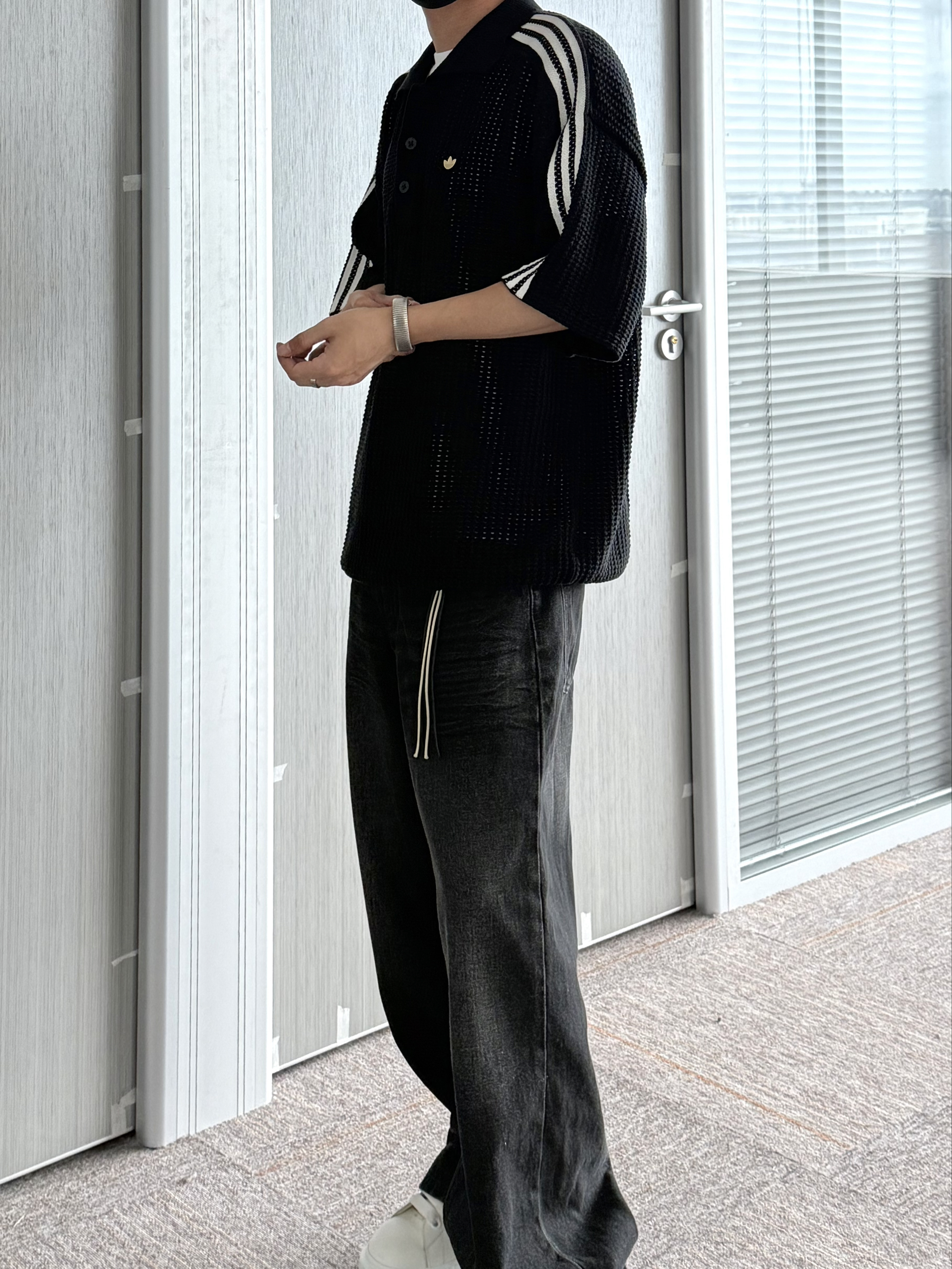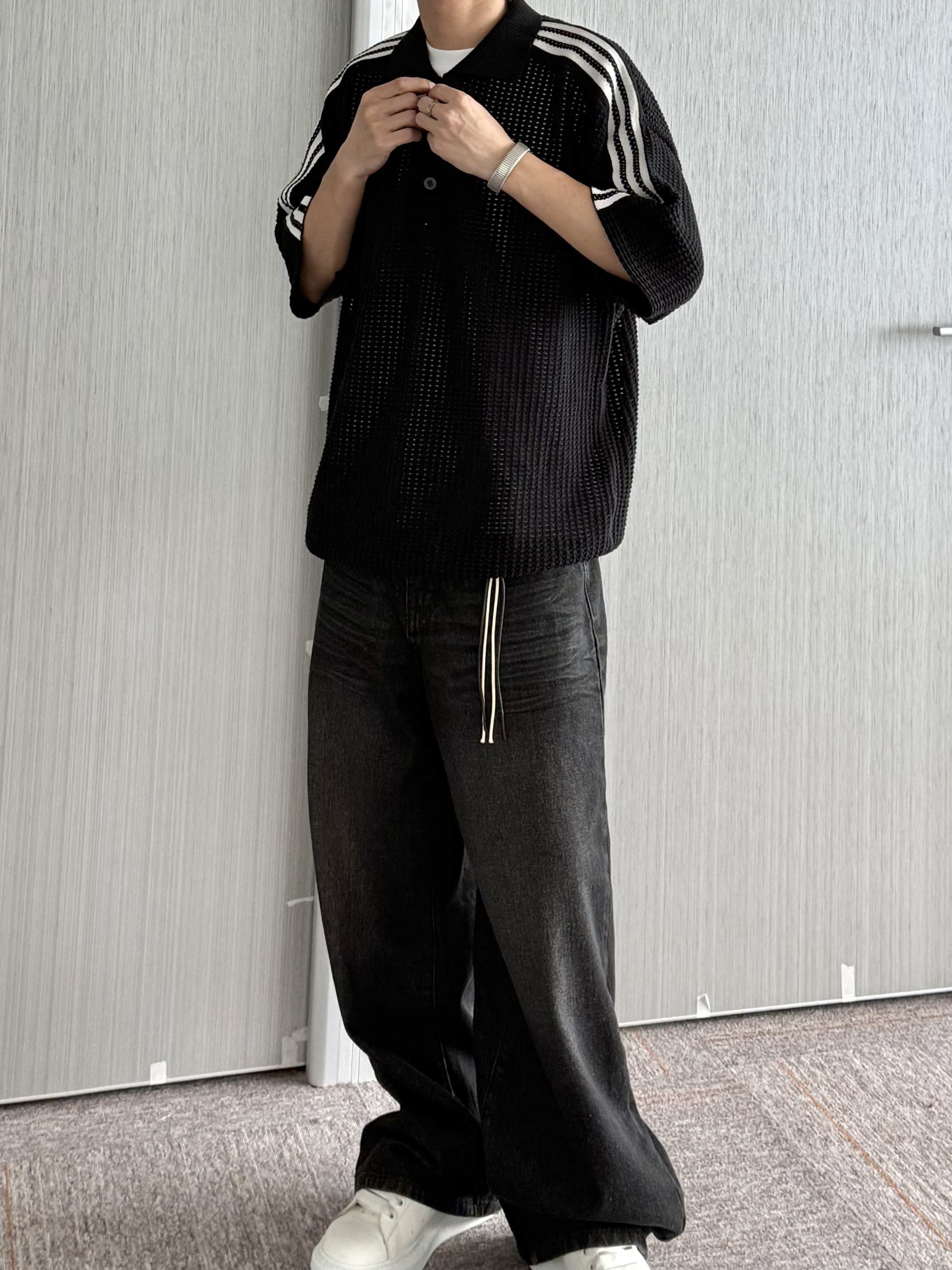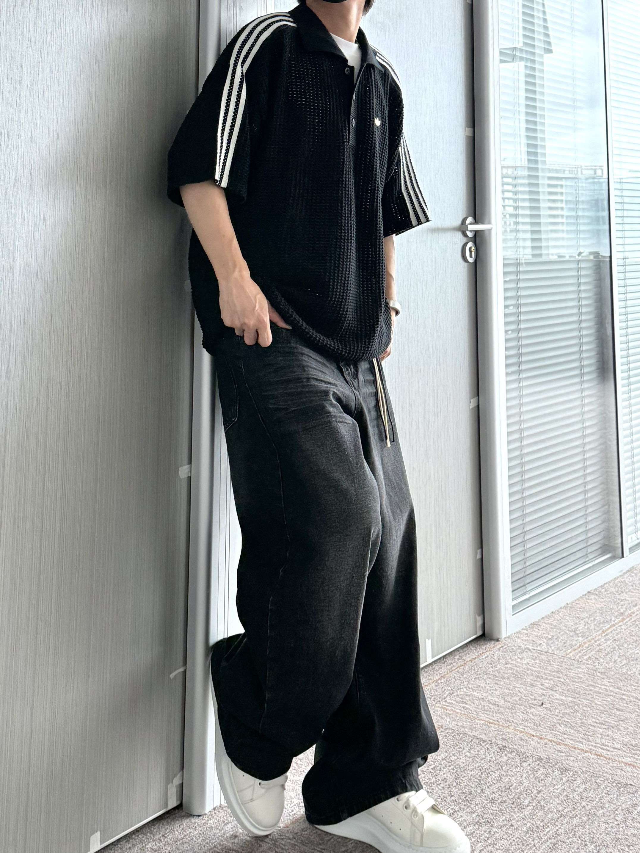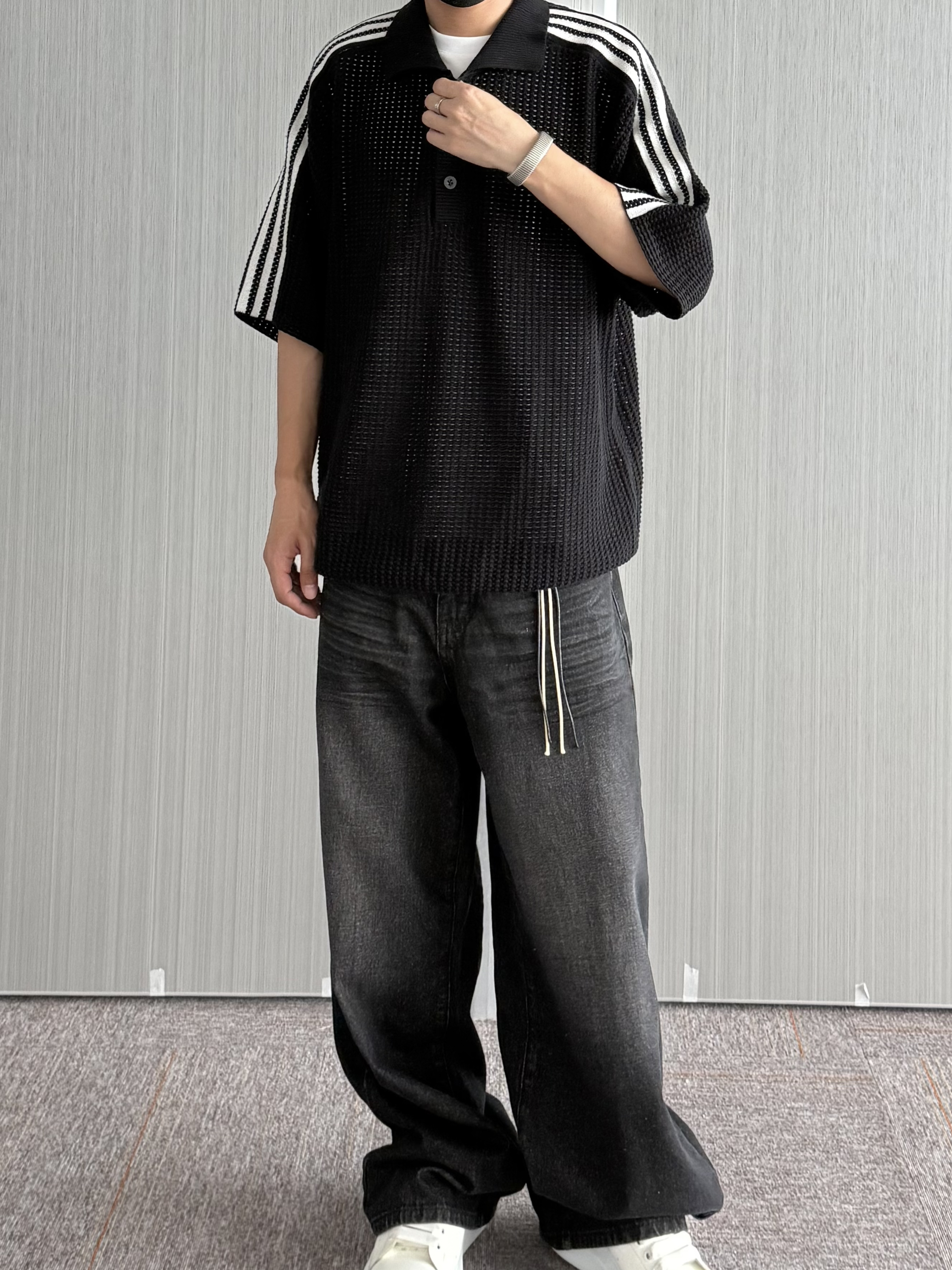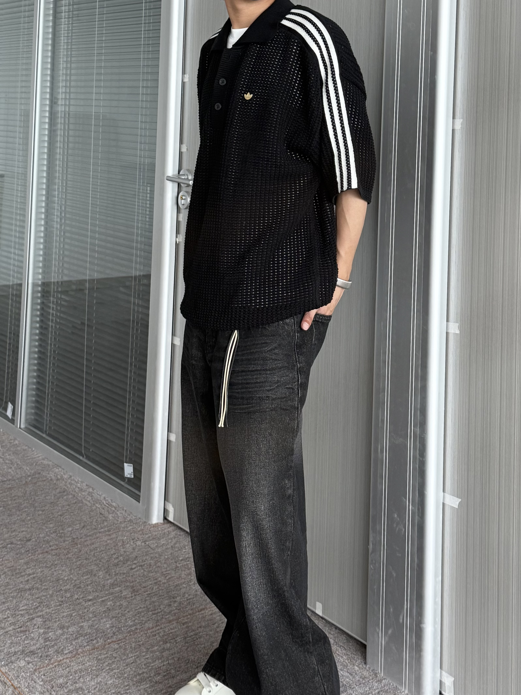 阿迪黑色镂空Polo衫 和陈冠希联名的新款真的挺像的 胸前小三叶草logo还挺低调! 整体上身还是比较有份量感的 不得不说镂空真的烧 搭配做旧阔腿牛仔裤 all black太酷了