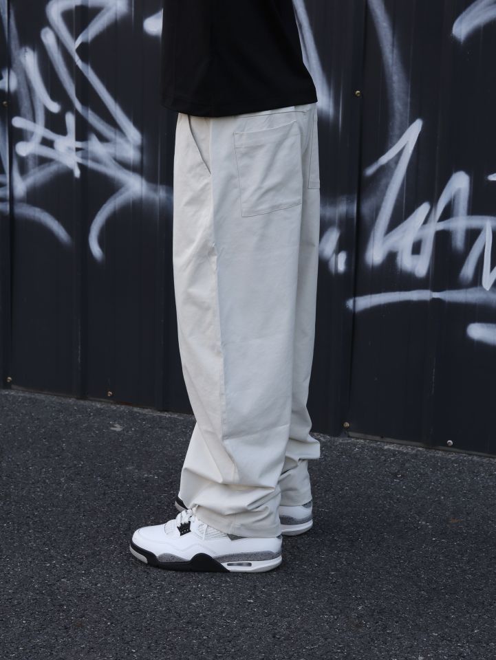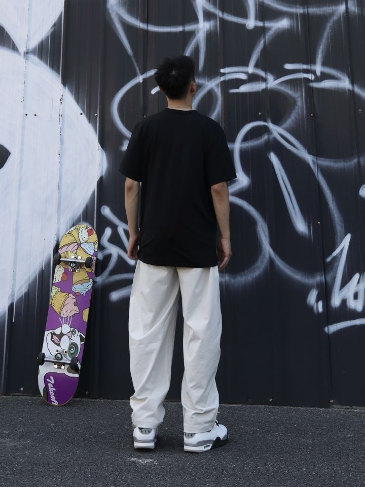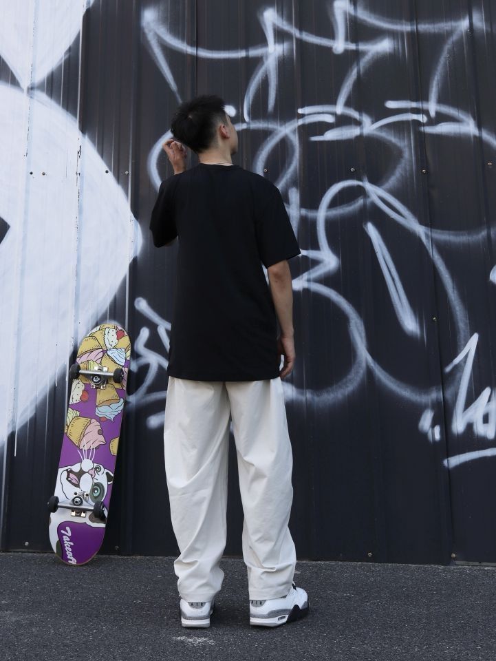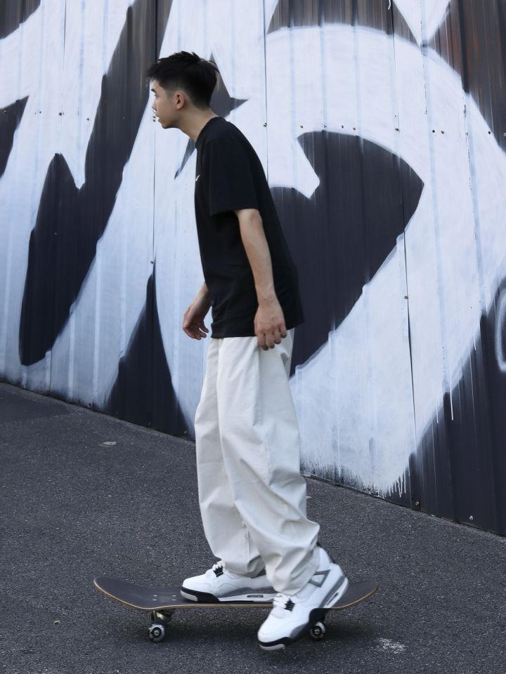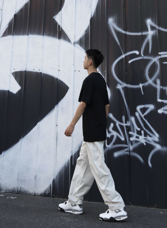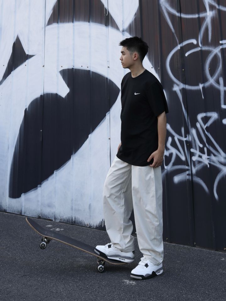 👕:nike经典短袖 版型宽松立体透气,日常舒适又百搭 👖: BD.POWER UP+ 弯刀裤 休闲的风格和宽松的版型能修饰腿型。面料挺括又有垂坠感,走路时会形成自然好看的褶皱,蛮随性的,米色百搭又显清爽,日常出街、运动休闲场景穿都合适,松弛又酷帅 👟:aj4白水泥 简约白底色搭配灰色细节,利落又有层次