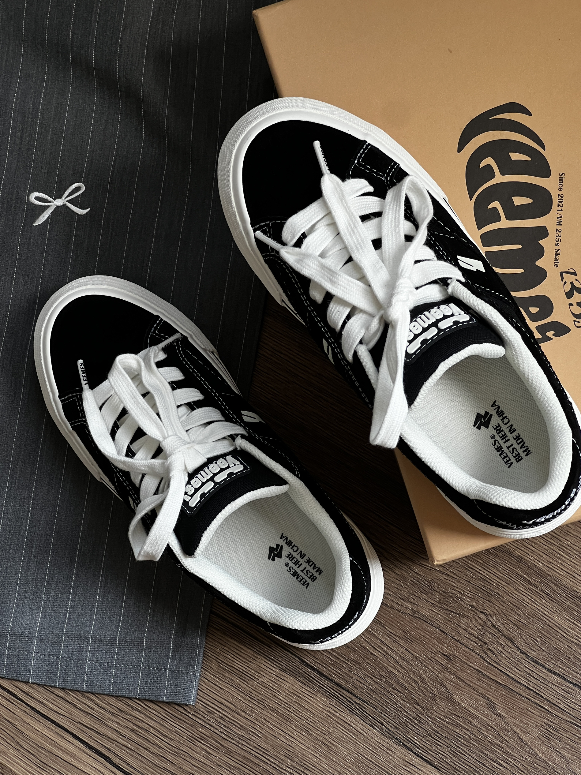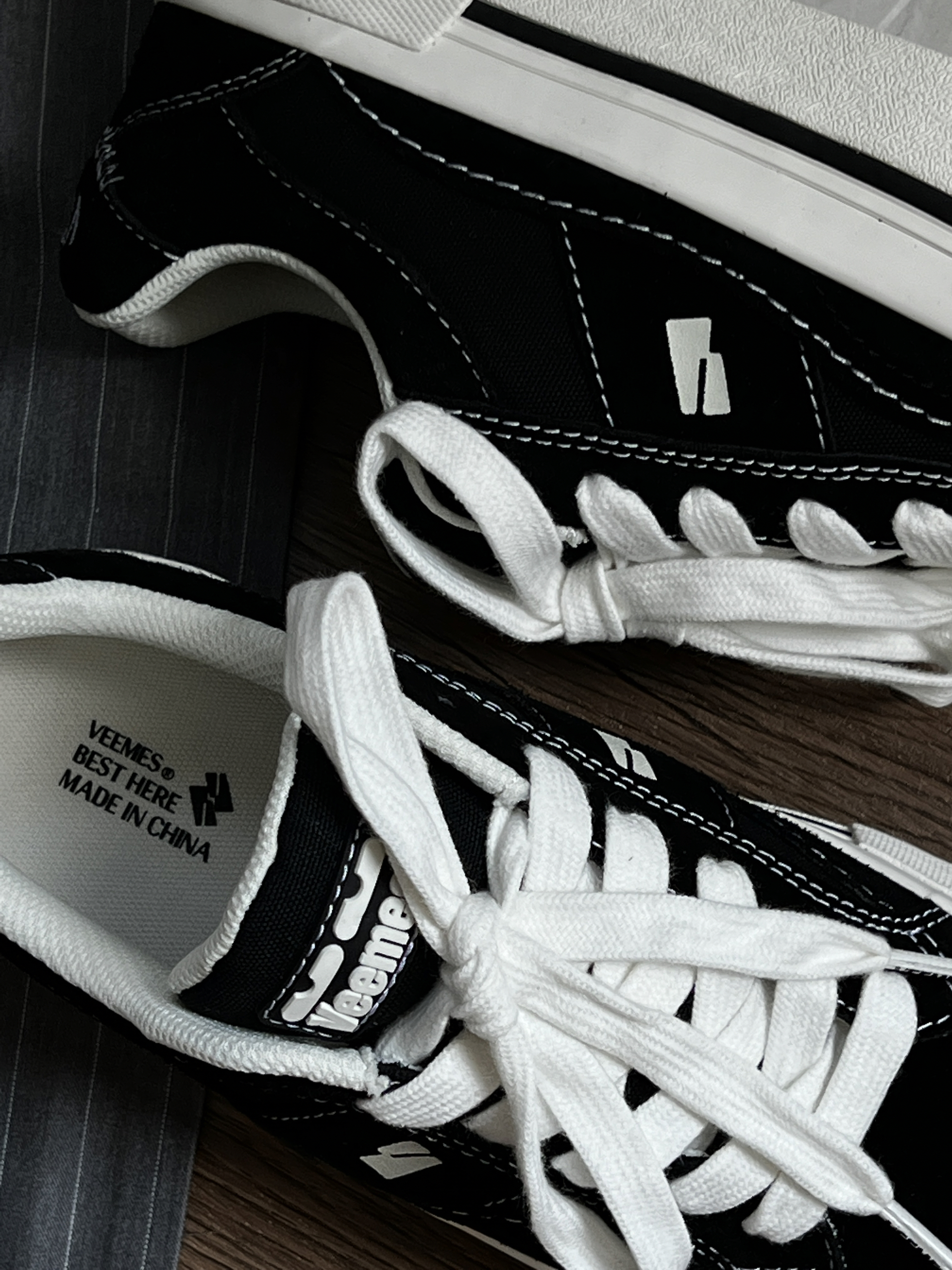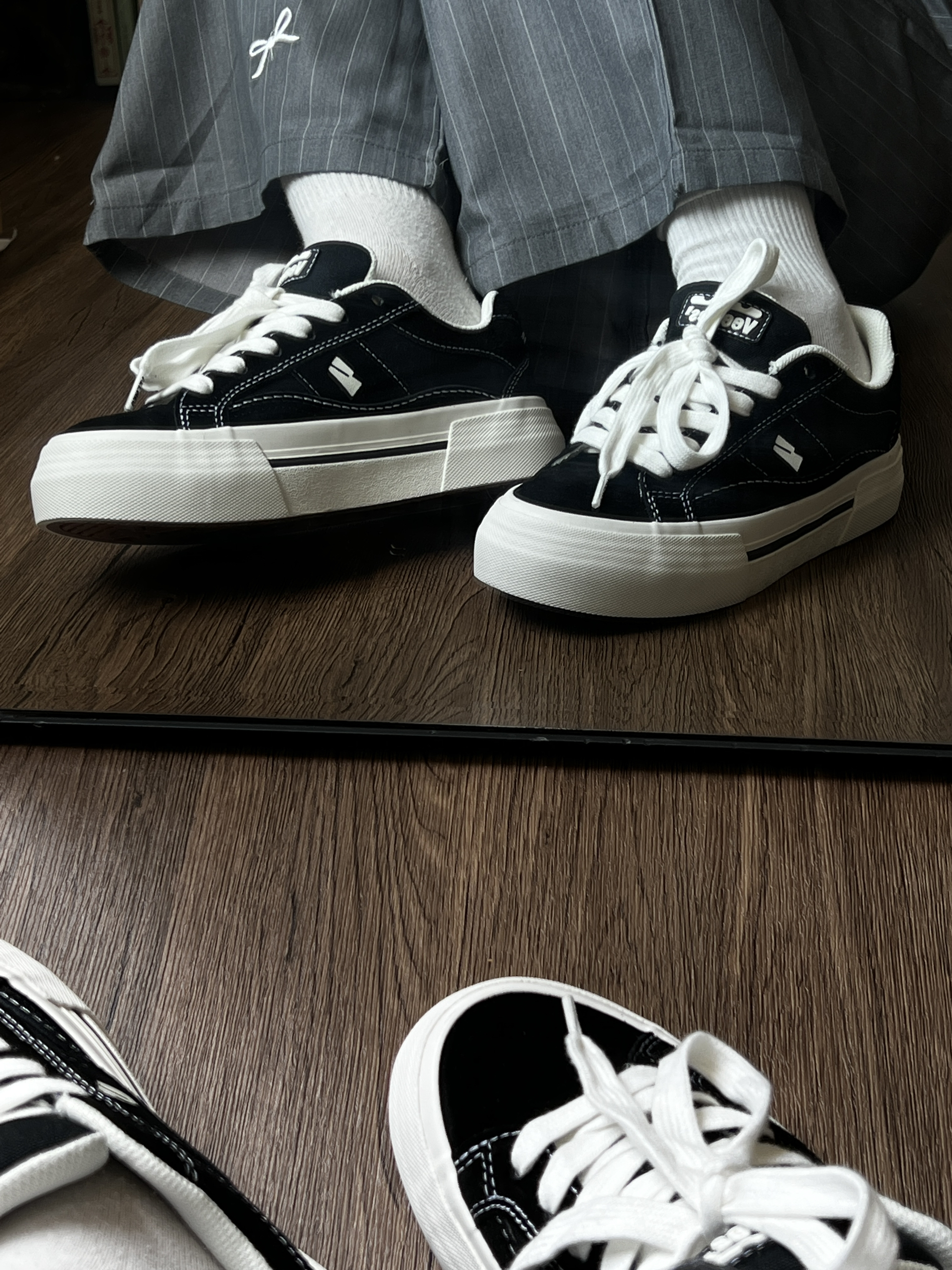 这双板鞋上脚软到我心里了~舒适的足弓支撑➕包容性强,黑白主色又简约又酷,帆布和细腻的绒面拼接,宽脚穿也好好看。 增高设计让这双鞋子更cool了,有黑白两幅鞋带,可根据风格随意切换😎。 鞋舌的👀眼睛设计可可爱爱的,后跟设计好大牌,好戳我😍