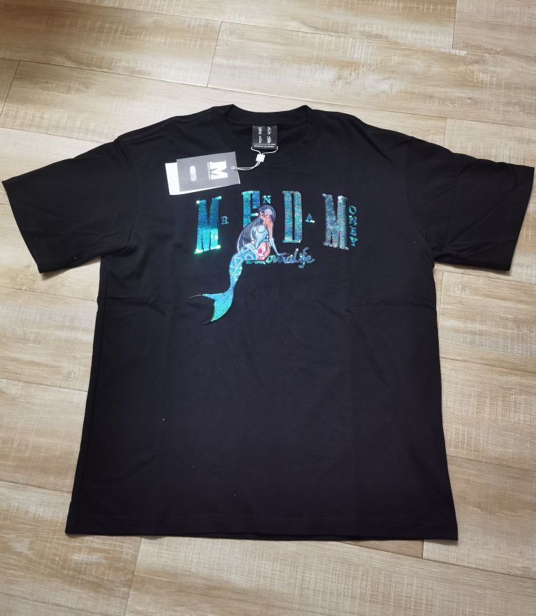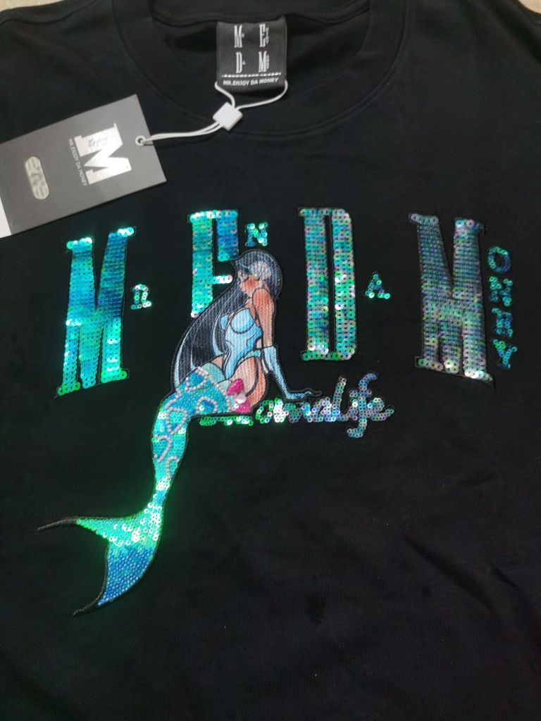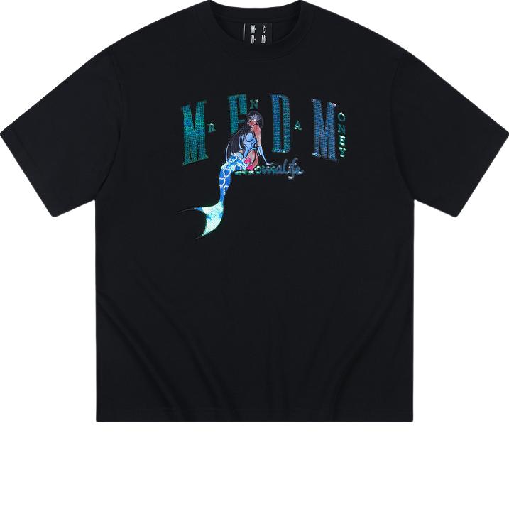 ✰本次联名最大亮点在于亮闪闪的美人鱼🔮(在不同角度的光线下会呈现不同光泽) ✰正面 美人鱼头上有一颗小珍珠 腿上🎀还有一颗小宝石 尾巴上的亮片是🔵色在光线下呈🟢色 ✰背面 颗粒🥥树也很有型🌴 渐变字母是不透气大印花(夏天穿后背会有点🔥) 💥此款依旧宽松版型需看好自身尺寸入💥