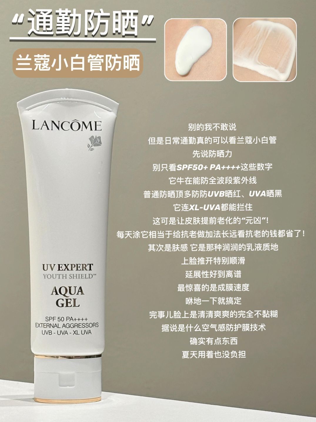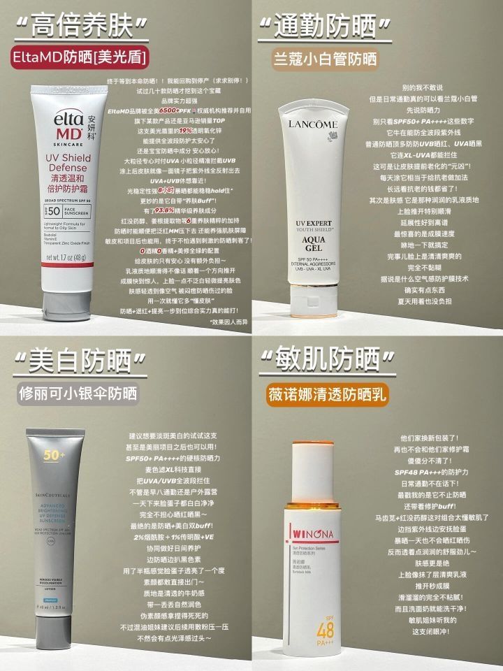 本篇笔记关联了Lancome/兰蔻 小白管轻透修颜水漾长效防晒霜 轻薄隔离贴妆清透 清爽版 SPF50/PA++++、Winona/薇诺娜 清透防晒乳 防汗轻薄水感全身适用 新版SPF48、Elta MD 清透温和倍护防护霜 SPF50/PA++++ 舒缓修红 滋润等商品,为用户提供真实的使用体验和购买参考。