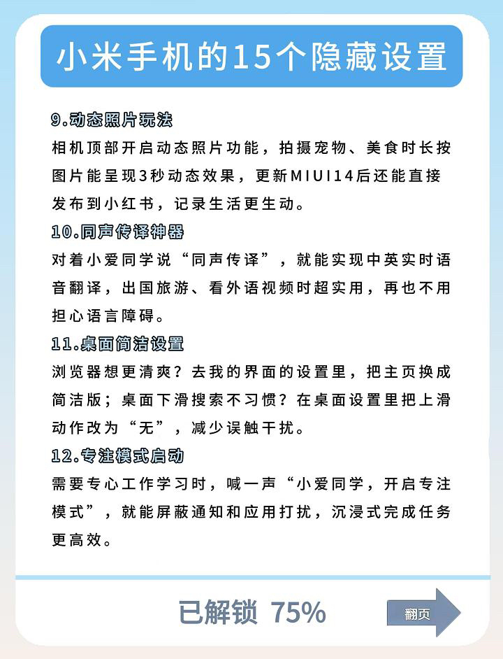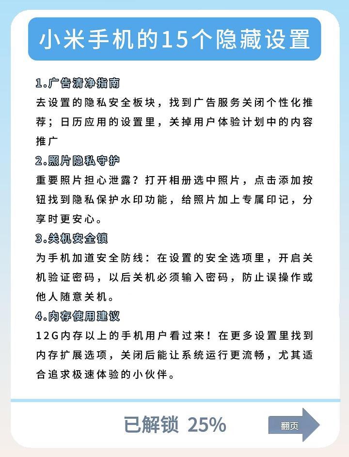 有没有小米用户和我一样,用了很久才发现这些宝藏功能?!整理了 15 个超实用的玩机技巧,涵盖隐私保护、快捷操作到趣味功能,手把手教你把小米手机用出 “开挂” 体验~ 小米的隐藏功能其实超丰富,关键看会不会挖~ 我是梓宝,关注我,带你了解更多数码隐藏小技巧!