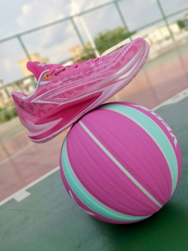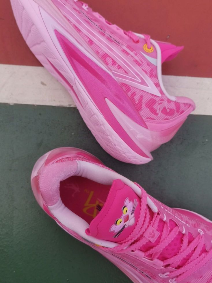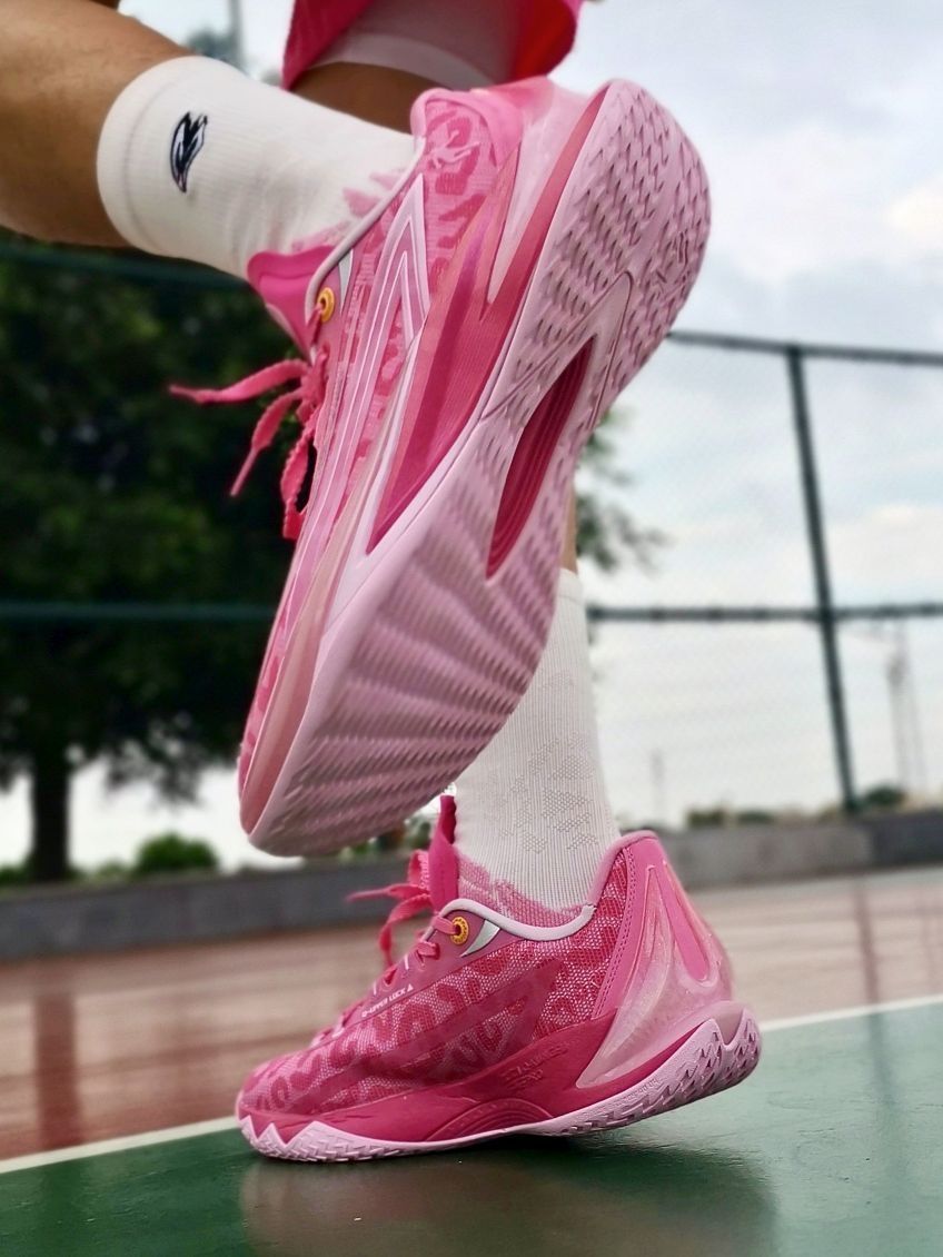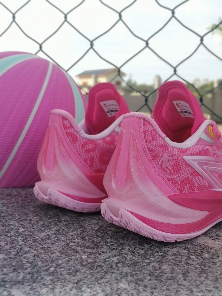 中乔跟粉红豹的联名不是第一款了! 继续延续了之前的联名款高颜值! 不是单纯的粉色,鞋面还有豹纹的纹路! 搭配后跟渐变立体毒牙造型, 整体鞋型还是蛮帅的,流线型不臃肿! 总体上脚感觉缓震够用,脚感比较韧弹! 挺适合我这种喜欢突破急停小个子!
