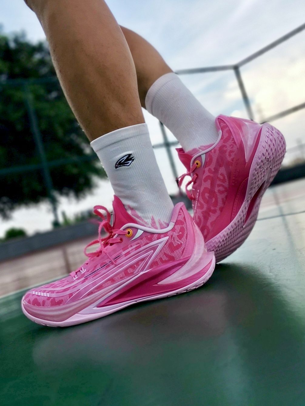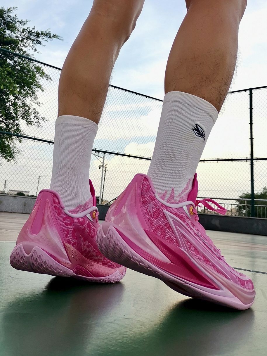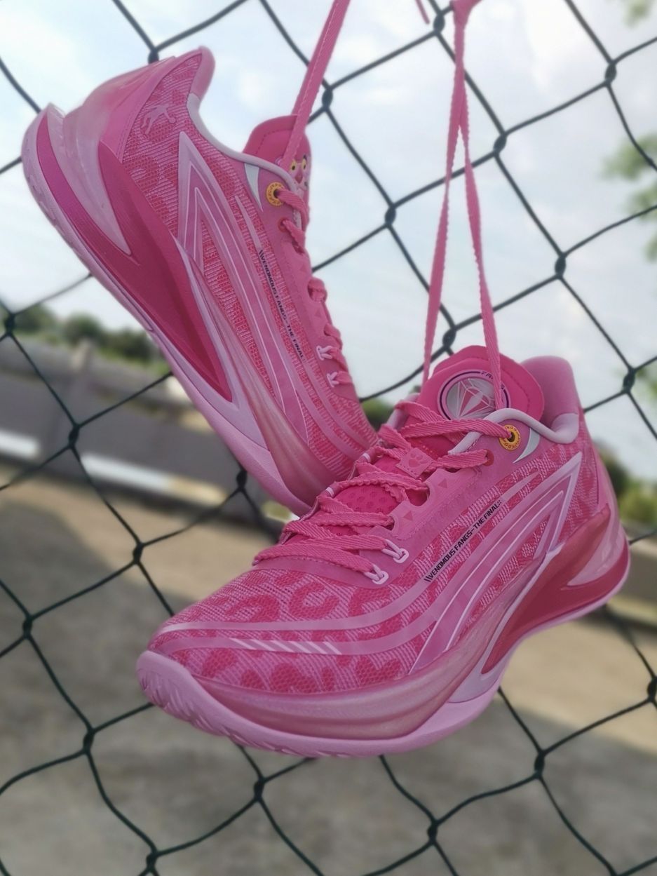 中乔跟粉红豹的联名不是第一款了! 继续延续了之前的联名款高颜值! 不是单纯的粉色,鞋面还有豹纹的纹路! 搭配后跟渐变立体毒牙造型, 整体鞋型还是蛮帅的,流线型不臃肿! 总体上脚感觉缓震够用,脚感比较韧弹! 挺适合我这种喜欢突破急停小个子!