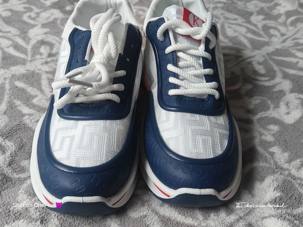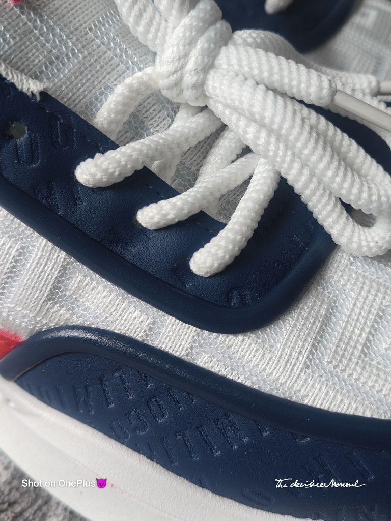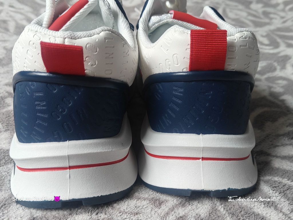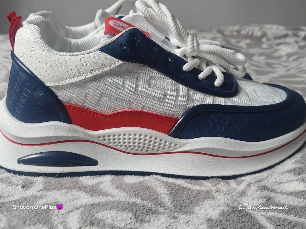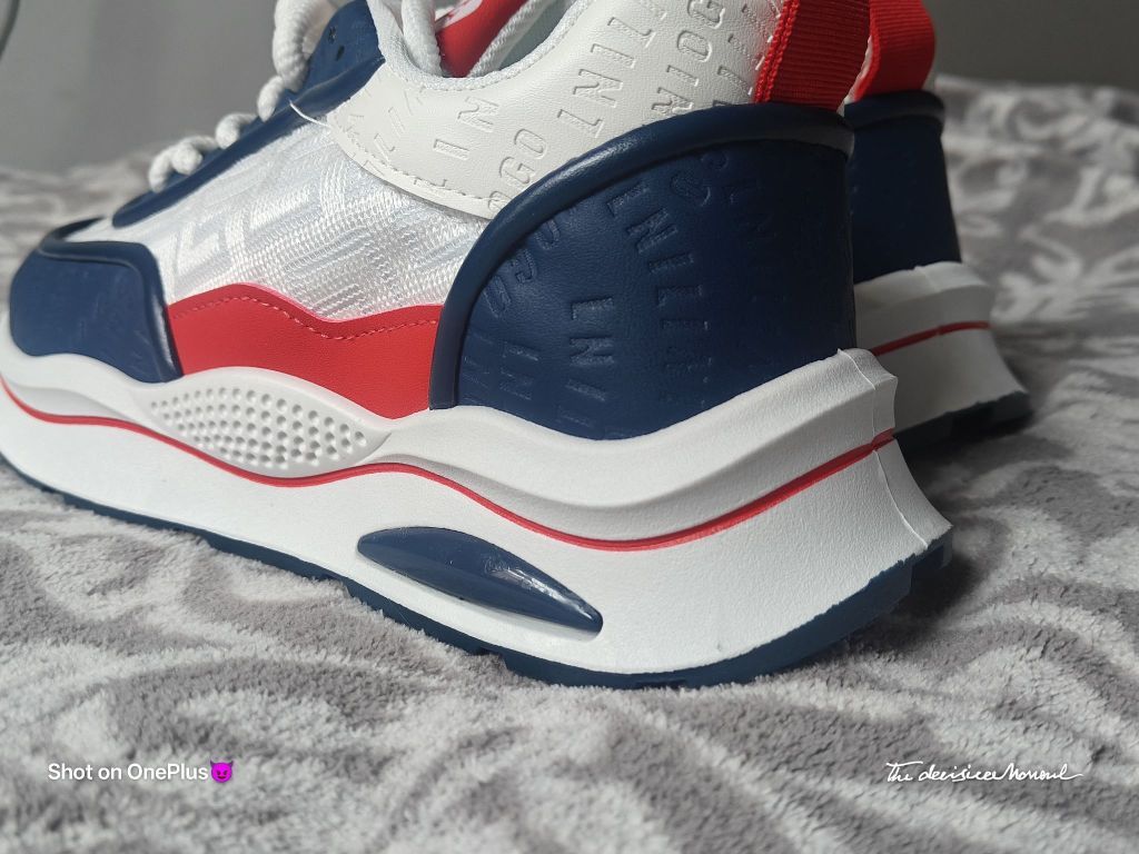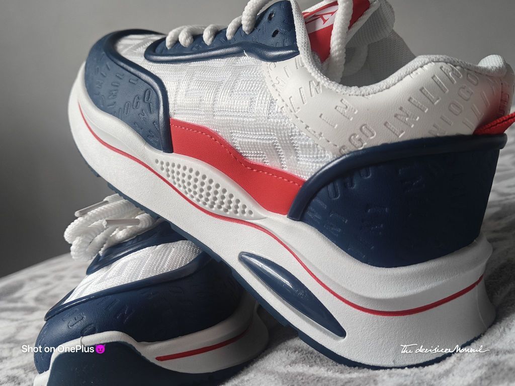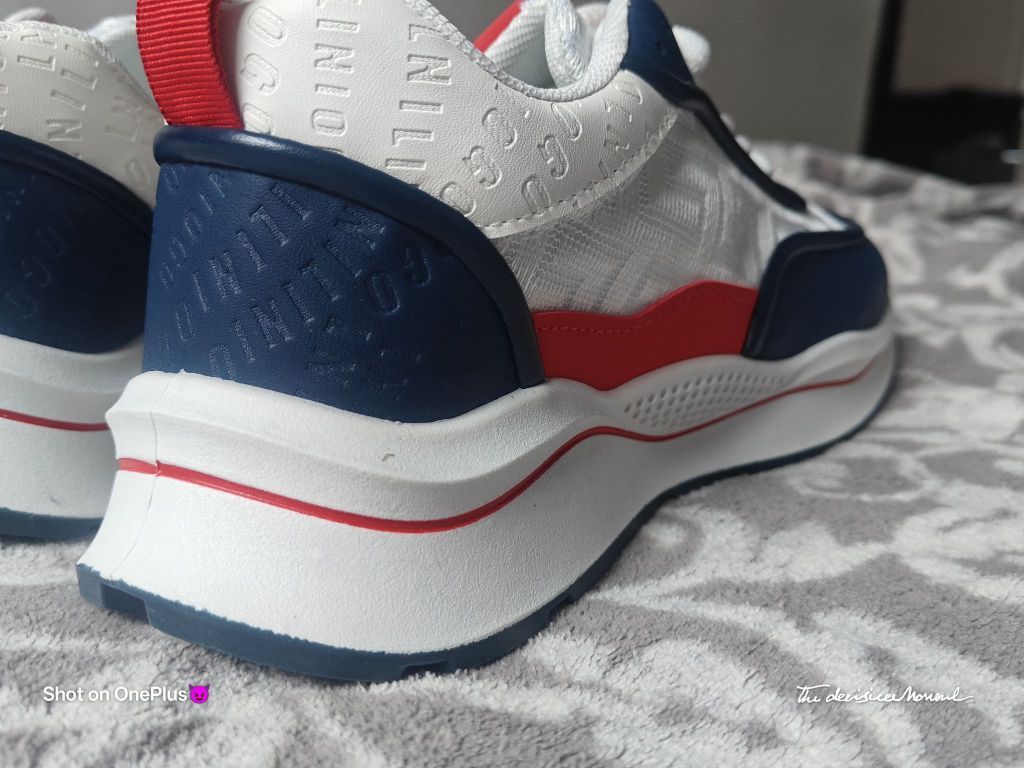 颜值与实用性的平衡,撞色设计的亮眼,细节处理体现的用心。实际脚感如外观设计般舒适,性价比不错的日常休闲鞋选择。 配色与质感 鞋身以白色为主基调,搭配藏青色、红色拼接设计,色彩对比鲜明且协调,兼具活力与复古感。鞋面材质疑似网眼布与皮革拼接,透气孔设计提升实用性,细节处的品牌字母印花增加了设计层次感。 - 整体风格 鞋型偏休闲运动风,厚底设计显高且具有潮流感,鞋带系统简洁易调节,后跟红色拉环方便穿脱,...