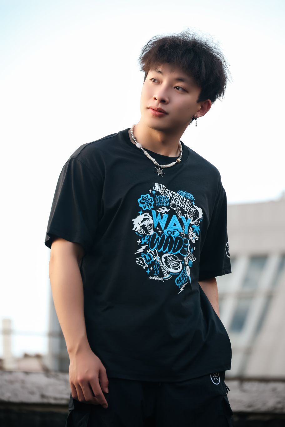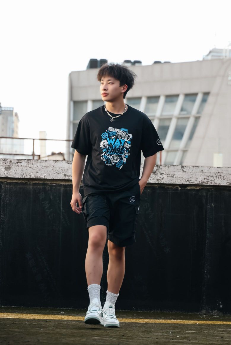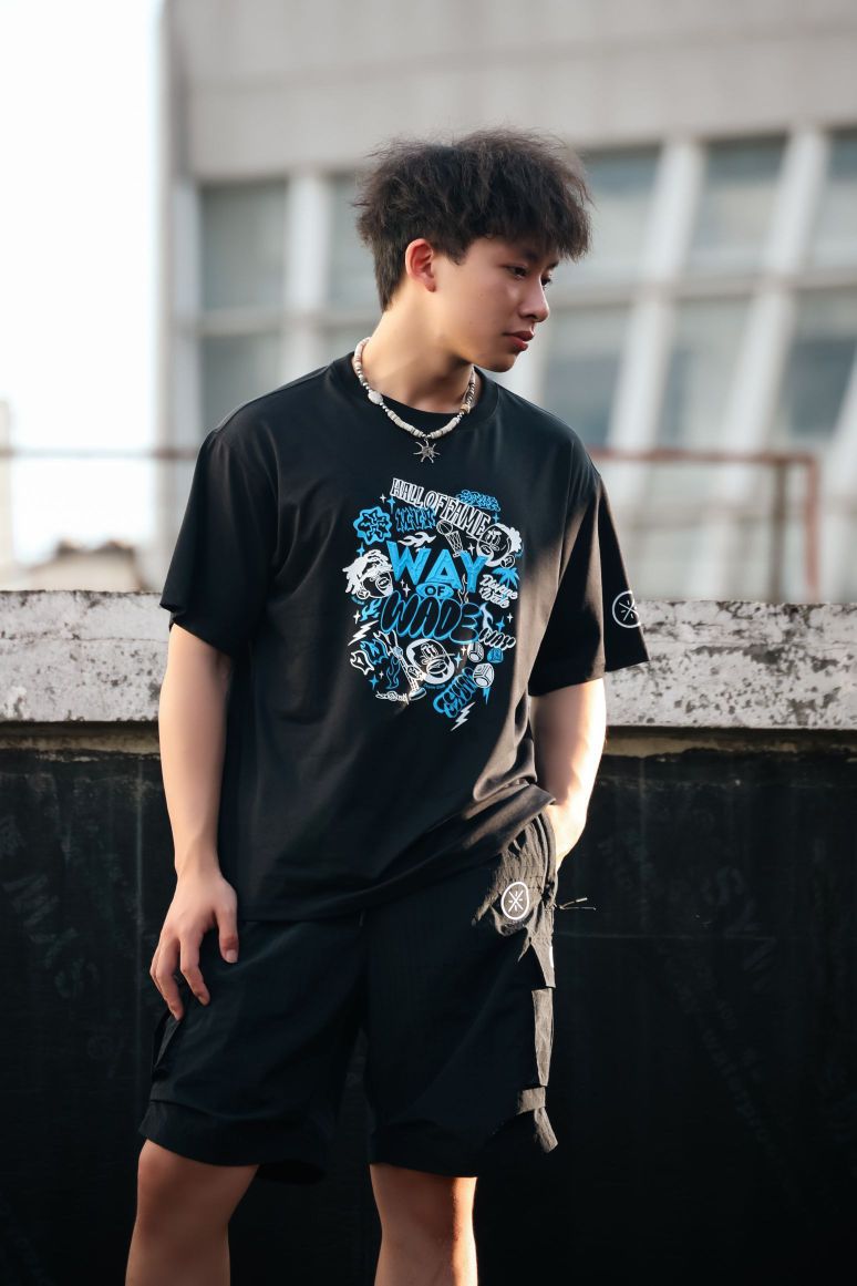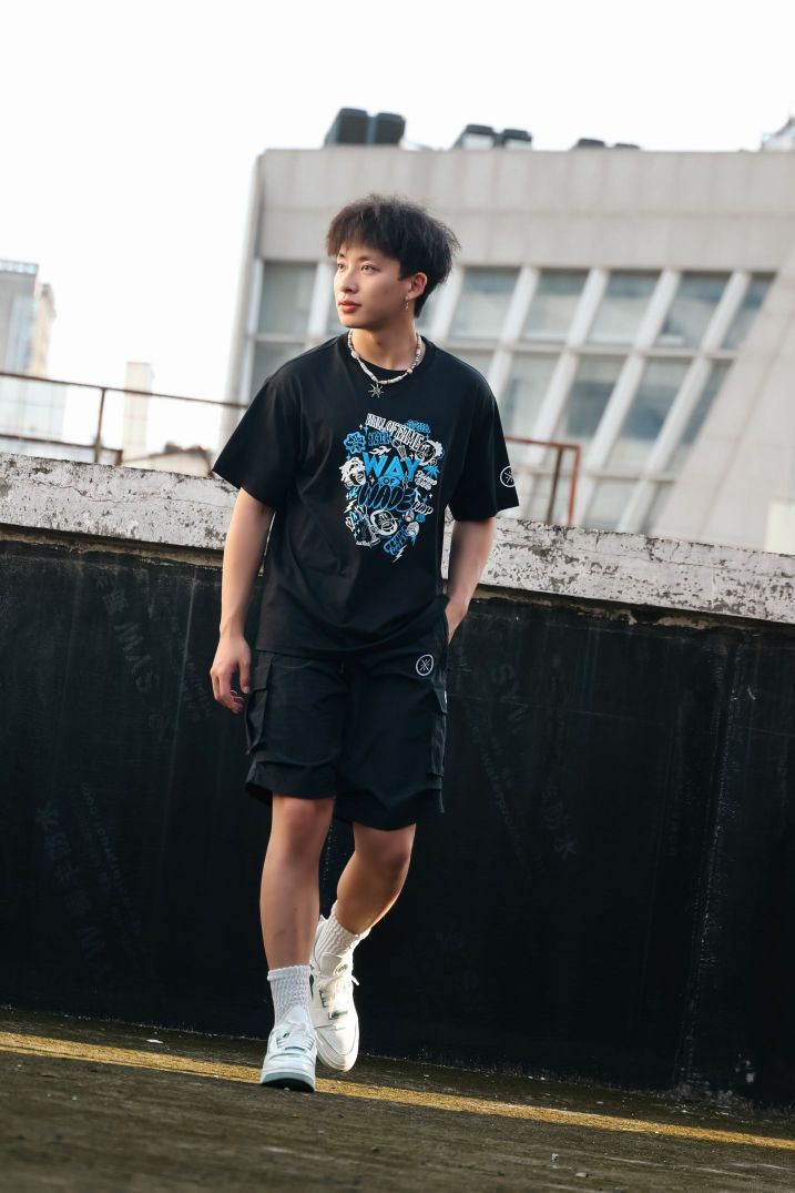 黑色韦德主题短袖 ,图案满是街头涂鸦感🎨 「WAY OF WADE」元素超吸睛,纯棉面料软乎乎又透气,夏天穿完全不闷,同系列黑色工装风下装,口袋设计藏满细节,运动面料耐磨又有弹性,日常出街、打球都能穿🏀 项链一搭、发型支棱,街头酷盖氛围直接拉满✨ 李宁这波把潮流和运动感融合得死死的,谁穿谁帅。