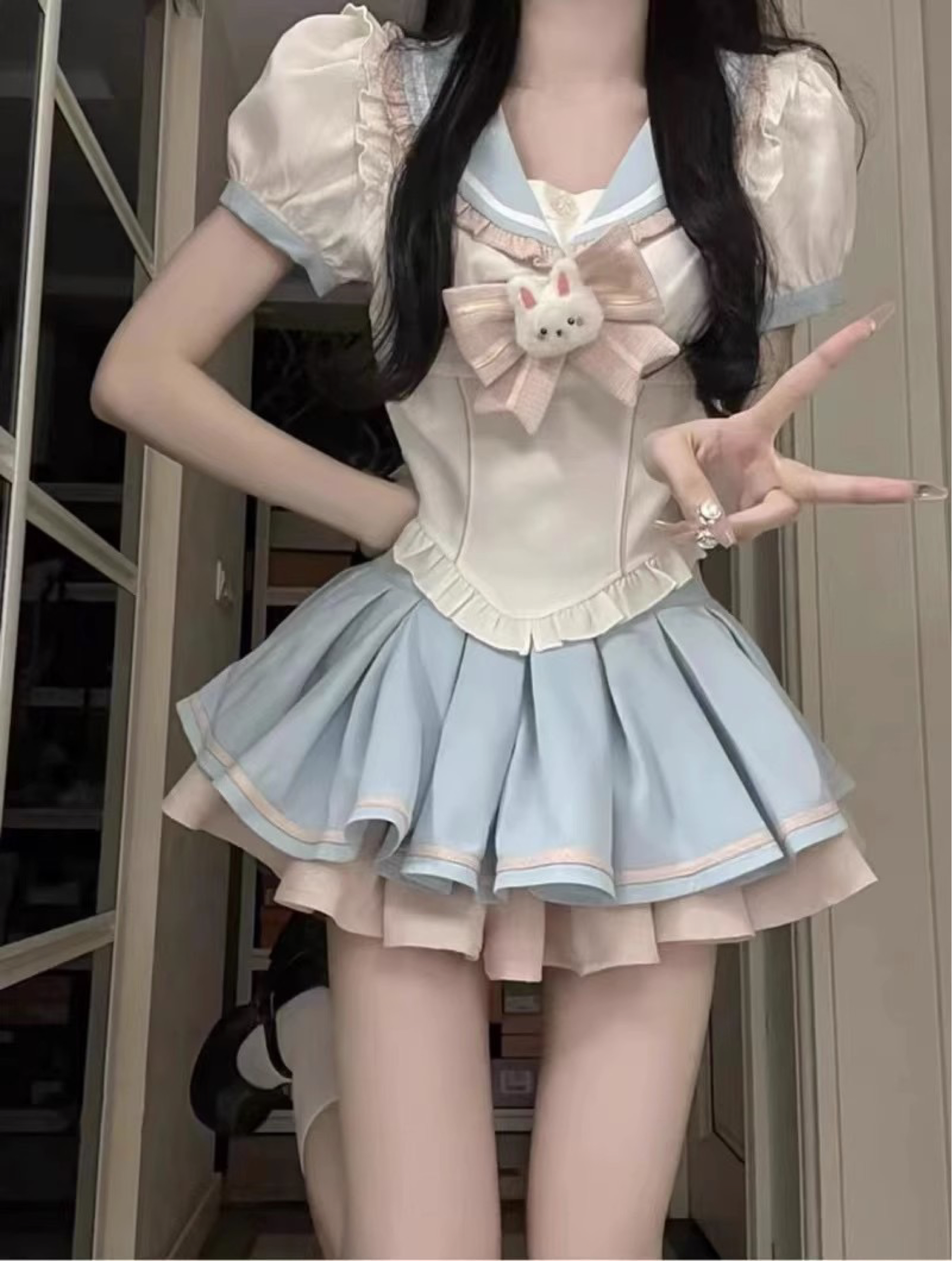 ✨ 蝴蝶结+荷叶边+海军领=甜度超标! 这件衬衣简直是初恋感天花板!立体荷叶边点缀领口,搭配俏皮大蝴蝶结,转身就是漫画女主既视感~蓬蓬高腰短裙一穿,腿长秒变一米八,藏肉显瘦还能偷偷拉长比例,小个子女生也能驾驭的梦幻比例! 🍼 奶白×藏青经典配色 学院风直接拉满 精选抗皱透气面料,春夏穿也清爽不闷汗~百褶裙暗藏防走光内衬,跑跳也不怕,上课约会逛街统统hold住!