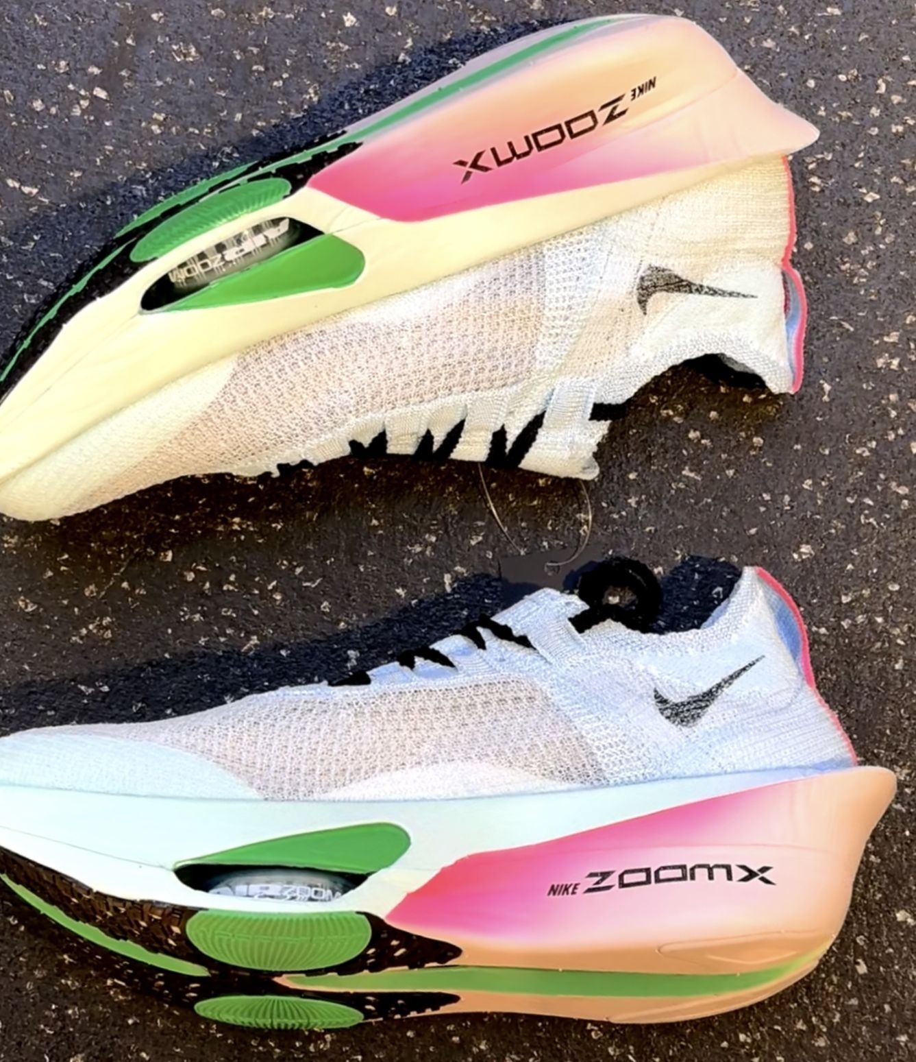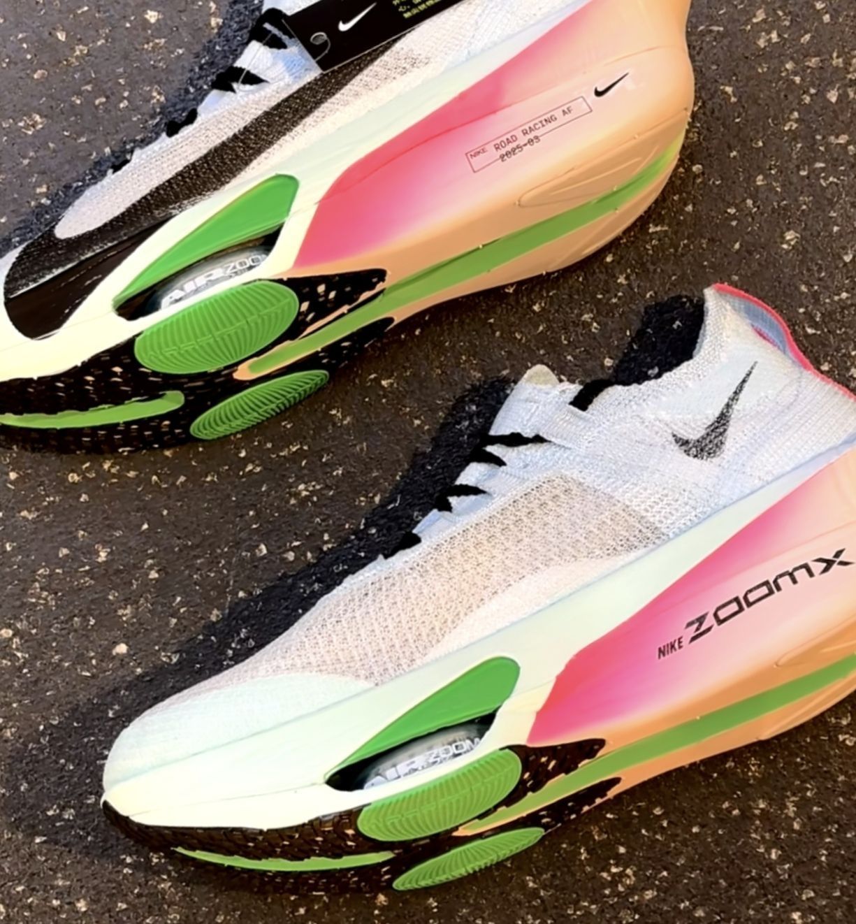 上脚第一感觉:脚感比二代弹得更直接,前掌zoom x踩下去像踩住刚充气的气球,落地时的反馈快到有点出乎意料。 跑起来才知道厉害——推进力比想象中猛,后脚跟落地再转前掌蹬地,那股劲儿像有人在后面推了一把,配速不自觉就提上去了。鞋面比上一代贴脚,出汗也没打滑,就是鞋楦偏窄,宽脚建议试穿。