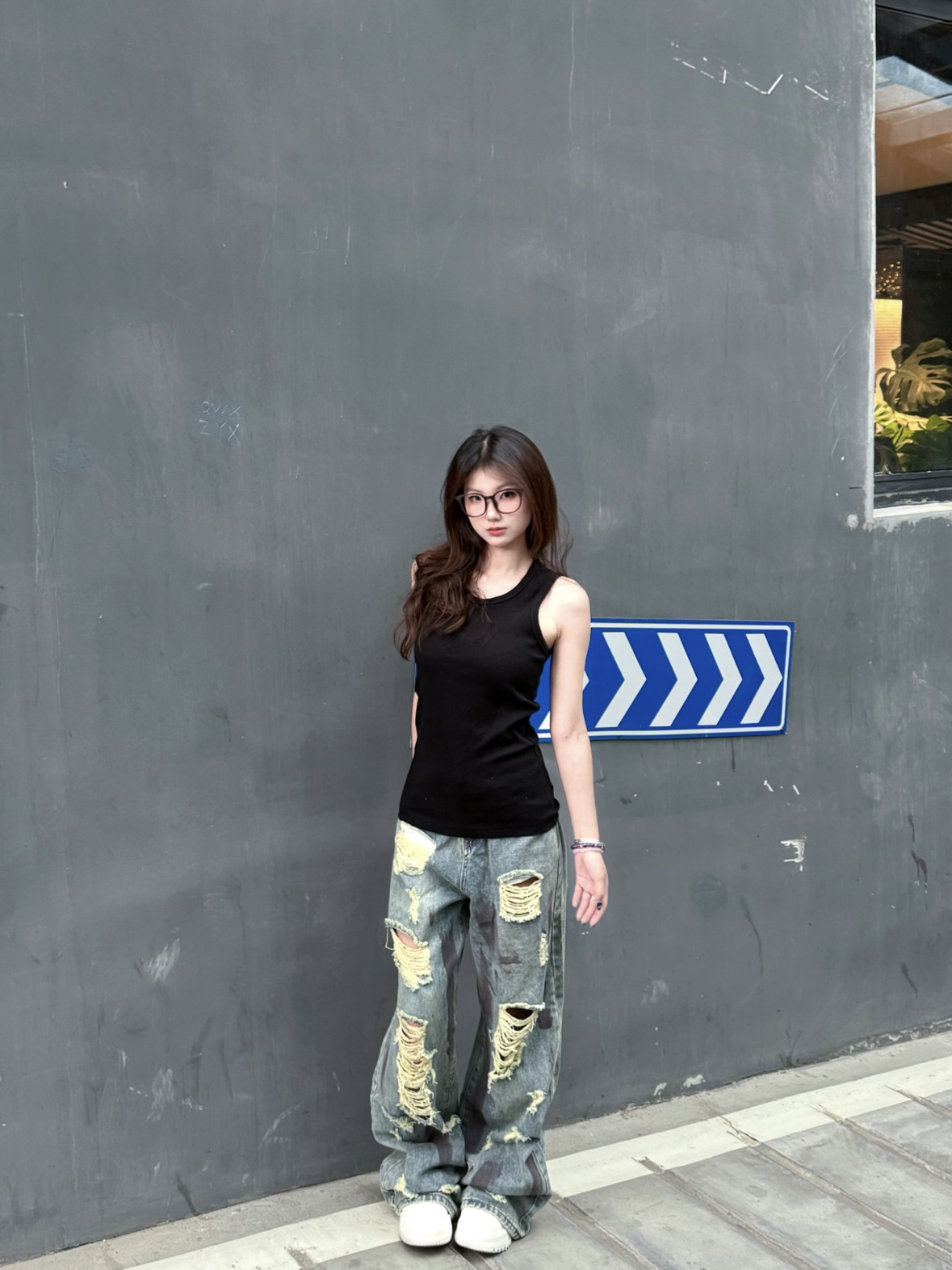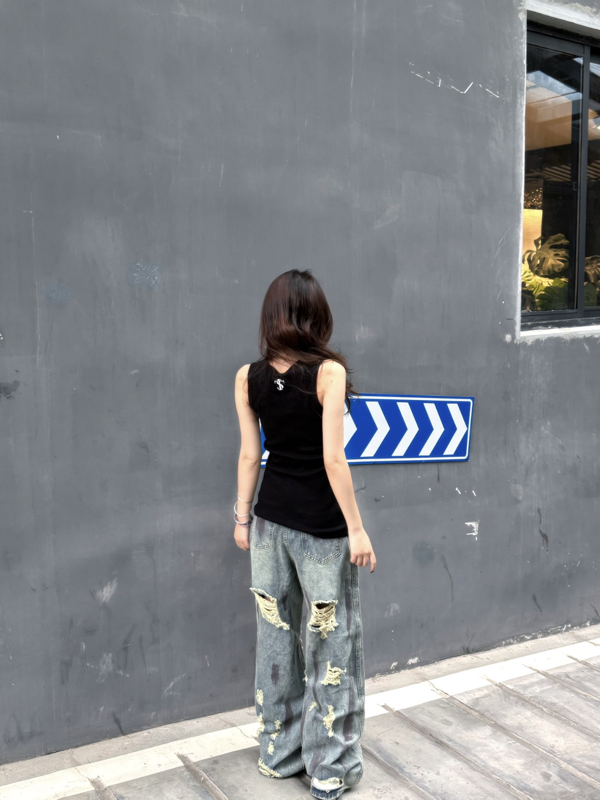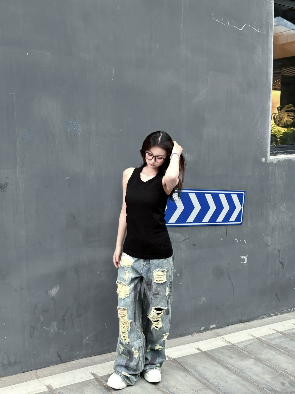👚:STK背心 👖:水洗做旧破洞裤